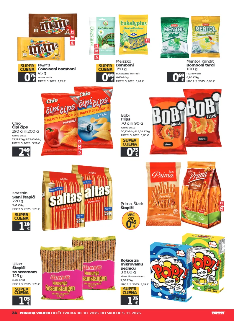 24 ponuda vrijedi od četvrtka 30. 10. 2025. do srijede 5. 11. 2025. m&m’s čokoladni bomboni 45 g razne vrste mpc 2. 5. 2025.: 1,25 € 0 75 super cijena meiszko bomboni 150 g eukaliptus ili limun 6,60 €/kg mpc 2. 5. 2025.: 1,49 € 0 99 super cijena mentol, kandit bomboni tvrdi 100 g razne vrste 6,90 €/kg mpc 2. 5. 2025.: 0,95 € 0 69 prima, štark štapići već od 0 45 kokice za mikrovalnu pećnicu 3 x 80 g slane ili s maslacem 7,30 €/kg mpc 2. 5. 2025.: 2,49 € 1 75 super cijena chio čipi čips 190 g ili 200 g razne vrste 13,11 €/kg ili 12,45 €/kg mpc 2. 5. 2025.: 3,29 € 2 49 bobi flips 70 g ili 90 g razne vrste 10,72 €/kg ili 8,34 €/kg mpc 2. 5. 2025.: 1,05 € 0 75 super cijena koestlin slani štapići 220 g 5,41 €/kg mpc 2. 5. 2025.: 1,75 € 1 19 super cijena ulker štapići sa sezamom 125 g 8,40 €/kg mpc 2. 5. 2025.: 1,75 € 1 05 super cijena