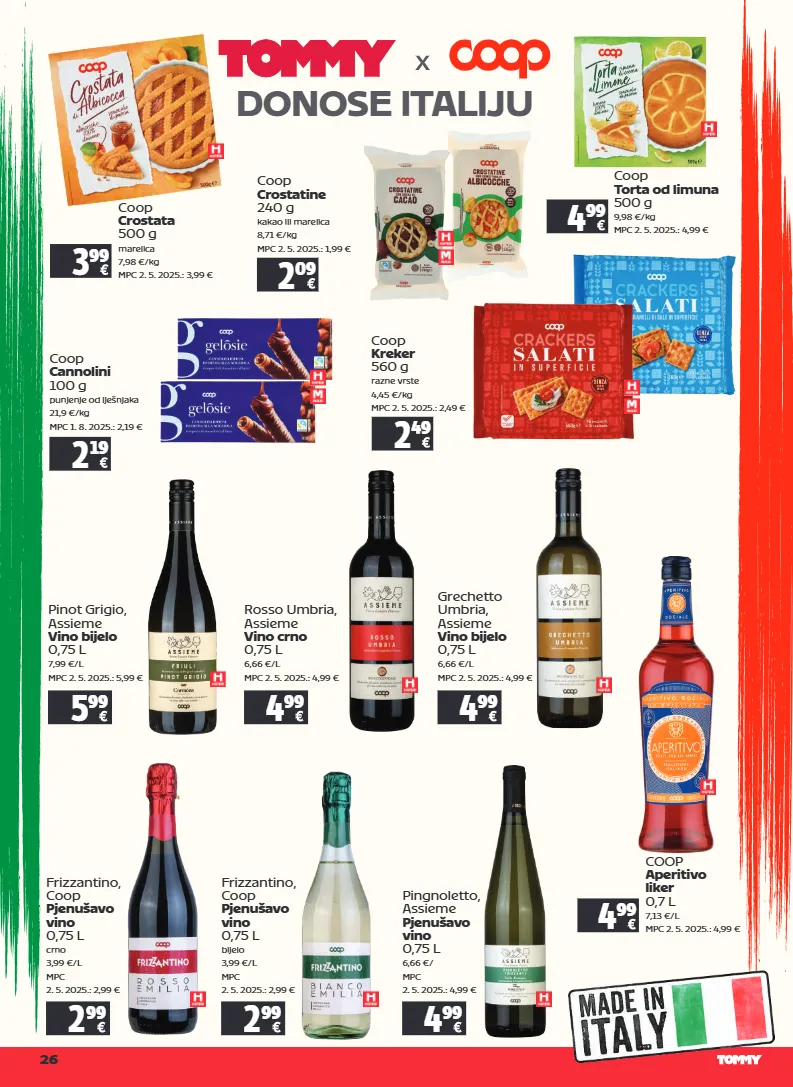26 donose italiju pingnoletto, assieme pjenušavo vino 0,75 l 6,66 €/ mpc 2. 5. 2025.: 4,99 € 4 99 pinot grigio, assieme vino bijelo 0,75 l 7,99 €/l mpc 2. 5. 2025.: 5,99 € 5 99 grechetto umbria, assieme vino bijelo 0,75 l 6,66 €/l mpc 2. 5. 2025.: 4,99 € 4 99 frizzantino, coop pjenušavo vino 0,75 l crno 3,99 €/l mpc 2. 5. 2025.: 2,99 € 2 99 coop crostata 500 g marelica 7,98 €/kg mpc 2. 5. 2025.: 3,99 € 3 99 coop crostatine 240 g kakao ili marelica 8,71 €/kg mpc 2. 5. 2025.: 1,99 € 2 09 coop torta od limuna 500 g 9,98 €/kg mpc 2. 5. 2025.: 4,99 € 4 99 rosso umbria, assieme vino crno 0,75 l 6,66 €/l mpc 2. 5. 2025.: 4,99 € 4 99 coop cannolini 100 g punjenje od lješnjaka 21,9 €/kg mpc 1. 8. 2025.: 2,19 € 2 19 coop kreker 560 g razne vrste 4,45 €/kg mpc 2. 5. 2025.: 2,49 € 2 49 frizzantino, coop pjenušavo vino 0,75 l bijelo 3,99 €/l mpc 2. 5. 2025.: 2,99 € 2 99 coop aperitivo liker 0,7 l 7,13 €/l mpc 2. 5. 2025.: 4,99 € 4 99
