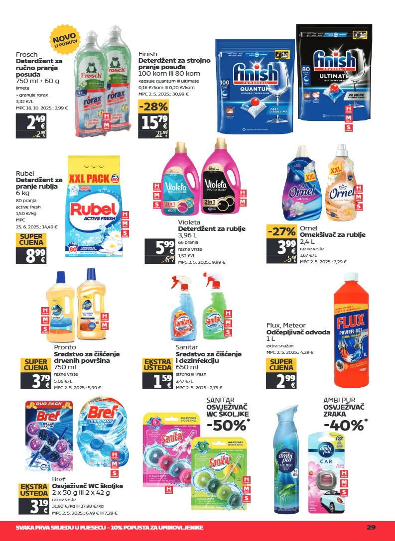 svaka prva srijedu u mjesecu – 10% popusta za umirovljenike 29 3 99 5 49 -27% 5 99 6 99 2 49 2 99 15 79 21 99 -28% frosch deterdžent za ručno pranje posuđa 750 ml + 60 g limeta + granule rorax 3,32 €/l mpc 18. 10. 2025.: 2,99 € finish deterdžent za strojno pranje posuđa 100 kom ili 80 kom kapsule quantum ili ultimate 0,16 €/kom ili 0,20 €/kom mpc 2. 5. 2025.: 30,99 € rubel deterdžent za pranje rublja 6 kg 80 pranja active fresh 1,50 €/kg mpc 25. 6. 2025.: 14,49 € 8 99 super cijena violeta deterdžent za rublje 3,96 l 66 pranja razne vrste 1,52 €/l mpc 2. 5. 2025.: 9,99 € ornel omekšivač za rublje 2,4 l razne vrste 1,67 €/l mpc 2. 5. 2025.: 7,29 € pronto sredstvo za čišćenje drvenih površina 750 ml razne vrste 5,06 €/l mpc 2. 5. 2025.: 5,99 € 3 79 super cijena flux, meteor odčepljivač odvoda 1 l extra snažan mpc 2. 5. 2025.: 4,29 € 2 99 super cijena sanitar sredstvo za čišćenje i dezinfekciju 650 ml strong ili fresh 2,47 €/l mpc 2. 5. 2025.: 2,75 € 1 59 ekstra ušteda bref osvježivač wc školjke 2 x 50 g ili 2 x 42 g razne vrste 31,90 €/kg ili 37,98 €/kg mpc 2. 5. 2025.: 6,49 € ili 7,29 € 3 19 ekstra ušteda sanitar osvježivač wc školjke -50% * ambi pur osvježivač zraka -40% *