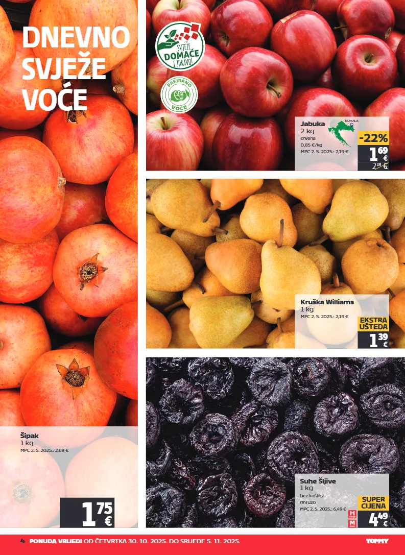 4 ponuda vrijedi od četvrtka 30. 10. 2025. do srijede 5. 11. 2025. dnevno svježe voće šipak 1 kg mpc 2. 5. 2025.: 2,69 € 1 75 jabuka 2 kg crvena 0,85 €/kg mpc 2. 5. 2025.: 2,19 € kruška williams 1 kg mpc 2. 5. 2025.: 2,19 € 1 39 ekstra ušteda suhe šljive 1 kg bez koštica rinfuzo mpc 2. 5. 2025.: 6,49 € 4 49 super cijena 1 69 2 19 € -22% v o e