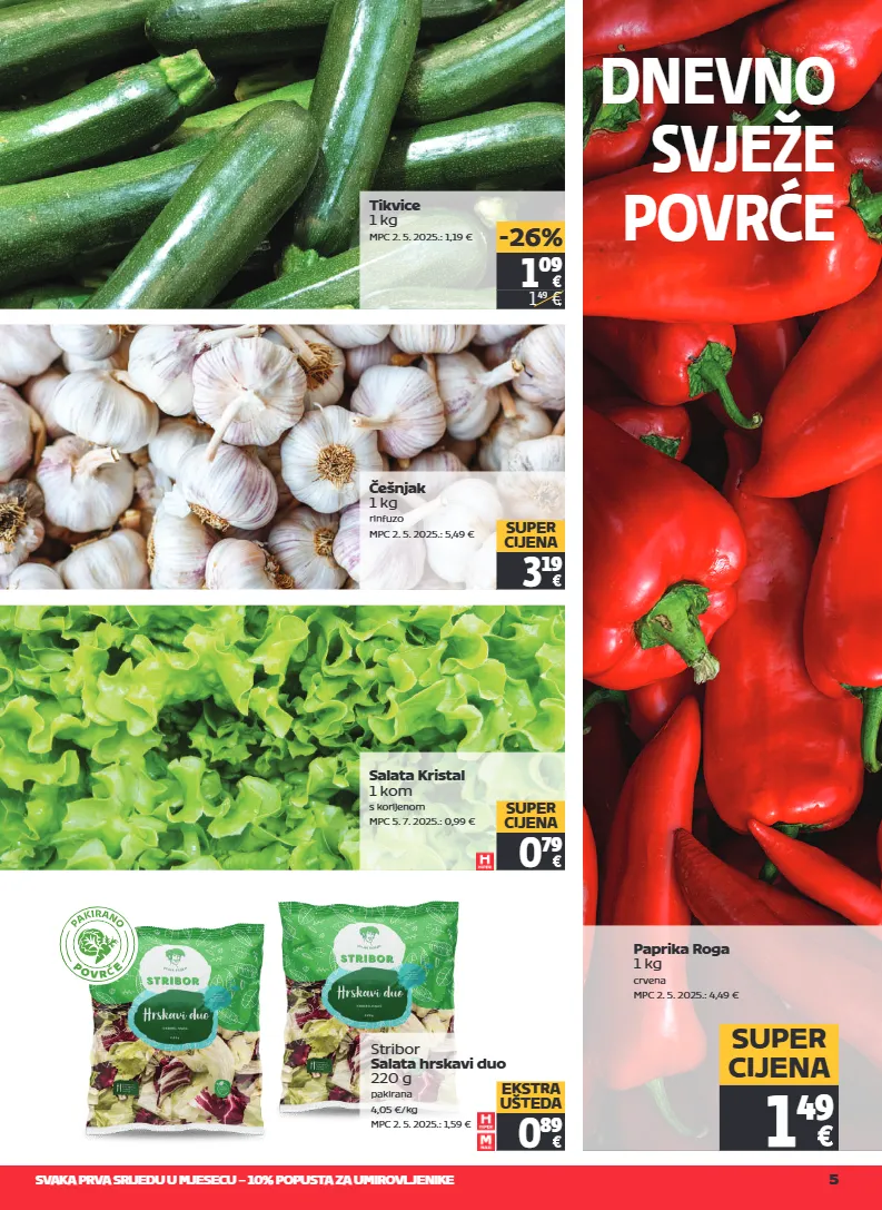 svaka prva srijedu u mjesecu – 10% popusta za umirovljenike 5 dnevno svježe povrće paprika roga 1 kg crvena mpc 2. 5. 2025.: 4,49 € 1 49 super cijena tikvice 1 kg mpc 2. 5. 2025.: 1,19 € češnjak 1 kg rinfuzo mpc 2. 5. 2025.: 5,49 € 3 19 super cijena salata kristal 1 kom s korijenom mpc 5. 7. 2025.: 0,99 € 0 79 super cijena stribor salata hrskavi duo 220 g pakirana 4,05 €/kg mpc 2. 5. 2025.: 1,59 € 0 89 ekstra ušteda 1 09 1 49 € -26% p o v r e