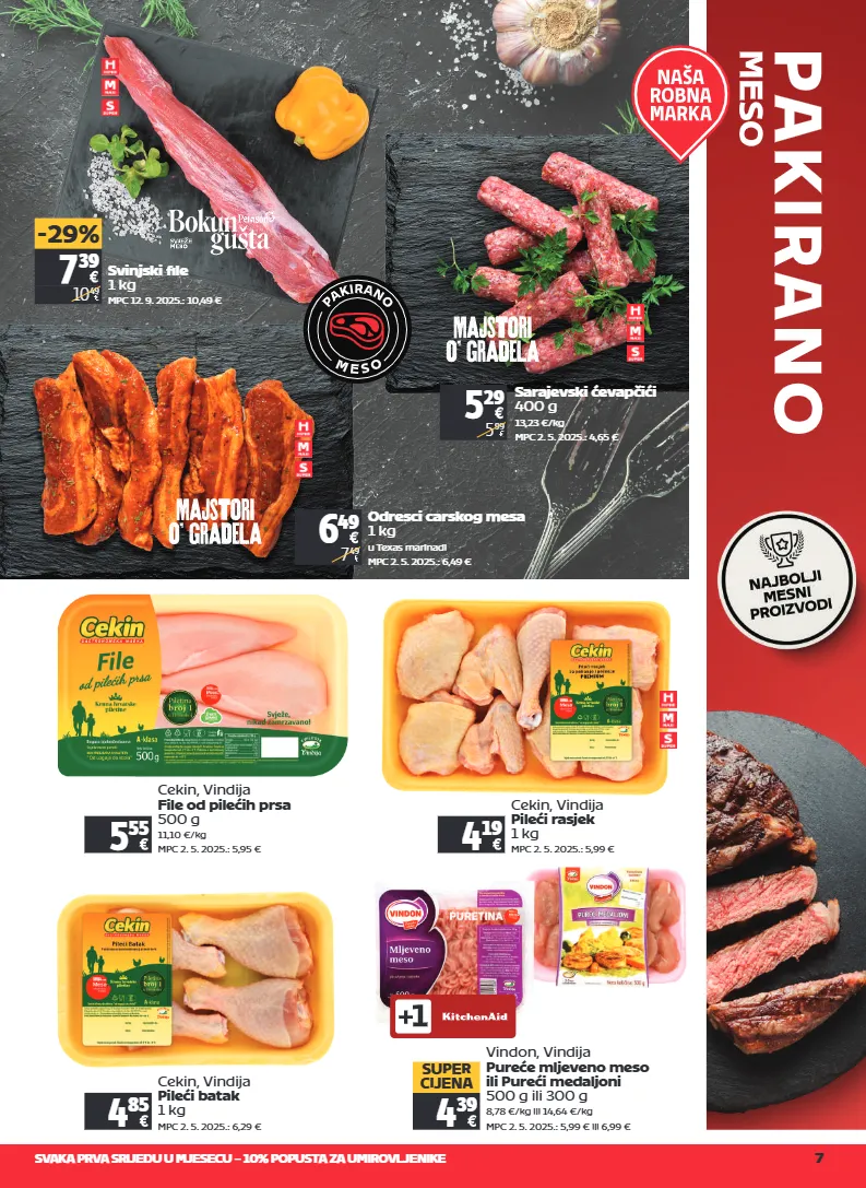 svaka prva srijedu u mjesecu – 10% popusta za umirovljenike 7 7 39 10 49 -29% svinjski file 1 kg mpc 12. 9. 2025.: 10,49 € cekin, vindija file od pilećih prsa 500 g 11,10 €/kg mpc 2. 5. 2025.: 5,95 € 5 55 cekin, vindija pileći rasjek 1 kg mpc 2. 5. 2025.: 5,99 € 4 19 cekin, vindija pileći batak 1 kg mpc 2. 5. 2025.: 6,29 € 4 85 vindon, vindija pureće mljeveno meso ili pureći medaljoni 500 g ili 300 g 8,78 €/kg ili 14,64 €/kg mpc 2. 5. 2025.: 5,99 € ili 6,99 € 4 39 super cijena 6 49 7 49 odresci carskog mesa 1 kg u texas marinadi mpc 2. 5. 2025.: 6,49 € 5 29 5 99 sarajevski ćevapčići 400 g 13,23 €/kg mpc 2. 5. 2025.: 4,65 €