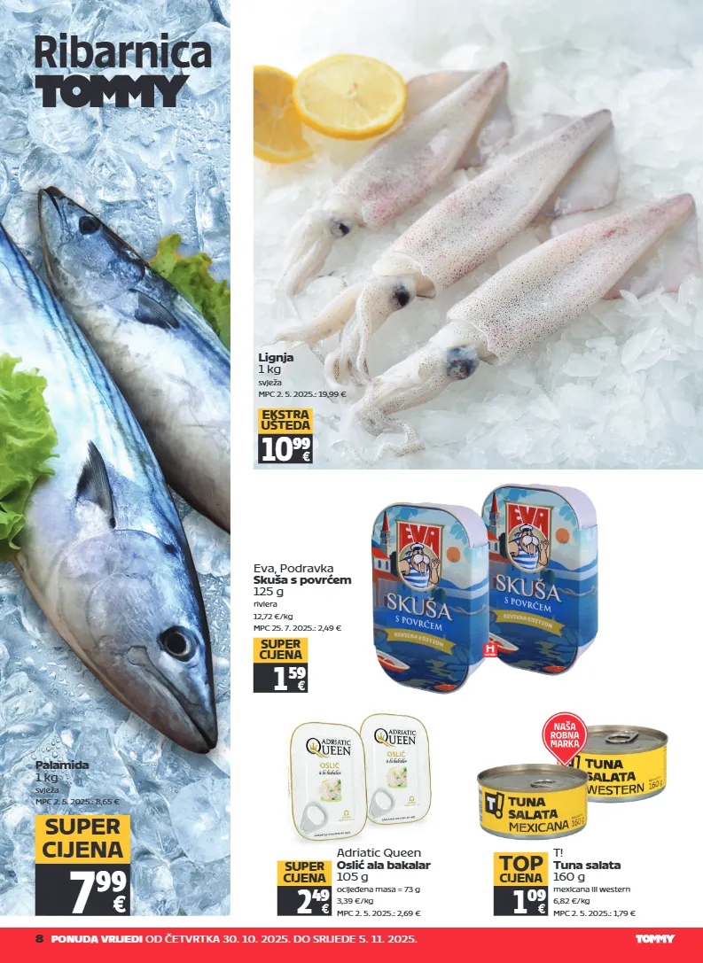 8 ponuda vrijedi od četvrtka 30. 10. 2025. do srijede 5. 11. 2025. ribarnica eva, podravka skuša s povrćem 125 g riviera 12,72 €/kg mpc 25. 7. 2025.: 2,49 € 1 59 super cijena 2 49 super cijena t! tuna salata 160 g mexicana ili western 6,82 €/kg mpc 2. 5. 2025.: 1,79 € adriatic queen oslić ala bakalar 105 g ocijeđena masa = 73 g 3,39 €/kg mpc 2. 5. 2025.: 2,69 € 1 09 top cijena lignja 1 kg svježa mpc 2. 5. 2025.: 19,99 € 10 99 ekstra ušteda palamida 1 kg svježa mpc 2. 5. 2025.: 8,65 € 7 99 super cijena