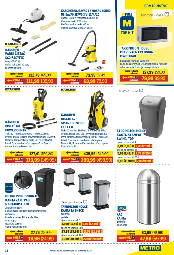 top hit  moj  cijena redovna  za komad   127,99   159,99  cijena   moj  za komad   79,99   99,99  13 ponuda od 16 lipnja do 30. lipnja 2025.   ponuda od 03. studenog do 16. studenog 2025.  cijena redovna  za komad   132,79   165,99  cijena   moj  za komad   111,99   139,99  cijena redovna  za komad   73,99   92,49  cijena   moj  za komad   63,99   79,99  kärcher parni čistač sc2 easyfix  snaga: 1500 w, maks. tlak pare: 3,2 bar, zapremina kotla: 1 l  cijena redovna  za komad   127,41   (159,26)  cijena   moj  za komad   119,99   (149,99)  cijena redovna  za komad   27,75   (34,69)  cijena   moj  za komad   19,99   (24,99)  cijena redovna  za komad   63,99   (79,99)  cijena   moj  za komad   47,99   (59,99)  kärcher čistač k3 power contr.  tlak: 20 - maks. 120 bar/2 - maks. 12 mpa, protok: maks. 380 l/h, površinski učinak: 25 m²/h, dolazna temperatura: maks. 40 °c, priključni kabel: 5 m, visokotlačno crijevo: 7 m, quick connect, vario power jet  cijena redovna  za komad   439,99   (549,99)  cijena   moj  za komad   399,99   (499,99)  kärcher čistač k7 smart control flex eu  tlak: 20 - maks. 180 bar / 2 - maks. 18 mpa, protok: maks. 600 l/h, površinski učinak: 60 m²/h, dolazna temperatura: 60 °c, priključni kabel: 5 m, motor s vodenim hlađenjem, bluetooth, premiumflex visokotlačna crijeva zapremina: 34 l  tarrington house kanta za smeće swing-top  cijena za komad, 9 l  3,19 (3,99) €, 2,39 (2,99) €  cijena za komad, 25 l  5,99 (7,49) €, 4,79 (5,99) €  cijena za komad, 50 l  9,59 (11,99) €, 7,99 (9,99) €  metro professional kanta za otpad s kotačima, 110 l  zapremine 110 l, s poklopcem i ergonomski oblikovanim ručkama, izrađena od reciklirane plastike, crne boje, izuzetno čvrsta, visina kante 880 mm  tarrington house kanta za smeće  srebrna, pedala cijena za komad, 6 l  13,99 (17,49) €, 9,99 (12,49) €  cijena za komad, 20 l  23,99 (29,99) €, 17,59 (21,99) €  cijena za komad, 40 l  31,99 (39,99) €, 23,99 (29,99) €  aro kanta  50 (40)l, push, inox  kärcher usisavač za mokro i suho usisavanje wd 3 v-17/4/20  snaga: 1000 w, volumen posude: 17 l vakuum: maks. 230 mbar količina zraka: maks. 45 l/s razina zvučnog tlaka: 74 db(a)  tarrington house mikrovalna pećnica mwd1134g  digitalna kontrola s gumbom na dodir, zapremina: 34l grill funkcija, funkcija odmrzavanja, funkcija brzog kuhanja  domaćinstvo