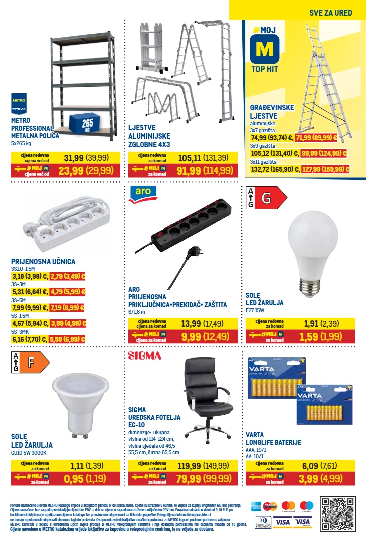 top hit  moj  ponude naznačene u ovom metro katalogu vrijede u akcijskom periodu ili do isteka zaliha. cijene su izražene u eurima, te vrijede za kupnju originalnih metro pakiranja. cijene naznačene bez zagrada predstavljaju cijene bez pdv-a, dok su cijene u zagradama izražene s uključenim pdv-om. povratna naknada u visini od 0,10 eur po boci/limenci uključena je u prikazane cijene u katalogu. ne preuzimamo odgovornost za tiskarske pogreške. fotografije su informativnog karaktera i ne moraju u potpunosti odgovarati stvarnom izgledu proizvoda. ova ponuda vrijedi isključivo u našim trgovinama, za metro kupce i poslovne partnere s valjanom metro karticom u skladu s odredbama općih uvjeta prodaje u metro veleprodajnim centrima i nije dostupna potrošačima niti osobama mlađim od 18 godina.  cijene navedene u metro katalozima vrijede isključivo za kupovinu u veleprodajnim centrima, te ne vrijede za dostavu.  građevinske ljestve  aluminijske 3x7 gazišta  74,99 (93,74) €, 71,99 (89,99) €  3x9 gazišta  105,12 (131,40) €, 99,99 (124,99) €  3x11 gazišta  132,72 (165,90) €, 127,99 (159,99) €  ljestve aluminijske zglobne 4x3  cijena redovna  za komad   105,11   (131,39)  cijena   moj  za komad   91,99   (114,99)  265 kg sve za ured  sve za ured  cijena redovna  cijena već od   31,99   (39,99)  cijena   moj  cijena već od   23,99   (29,99)  cijena redovna  cijena za komad   13,99   (17,49)  cijena   moj  cijena za komad   9,99   (12,49)  metro professional metalna polica  5x265 kg  aro priijenosna priključnica+prekidač+ zaštita  6/1,8 m  prijenosna učnica  3s1.0-1.5m  3,18 (3,98) €, 2,79 (3,49) €  3s-3m  5,31 (6,64) €, 4,79 (5,99) €  3s-5m  7,99 (9,99) €, 7,19 (8,99) €  5s-1.5m  4,67 (5,84) €, 3,99 (4,99) €  5s-3mk  6,16 (7,70) €, 5,59 (6,99) €  cijena redovna  za komad   1,91   (2,39)  cijena   moj  za komad   1,59   (1,99) g a g  sole led žarulja  e27 15w f a g  cijena redovna  za komad   1,11   (1,39)  cijena   moj  za komad   0,95   (1,19)  cijena redovna  za komad   119,99   (149,99)  cijena   moj  za komad   79,99   (99,99)  cijena redovna  za komad   6,09   (7,61)  cijena   moj  za komad   3,99   (4,99)  sole led žarulja  gu10 5w 3000k  sigma uredska fotelja ec-10  dimenzije: ukupna visina od 114-124 cm, visina sjedala od 46,5 - 55,5 cm, širina 65,5 cm  varta longlife baterije  aaa, 10/1 aa, 10/1