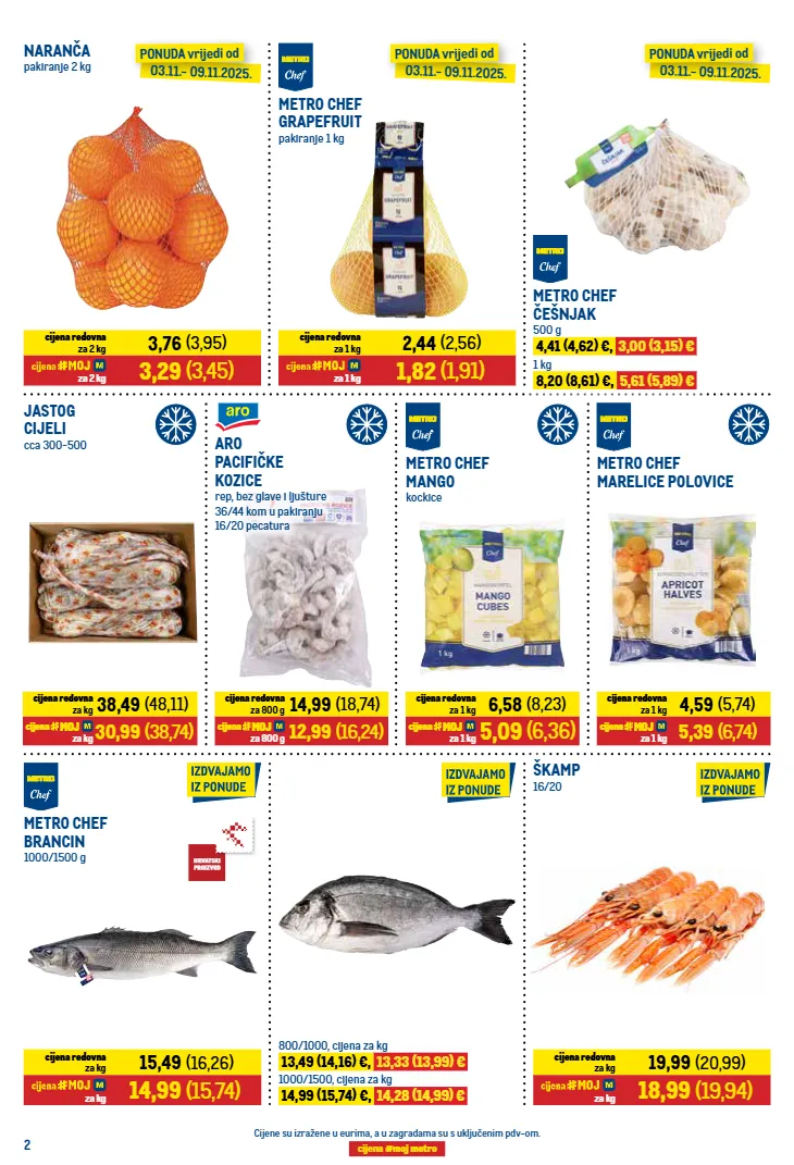 2   cijene su izražene u eurima, a u zagradama su s uključenim pdv-om.  cijena # moj metro  metro chef mango  kockice  metro chef grapefruit  pakiranje 1 kg  aro pacifičke kozice  rep, bez glave i ljušture 36/44 kom u pakiranju 16/20 pecatura  jastog cijeli  cca 300-500  metro chef marelice polovice  metro chef češnjak  500 g  4,41 (4,62) €, 3,00 (3,15) €  1 kg  8,20 (8,61) €, 5,61 (5,89) €  naranča  pakiranje 2 kg  metro chef brancin  1000/1500 g  škamp  16/20  cijena redovna  za 2 kg   3,76   (3,95)  za 2 kg   3,29   (3,45)  cijena redovna  za 1 kg   2,44   (2,56)  za 1 kg   1,82   (1,91)  cijena redovna  za 800 g   14,99   (18,74)  cijena   moj  za 800 g   12,99   (16,24)  cijena redovna  za kg   38,49   (48,11)  cijena   moj  za kg   30,99   (38,74)  cijena redovna  za 1 kg   6,58   (8,23)  cijena   moj  za 1 kg   5,09   (6,36)  cijena redovna  za 1 kg   4,59   (5,74)  cijena   moj  za 1 kg   5,39   (6,74)  ponuda vrijedi od 03.11.- 09.11.2025.   ponuda vrijedi od 03.11.- 09.11.2025.   ponuda vrijedi od 03.11.- 09.11.2025.  hrvatski proizvod hrvatski proizvod  cijena redovna  za kg   15,49   (16,26)  za kg   14,99   (15,74)  800/1000, cijena za kg  13,49 (14,16) €, 13,33 (13,99) €  1000/1500, cijena za kg  14,99 (15,74) €, 14,28 (14,99) €  cijena redovna  za kg   19,99   (20,99)  za kg   18,99   (19,94)