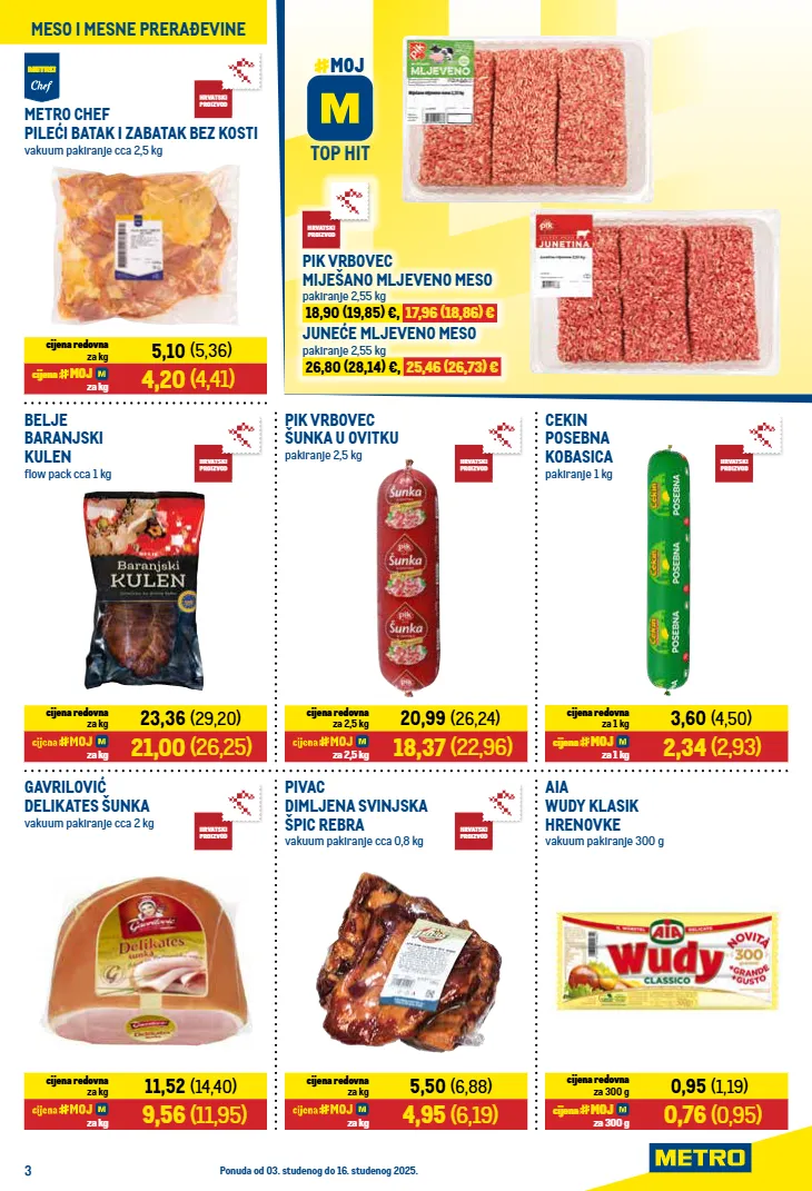 3 ponuda od 03. studenog do 16. studenog 2025.  aia wudy klasik hrenovke  vakuum pakiranje 300 g  pivac dimljena svinjska špic rebra  vakuum pakiranje cca 0,8 kg  gavrilović delikates šunka  vakuum pakiranje cca 2 kg  cekin posebna kobasica  pakiranje 1 kg  hrvatski proizvod hrvatski proizvod  pik vrbovec miješano mljeveno meso  pakiranje 2,55 kg  18,90 (19,85) €, 17,96 (18,86) € juneće mljeveno meso  pakiranje 2,55 kg  26,80 (28,14) €, 25,46 (26,73) €  metro chef pileći batak i zabatak bez kosti  vakuum pakiranje cca 2,5 kg  hrvatski proizvod hrvatski proizvod  belje baranjski kulen  flow pack cca 1 kg  pik vrbovec šunka u ovitku  pakiranje 2,5 kg top hit  moj  cijena redovna  za 300 g   0,95   (1,19)  cijena   moj  za 300 g   0,76   (0,95)  cijena redovna  za kg   5,50   (6,88)  za kg   4,95   (6,19)  cijena redovna  za kg   11,52   (14,40)  za kg   9,56   (11,95)  cijena redovna  za 1 kg   3,60   (4,50)  cijena   moj  za 1 kg   2,34   (2,93)  cijena redovna  za 2,5 kg   20,99   (26,24)  za 2,5 kg   18,37   (22,96)  cijena redovna  za kg   23,36   (29,20)  za kg   21,00   (26,25)  cijena redovna  za kg   5,10   (5,36)  cijena   moj  za kg   4,20   (4,41)  meso i mesne prerađevine  hrvatski proizvod hrvatski proizvod  hrvatski proizvod hrvatski proizvod  hrvatski proizvod hrvatski proizvod  hrvatski proizvod hrvatski proizvod  hrvatski proizvod hrvatski proizvod