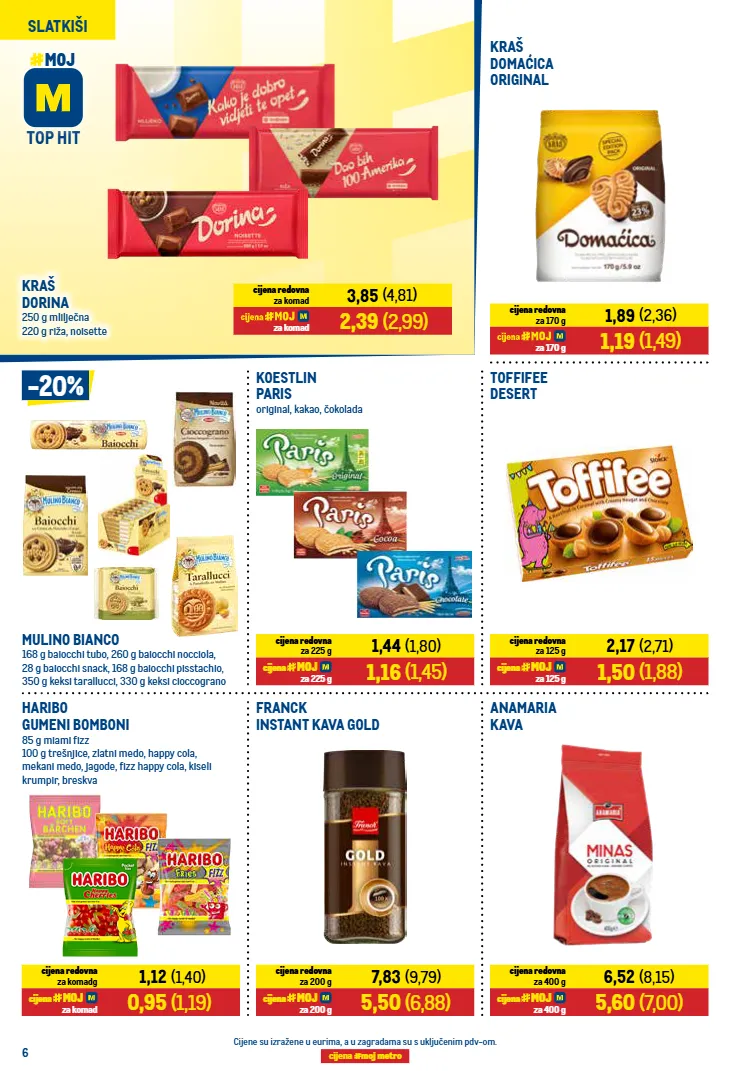 6 cijene su izraene u eurima, a u zagradama su s ukljuenim pdv-om.  cijena # moj metro  koestlin paris  original, kakao, čokolada  kraš dorina  250 g mlilječna 220 g riža, noisette  kraš domaćica original  franck instant kava gold  anamaria kava  mulino bianco  168 g baiocchi tubo, 260 g baiocchi nocciola, 28 g baiocchi snack, 168 g baiocchi pisstachio, 350 g keksi tarallucci, 330 g keksi cioccograno  toffifee desert -20% top hit  moj  cijena redovna  za komad   3,85   (4,81)  za komad   2,39   (2,99)  cijena redovna  za 225 g   1,44   (1,80)  cijena   moj  za 225 g   1,16   (1,45)  cijena redovna  za 125 g   2,17   (2,71)  cijena   moj  za 125 g   1,50   (1,88)  cijena redovna  za 400 g   6,52   (8,15)  cijena   moj  za 400 g   5,60   (7,00)  cijena redovna  za 200 g   7,83   (9,79)  cijena   moj  za 200 g   5,50   (6,88)  cijena redovna  za komadg   1,12   (1,40)  cijena   moj  za komad   0,95   (1,19)  cijena redovna  za 170 g   1,89   (2,36)  za 170 g   1,19   (1,49)  slatkiši  haribo gumeni bomboni  85 g miami fizz 100 g trešnjice, zlatni medo, happy cola, mekani medo, jagode, fizz happy cola, kiseli krumpir, breskva