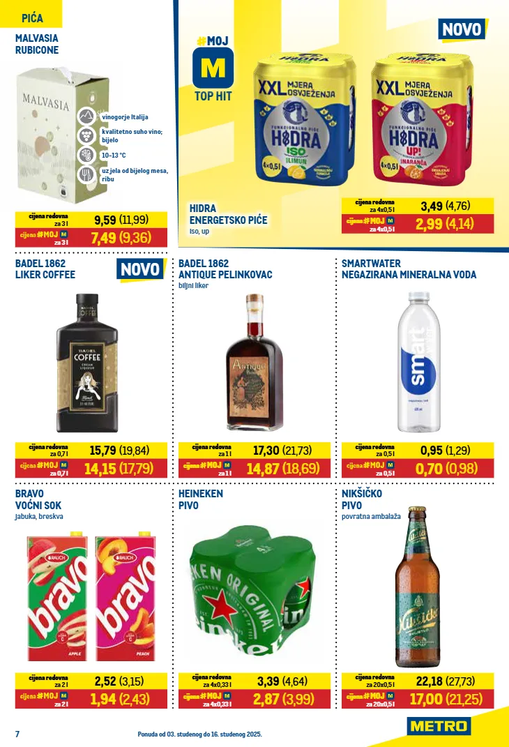 7 ponuda od 03. studenog do 16. studenog 2025.  vinogorje italija kvalitetno suho vino; bijelo 10-13 °c uz jela od bijelog mesa, ribu  nikšičko pivo  povratna ambalaža  heineken pivo  hidra energetsko piće  iso, up  badel 1862 antique pelinkovac  biljni liker  malvasia rubicone  badel 1862 liker coffee  bravo voćni sok  jabuka, breskva  smartwater negazirana mineralna voda top hit  moj  cijena redovna  za 20x0,5 l   22,18   (27,73)  cijena   moj  za 20x0,5 l   17,00   (21,25)  cijena redovna  za 4x0,33 l   3,39   (4,64)  cijena   moj  za 4x0,33 l   2,87   (3,99)  cijena redovna  za 1 l   17,30   (21,73)  cijena   moj  za 1 l   14,87   (18,69)  cijena redovna  za 4x0,5 l   3,49   (4,76)  cijena   moj  za 4x0,5 l   2,99   (4,14)  cijena redovna  za 2 l   2,52   (3,15)  za 2 l   1,94   (2,43)  cijena redovna  za 3 l   9,59   (11,99)  za 3 l   7,49   (9,36)  cijena redovna  za 0,7 l   15,79   (19,84)  za 0,7 l   14,15   (17,79)  pića  cijena redovna  za 0,5 l   0,95   (1,29)  za 0,5 l   0,70   (0,98)  novo  novo