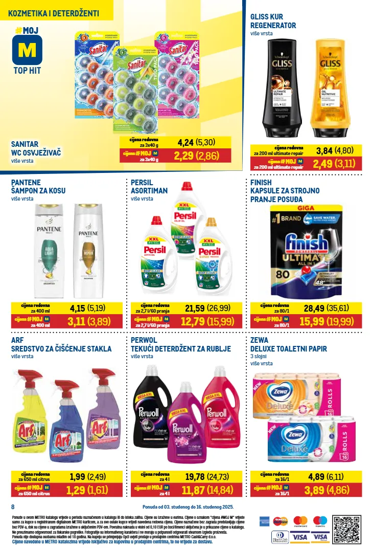 ponuda od 03. studenog do 16. studenog 2025. 8  top hit  moj  ponude u ovom metro katalogu vrijede u periodu naznačenom u katalogu ili do isteka zaliha. cijene su izražene u eurima. cijene s oznakom “cijena #moj m“ vrijede samo za kupce s registriranom digitalnom metro karticom, a za sve ostale kupce vrijedi navedena redovna cijena. cijene naznačene bez zagrada predstavljaju cijene bez pdv-a, dok su cijene u zagradama izražene s uključenim pdv-om. povratna naknada u visini od 0,10 eur po boci/limenci uključena je u prikazane cijene u katalogu. ne preuzimamo odgovornost za tiskarske pogreške. fotografije su informativnog karaktera i ne moraju u potpunosti odgovarati stvarnom izgledu proizvoda. ponuda nije dostupna osobama mlađim od 18 godina. na kupnju se primjenjuju opći uvjeti prodaje u prodajnim centrima metro cash&carry d.o.o.  cijene navedene u metro katalozima vrijede isključivo za kupovinu u prodajnim centrima, te ne vrijede za dostavu.  gliss kur regenerator  više vrsta  finish kapsule za strojno pranje posuđa  zewa deluxe toaletni papir  3 slojni više vrsta  perwol tekući deterdžent za rublje  više vrsta  arf sredstvo za čišćenje stakla  više vrsta  persil asortiman  više vrsta  pantene šampon za kosu  više vrsta  sanitar wc osvježivač  više vrsta  kozmetika i deterdženti  cijena redovna  za 3x40 g   4,24   (5,30)  cijena   moj  za 3x40 g   2,29   (2,86)   cijena redovna  za 200 ml ultimate repair   3,84   (4,80)  cijena   moj  za 200 ml ultimate repair   2,49   (3,11)  cijena redovna  za 80/1   28,49   (35,61)  cijena   moj  za 80/1   15,99   (19,99)  cijena redovna  za 16/1   4,89   (6,11)  cijena   moj  za 16/1   3,89   (4,86)  cijena redovna  za 2,7 l/60 pranja   21,59   (26,99)  cijena   moj  za 2,7 l/60 pranja   12,79   (15,99)  cijena redovna  za 4 l   19,78   (24,73)  cijena   moj  za 4 l   11,87   (14,84)  cijena redovna  za 400 ml   4,15   (5,19)  cijena   moj  za 400 ml   3,11   (3,89)  cijena redovna  za 650 ml citrus   1,99   (2,49)  cijena   moj  za 650 ml citrus   1,29   (1,61)
