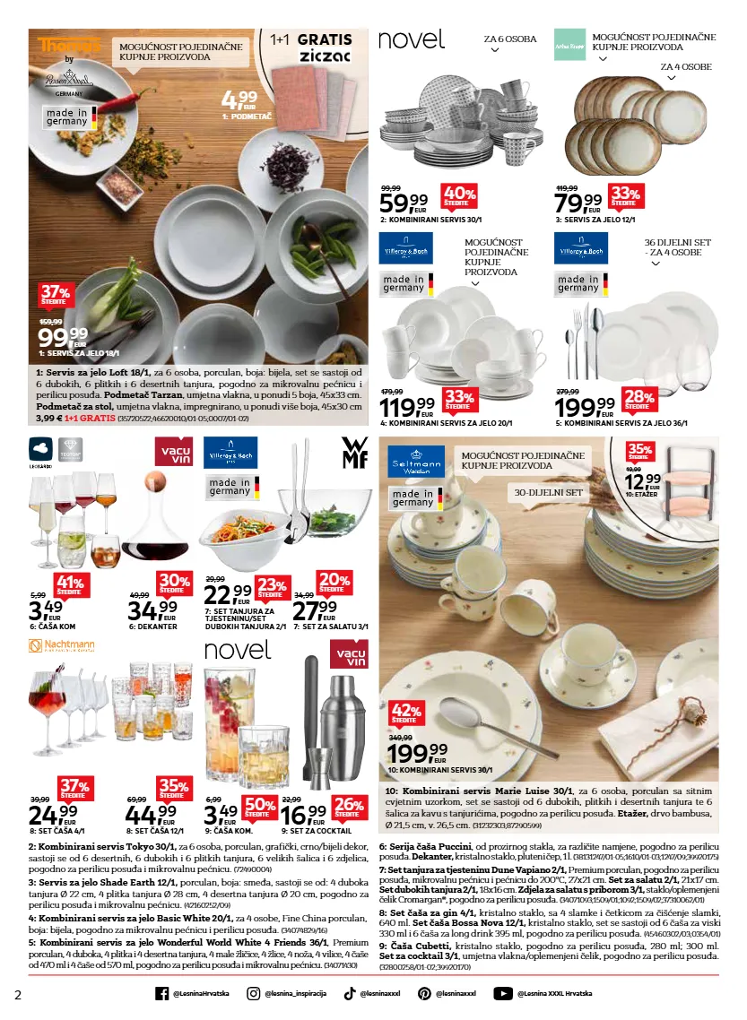 2   @lesnina xxxl hrvatska @lesninahrvatska   @lesninaxxxl @lesninaxxxl @lesnina_inspiracija  99, 99 eur 159,99 1:   servis za jelo 18/1 37   % štedite  199, 99 eur 349,99 10:   kombinirani servis 30/1 42   % štedite  6:   serija čaša puccini , od prozirnog stakla, za različite namjene, pogodno za perilicu posuđa.   dekanter,   kristalno staklo, pluteni čep, 1 l.   (38131247/01-05;1610/01-03;1247/09;39920175)  3, 49 eur 5,99 6:   čaša kom 41 % štedite  34, 99 eur 49,99 6:   dekanter 30   % štedite  7:   set tanjura za tjesteninu dune vapiano 2/1,   premium porculan, pogodno za perilicu posuđa, mikrovalnu pećnicu i pećnicu do 200°c, 27x21 cm.   set za salatu 2/1,   21x17 cm.  set dubokih tanjura 2/1,   18x16 cm.   zdjela za salatu s priborom 3/1,   staklo/oplemenjeni čelik cromargan®, pogodno za perilicu posuđa.   (34071093;1509/01;1092;1509/02;37310062/01)  22, 99 eur 29,99 7:   set tanjura za tjesteninu/set dubokih tanjura 2/1 23   % štedite  27, 99 eur 34,99 7:   set za salatu 3/1 20   % štedite  9:   čaša cubetti,   kristalno staklo, pogodno za perilicu posuđa, 280 ml; 300 ml.  set za cocktail 3/1 , umjetna vlakna/oplemenjeni čelik, pogodno za perilicu posuđa. (32800258/01-02;39920170)  3, 49 eur 6,99 9:   čaša kom. 50   % štedite  16, 99 eur 22,99 9:   set za cocktail 26 % štedite  8:   set čaša za gin 4/1,   kristalno staklo, sa 4 slamke i četkicom za čišćenje slamki, 640 ml.   set čaša bossa nova 12/1,   kristalno staklo, set se sastoji od 6 čaša za viski 330 ml i 6 čaša za long drink 395 ml, pogodno za perilicu posuđa.   (45460302/03;0354/01)  24, 99 eur 39,99 8:   set čaša 4/1 37   % štedite  44, 99 eur 69,99 8:   set čaša 12/1 35 % štedite  2:   kombinirani servis tokyo 30/1,   za 6 osoba, porculan, grafički, crno/bijeli dekor, sastoji se od 6 desertnih, 6 dubokih i 6 plitkih tanjura, 6 velikih šalica i 6 zdjelica, pogodno za perilicu posuđa i mikrovalnu pećnicu.   (72490004)  59, 99 eur 99,99 2:   kombinirani servis 30/1 40   % štedite  za 6 osoba  3:   servis za jelo shade earth 12/1,   porculan, boja: smeđa, sastoji se od: 4 duboka tanjura ø 22 cm, 4 plitka tanjura ø 28 cm, 4 desertna tanjura ø 20 cm, pogodno za perilicu posuđa i mikrovalnu pećnicu.   (42160252/09)  79, 99 eur 119,99 3:   servis za jelo 12/1 33   % štedite  za 4 osobe  mogućnost pojedinačne kupnje proizvoda  5:   kombinirani servis za jelo wonderful world white 4 friends 36/1 , premium porculan, 4 duboka, 4 plitka i 4 desertna tanjura, 4 male žličice, 4 žlice, 4 noža, 4 vilice, 4 čaše od 470 ml i 4 čaše od 570 ml, pogodno za perilicu posuđa i mikrovalnu pećnicu.   (34071430)  199, 99 eur 279,99 5:   kombinirani servis za jelo 36/1 28   % štedite  36 dijelni set - za 4 osobe  4:   kombinirani servis za jelo basic white 20/1,   za 4 osobe, fine china porculan, boja: bijela, pogodno za mikrovalnu pećnicu i perilicu posuđa.   (34074829/16)  119, 99 eur 179,99 4:   kombinirani servis za jelo 20/1 33   % štedite  mogućnost pojedinačne kupnje proizvoda  mogućnost pojedinačne kupnje proizvoda  mogućnost pojedinačne kupnje proizvoda  30-dijelni set  10:   kombinirani servis marie luise 30/1 , za 6 osoba, porculan sa sitnim cvjetnim uzorkom, set se sastoji od 6 dubokih, plitkih i desertnih tanjura te 6 šalica za kavu s tanjurićima, pogodno za perilicu posuđa.   etažer,   drvo bambusa, ø 21,5 cm, v. 26,5 cm.   (31232303;87290599)  12, 99 eur 19,99 10:   etažer 35   % štedite  1:   servis za jelo loft 18/1,   za 6 osoba, porculan, boja: bijela, set se sastoji od 6 dubokih, 6 plitkih i 6 desertnih tanjura, pogodno za mikrovalnu pećnicu i perilicu posuđa.   podmetač tarzan , umjetna vlakna, u ponudi 5 boja, 45x33 cm.  podmetač za stol,   umjetna vlakna, impregnirano, u ponudi više boja, 45x30 cm  3,99 € 1+1 gratis   (35720522;46620010/01-05;0007/01-02)  by  1+1   gratis  4, 99 eur 1:   podmetač