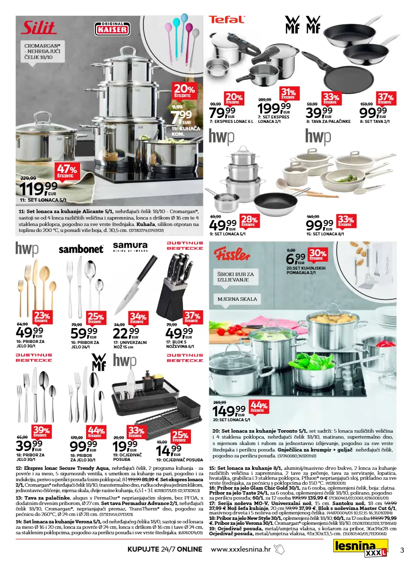 3 kupujte   24/7   online   www.xxxlesnina.hr  119, 99 eur 229,99 11:   set lonaca 5/1 47   % štedite  7, 99 eur 9,99 11:   kuhača kom. 20   % štedite 149, 99 eur 269,99 20:   set lonaca 5/1 44 % štedite  6, 99 eur 9,99 20:   set kuhinjskih pomagala 2/1 30   % štedite  12:   ekspres lonac secure trendy aqua,   nehrđajući čelik, 2 programa kuhanja - za povrće i za meso, 5 sigurnosnih ventila, s umetkom za kuhanje na pari, pogodno i za indukciju, perivo u perilici posuđa (osim poklopca), 8 l 119,99   89,99 € .   set ekspres lonaca 2/1,   cromargan® nehrđajući čelik 18/10, transtermalno dno, ručka odvojiva jednim klikom, jednostavno čišćenje, mjerna skala, dvije razine kuhanja, 6,5 l + 3 l.   (67810721/01-02;37312653)  79, 99 eur 99,99 7:   ekspres lonac 6 l 20   % štedite 199, 99 eur 289,99 7:   set ekspres lonaca 2/1 31 % štedite  14:   set lonaca za kuhanje verona 5/1,   od nehrđajućeg čelika 18/0, sastoji se od lonaca za meso ø 16 i 20 cm, lonca za povrće ø 24 cm, lonca s drškom ø 16 cm i tave ø 24 cm, sa staklenim poklopcima, pogodno za perilicu posuđa i sve vrste štednjaka.   (68760174/01)  49, 99 eur 69,99 9:   set lonaca 5/1 28   % štedite  15:   set lonaca za kuhanje 8/1,   aluminij/masivno drvo bukve, 2 lonca za kuhanje različitih veličina i zapremnina, 2 tave za pečenje, tava za serviranje, lopatica, hvataljka, grabilica i 3 staklena poklopca, pfluon® neprianjajući sloj, prikladno za sve vrste štednjaka, za pećnicu s poklopcima do 150 °c.   (41280001)  99, 99 eur 149,99 15:   set lonaca 8/1 33   % štedite  13:   tava za palačinke , alugus s permadur® neprianjajućim slojem, bez pfoa, s dodatnim drvenim priborom, ø 27 cm.   set tava permadur advance 2/1 , nehrđajući čelik 18/10, cromargan®, neprianjajući premaz, transtherm® dno, pogodno za pećnicu do 260°c, ø 24 cm i ø 28 cm.   (37311954;0717/01)  39, 99 eur 59,99 8:   tava za palačinke 33   % štedite  99, 99 eur 159,99 8:   set tava 2/1 37   % štedite  16:   pribor za jelo glam chic gold 30/1,   za 6 osoba, oplemenjeni čelik, boja: zlatna.  pribor za jelo taste 24/1,   za 6 osoba, oplemenjeni čelik 18/10, polirano, pogodno za perilicu posuđa;   60/1 , za 12 osoba 199,99   139,99 €   (71360461/02;0061;42160061/01)  49, 99 eur 64,99 16:   pribor za jelo 30/1 23   % štedite  59, 99 eur 79,99 16:   pribor za jelo 24/1 25 % štedite  18:   pribor za jelo new style 30/1,   oplemenjeni čelik 18/10;   60/1,   za 12 osoba 119,99   79,99 €.   pribor za jelo verona 30/1 , cromargan® oplemenjeni čelik 18/10.   (35010330;0331;37314561)  39, 99 eur 65,99 18:   pribor za jelo 30/1 39   % štedite  99, 99 eur 179,99 18:   pribor za jelo 30/1 44 % štedite  19:   ocjeđivač posuđa,   metal/umjetna vlakna, s košarom za pribor, 36x14x28 cm  ocjeđivač posuđa,   metal/umjetna vlakna, 41x30x13,5 cm.   (35010540/01;71120061)  14, 99 eur 19,99 19:   ocjeđivač posuđa 25 % štedite  19, 99 eur 29,99 19:   ocjeđivač posuđa 33   % štedite  17:   serija noževa mo-v, univerzalni nož , 15 cm.   santoku nož,   18 cm 59,99  37,99 €   nož šefa kuhinje , 20 cm 59,99   37,99 € .   blok s noževima master cut 6/1 , masivnog drveta i 5 noževa od oplemenjenog čelika.   (44870004/01-10,12,15-16;35010284)  22, 99 eur 34,99 17:   univerzalni nož 15 cm 34 % štedite 49, 99 eur 79,99 17:   blok s noževima 6/1 37   % štedite  20:   set lonaca za kuhanje toronto 5/1,   set sadrži: 5 lonaca različitih veličina i 4 staklena poklopca,   nehrđajući čelik 18/10, matirano, supertermalno dno, s mjernom skalom i rubom za jednostavno izlijevanje, pogodno za sve vrste štednjaka i perilicu posuđa.   gnječilica za krumpir + guljač   nehrđajući čelik, pogodno za perilicu posuđa.   (37240080;39320192)  mjerna skala  široki rub za izlijevanje  cromargan® - nehrđajući čelik 18/10  11:   set lonaca za kuhanje alicante 5/1,   nehrđajući čelik 18/10 - cromargan®, sastoji se od 4 lonca različitih veličina i zapremnina, lonca s drškom ø 16 cm te 4 staklena poklopca, pogodno za sve vrste štednjaka.   kuhača , silikon otporan na toplinu do 200 °c, u ponudi više boja, d. 30,5 cm.   (37310279;0797/02)