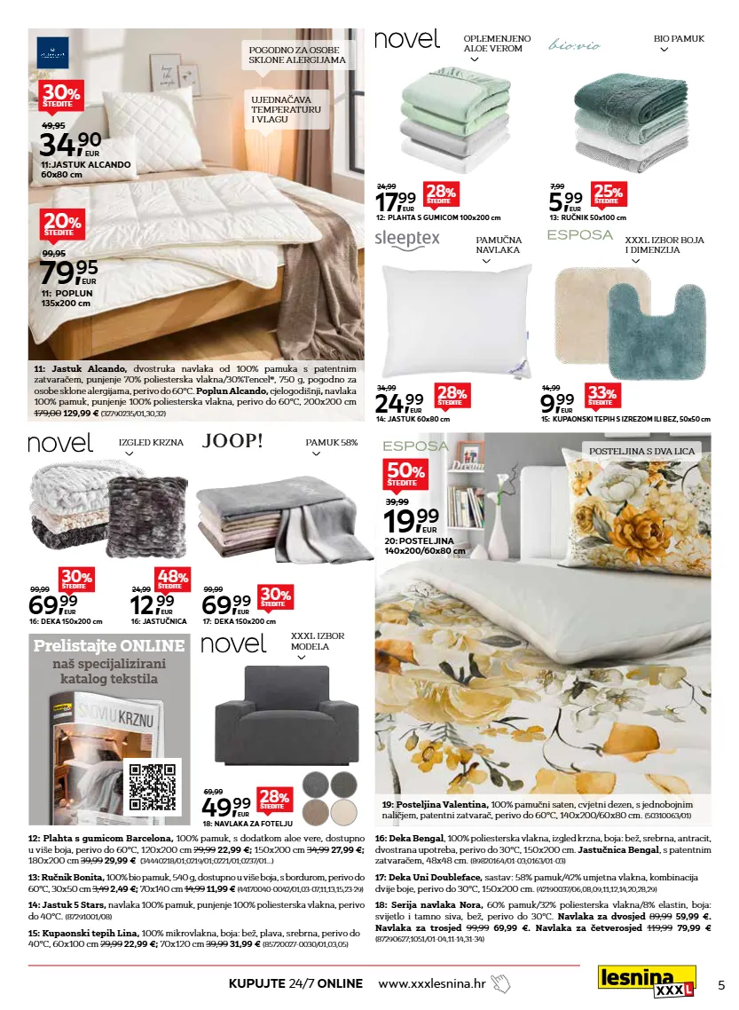 5 kupujte   24/7   online   www.xxxlesnina.hr  satenska posteljina s dva lica · obojestranska posteljnina iz satena · satenska posteljina sa dva lica { 140 x 200 / 60 x 80 cm } zip tested for harmful substance double- face breath- able easy- care natural fibre  11:   jastuk   alcando,   dvostruka   navlaka   od   100%   pamuka   s   patentnim zatvaračem, punjenje 70% poliesterska vlakna/30%tencel®, 750 g, pogodno za osobe sklone alergijama, perivo do 60°c.   poplun alcando,   cjelogodišnji ,   navlaka 100% pamuk, punjenje 100% poliesterska vlakna, perivo do 60°c, 200x200 cm 179,00   129,99 €   (32790235/01,30,32)  34, 90 eur 49,95 11:   jastuk alcando 60x80 cm 30   % štedite  79, 95 eur 99,95 11:   poplun 135x200 cm 20   % štedite  19, 99 eur 39,99 20:   posteljina 140x200/60x80 cm 50   % štedite  12:   plahta s gumicom barcelona,   100% pamuk, s dodatkom aloe vere, dostupno u više boja, perivo do 60°c, 120x200 cm 29,99   22,99 €;   150x200 cm 34,99   27,99 €;  180x200 cm 39,99   29,99 €   (34440218/01;0219/01;0221/01;0237/01...)  17, 99 eur 24,99 12:   plahta s gumicom 100x200 cm 28   % štedite  oplemenjeno aloe verom  14:   jastuk 5 stars,   navlaka 100% pamuk, punjenje 100% poliesterska vlakna, perivo do 40°c.   (87291001/08)  24, 99 eur 34,99 14:   jastuk 60x80 cm 28   % štedite  pamučna navlaka  15:   kupaonski tepih lina,   100% mikrovlakna, boja: bež, plava, srebrna, perivo do 40°c, 60x100 cm 29,99   22,99 €;   70x120 cm 39,99   31,99 €   (85720027-0030/01,03,05)  9, 99 eur 14,99 15:   kupaonski tepih s izrezom ili bez, 50x50 cm 33   % štedite  xxxl izbor boja i dimenzija  13:   ručnik bonita,   100% bio pamuk, 540 g, dostupno u više boja, s bordurom, perivo do 60°c, 30x50 cm 3,49   2,49 €;   70x140 cm 14,99   11,99 €   (44170040-0042/01,03-07,11,13,15,23-29)  5, 99 eur 7,99 13:   ručnik 50x100 cm 25 % štedite  bio pamuk  16:   deka bengal , 100% poliesterska vlakna, izgled krzna, boja: bež, srebrna, antracit, dvostrana upotreba, perivo do 30°c, 150x200 cm.   jastučnica bengal , s patentnim zatvaračem, 48x48 cm.   (89820164/01-03;0163/01-03)  69, 99 eur 99,99 16:   deka 150x200 cm 30   % štedite  izgled krzna  12, 99 eur 24,99 16:   jastučnica 48   % štedite  17:   deka uni doubleface,   sastav: 58% pamuk/42% umjetna vlakna, kombinacija dvije boje, perivo do 30°c, 150x200 cm.   (42190037/06,08,09,11,12,14,20,28,29)  69, 99 eur 99,99 17:   deka 150x200 cm 30   % štedite  pamuk 58%  18:   serija navlaka nora,   60% pamuk/32% poliesterska vlakna/8% elastin, boja: svijetlo i tamno siva, bež, perivo do 30°c.   navlaka za dvosjed   89,99   59,99 €.  navlaka za trosjed   99,99   69,99 €.   navlaka za četverosjed   119,99   79,99 €  (87290627;1051/01-04,11-14,31-34)  49, 99 eur 69,99 18:   navlaka za fotelju 28   % štedite  xxxl izbor modela prelistajte online naš specijalizirani katalog tekstila  ujednačava temperaturu i vlagu  pogodno za osobe sklone alergijama  posteljina s dva lica  19:   posteljina valentina,   100% pamučni saten, cvjetni dezen, s jednobojnim naličjem, patentni zatvarač, perivo do 60°c, 140x200/60x80 cm.   (50310063/01)