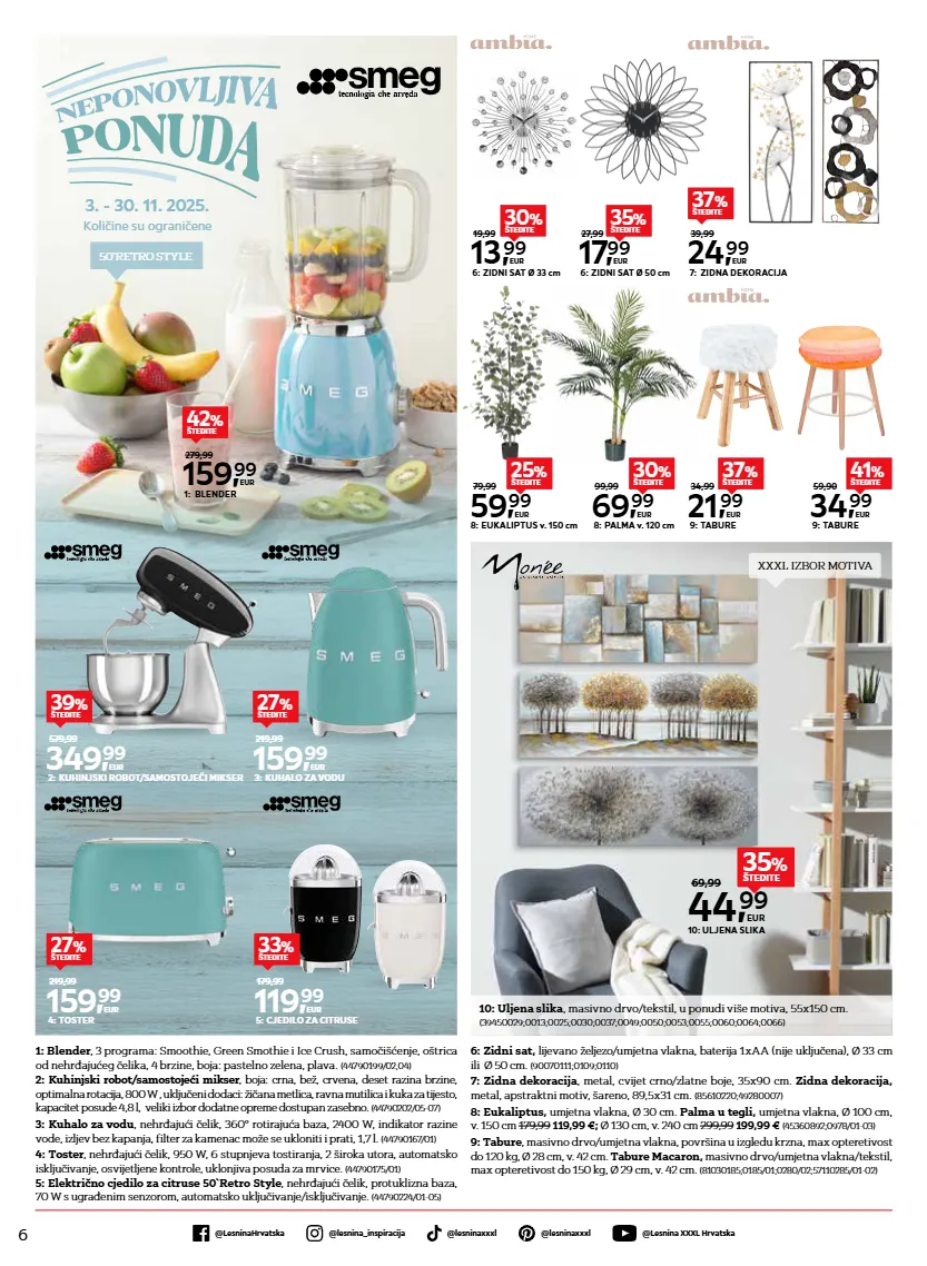 6   @lesnina xxxl hrvatska @lesninahrvatska   @lesninaxxxl @lesninaxxxl @lesnina_inspiracija  5:   električno cjedilo za citruse 50`retro style , nehrđajući čelik, protuklizna baza, 70 w s ugrađenim senzorom, automatsko uključivanje/isključivanje.   (44790224/01-05)  3:   kuhalo za vodu , nehrđajući čelik, 360° rotirajuća baza, 2400 w, indikator razine vode, izljev bez kapanja, filter za kamenac može se ukloniti i prati, 1,7 l.   (44790167/01)  4:   toster , nehrđajući čelik, 950 w, 6 stupnjeva tostiranja, 2 široka utora, automatsko isključivanje, osvijetljene kontrole, uklonjiva posuda za mrvice.   (44790175/01)  2:   kuhinjski robot/samostojeći mikser , boja: crna, bež, crvena, deset razina brzine, optimalna rotacija, 800 w , uključeni dodaci: žičana metlica, ravna mutilica i kuka za tijesto, kapacitet posude 4,8 l, veliki izbor dodatne opreme dostupan zasebno.   (44790202/05-07)  1:   blender , 3 programa: smoothie, green smothie i ice crush, samočišćenje, oštrica od nehrđajućeg čelika, 4 brzine, boja: pastelno zelena, plava.   (44790199/02,04)  119, 99 eur 179,99 5:   cjedilo za citruse 33   % štedite 159, 99 eur 279,99 1:   blender 42   % štedite 159, 99 eur 219,99 3:   kuhalo za vodu 27   % štedite  6:   zidni sat,   lijevano željezo/umjetna vlakna, baterija 1xaa (nije uključena), ø 33 cm ili ø 50 cm.   (90070111;0109;0110)  13, 99 eur 19,99 6:   zidni sat ø 33 cm 30   % štedite  17, 99 eur 27,99 6:   zidni sat ø 50 cm 35 % štedite  7:   zidna dekoracija , metal, cvijet crno/zlatne boje, 35x90 cm.   zidna dekoracija,  metal, apstraktni motiv, šareno, 89,5x31 cm.   (85610220;49280007)  24, 99 eur 39,99 7:   zidna dekoracija 37   % štedite  9:   tabure , masivno drvo/umjetna vlakna, površina u izgledu krzna, max opteretivost do 120 kg, ø 28 cm, v. 42 cm.   tabure macaron,   masivno drvo/umjetna vlakna/tekstil, max opteretivost do 150 kg, ø 29 cm, v. 42 cm.   (81030185;0185/01;0280/02;57110285/01-02)  21, 99 eur 34,99 9:   tabure 37   % štedite  34, 99 eur 59,90 9:   tabure 41 % štedite  8:   eukaliptus,   umjetna vlakna, ø 30 cm.   palma u tegli,   umjetna vlakna, ø 100 cm, v. 150 cm 179,99   119,99 €;   ø 130 cm, v. 240 cm 299,99   199,99 €   (45360892;0978/01-03)  59, 99 eur 79,99 8:   eukaliptus v. 150 cm 25 % štedite 69, 99 eur 99,99 8:   palma v. 120 cm 30   % štedite  xxxl izbor motiva  10:   uljena slika , masivno drvo/tekstil, u ponudi više motiva, 55x150 cm. (39450029;0013;0025;0030;0037;0049;0050;0053;0055;0060;0064;0066)  44, 99 eur 69,99 35 % štedite 10: uljena slika  159, 99 eur 219,99 4:   toster 27   % štedite  50`retro style  3. - 30. 11. 2025.  količine su ograničene  349, 99 eur 579,99 2:   kuhinjski robot/samostojeći mikser 39   % štedite
