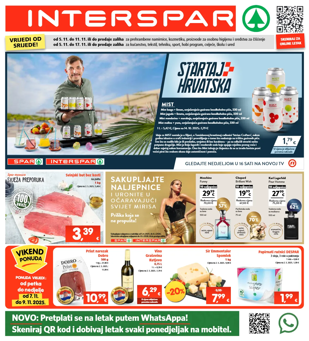 v i k e n d p o n u d a  mist  mist bazga + limun, osvježavajuće gazirano bezalkoholno piće, 330 ml mist jagoda + limeta, osvježavajuće gazirano bezalkoholno piće, 330 ml mist mandarina + marakuja, osvježavajuće gazirano bezalkoholno piće, 330 ml mist malina + yuzu, osvježavajuće gazirano bezalkoholno piće, 330 ml  1 l = 5,42 €, cijena na 14. 10. 2025.: 1,79 €  ideja za mist nastala je u rijeci, u tomislavovoj kreativnoj radionici ‘istrian crafters’, nakon godina iskustva u craft industriji i promišljanja o tome što nedostaje na tržištu gaziranih pića. sve što se nudilo bilo je ili preslatko, umjetno ili bez karaktera – pa su odlučili stvoriti nešto potpuno drugačije. mist je linija laganih i modernih soda koje spajaju svježinu pravog voća i dobar osjećaj nakon konzumacije. ono što mist izdvaja je činjenica da se za izradu koriste pravi voćni pirei što svakom okusu daje autentičnost i punoću.   u cijenu je uključena povratna naknada  1 , 79   €  gledajte nedjeljom u 16 sati na novoj tv  sakupl ja jte nal jepnice  i u r o n i t e u o č a r a v a j u ć i s v i j e t m i r i s a  prilika koja se ne propušta! sakupljajte naljepnice u razdoblju od 5.11.2025. do 6.1.2026. iskoristite sakupljene naljepnice do 13.1.2026. ili do prodaje zaliha.  ušteda  57   %  v r s t a m i r i s a  voćni, cvjetni miris toaletna voda za žene 100 ml  moschino  funny  29 99 10 naljepnica  redovna cijena 70,00 €  €  ušteda  70   %  v r s t a m i r i s a  voćni, cvjetni, drvenasti miris parfemska voda za žene 75 ml  chopard  brilliant wish  19 99 10 naljepnica  redovna cijena 67,00 €  €  ušteda  62   %  v r s t a m i r i s a  aromatični, fougere miris toaletna voda za muškarce 100 ml  karl lagerfeld  pour homme  27   99 10 naljepnica  redovna cijena 75,00 €  €  novo: pretplati se na letak putem whatsappa! skeniraj qr kod i dobivaj letak svaki ponedjeljak na mobitel.  3 , 39   € ponuda vrijedi : od petka do nedjelje od 7. 11. do 9. 11. 2025.  svje ž a preporuka  spar mesnica   svinjski but bez kosti  na pultu  1 kg  cijena na 2. 5. 2025.: 5,49 €  pršut narezak dobro 500 g  1 kg = 21,98 € cijena na 2. 5. 2025.: 11,99 €  vino graševina kutjevo 0,75 l  1 l = 8,39 € cijena na 2. 5. 2025.: 7,79 €  sir emmentaler spomlek 1 kg  cijena na 2. 5. 2025.: 9,99 €  h r v a t s k a k v a l i t e t a h r v a t   s   k a k v a l i t e t a  papirnati ručnici despar  3 sloja, 3 role u pakiranju 1 rola = 0,66 € cijena na 2. 5. 2025.: 1,99 €  1 , 99   € 10 , 99 € 6 , 29   €  u cijenu uključena povratna naknada  h r v a t s k a k v a l i t e t a h r v   a   t s k a k v a l i t e t a vrijedi od srijede!  skeniraj za online letak  od 5. 11. do 11. 11. ili do prodaje zaliha   za prehrambene namirnice, kozmetiku, proizvode za osobnu higijenu i sredstva za čišćenje  od 5. 11. do 17. 11. ili do prodaje zaliha   za kućanstvo, tekstil, tehniku, sport, hobi program, cvijeće, školu i ured   7 , 99   €  9,99  -20 %