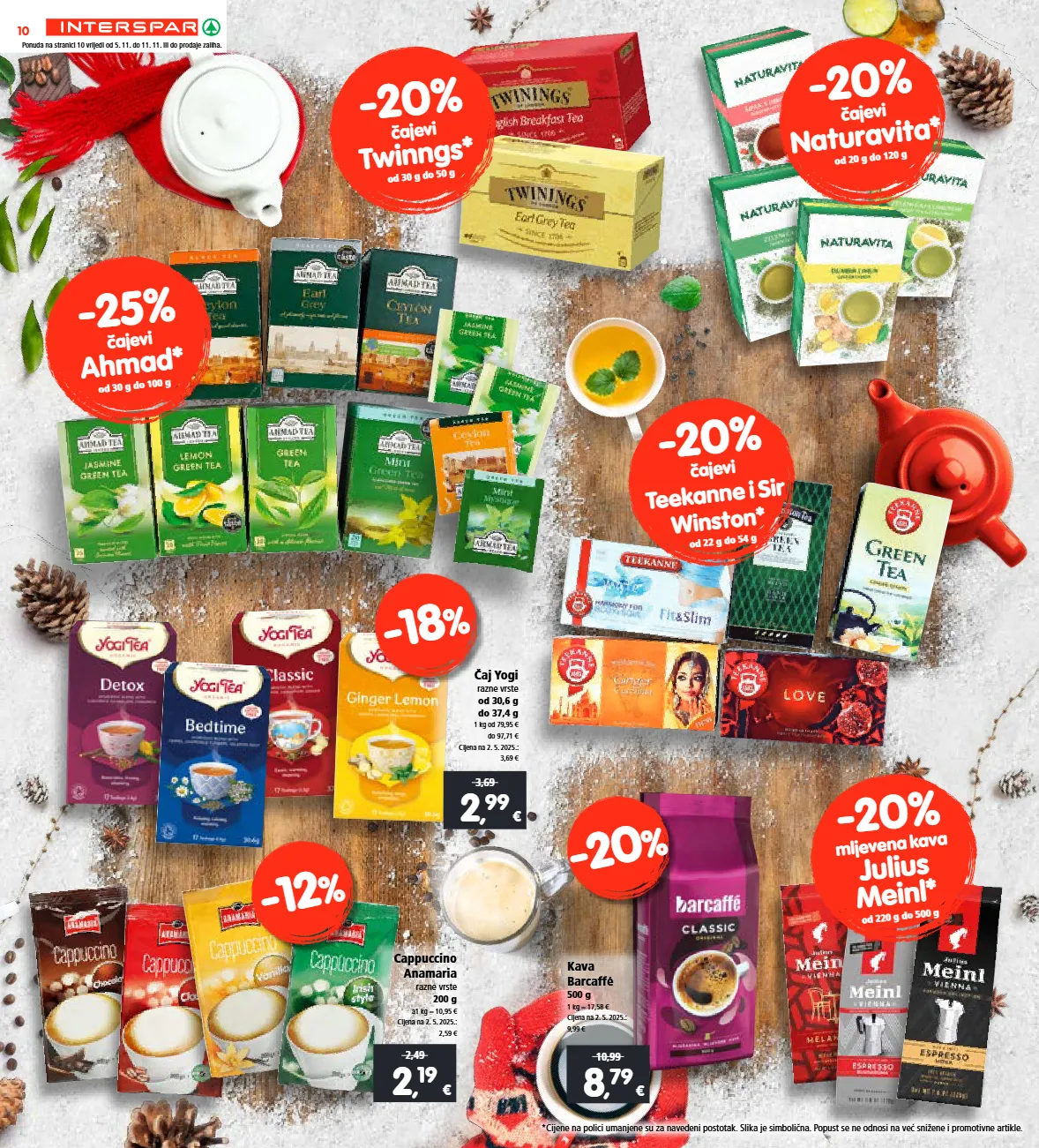 -20 % -20% čajevi twinngs*  od 30 g do 50 g  -25% čajevi ahmad*  od 30 g do 100 g  -20% mljevena kava julius meinl*  od 220 g do 500 g  -20% čajevi naturavita*  od 20 g do 120 g  kava barcaffé 500 g  1 kg = 17,58 € cijena na 2. 5. 2025.: 9,99 €  čaj yogi  razne vrste  od 30,6 g do 37,4 g  1 kg od 79,95 € do 97,71 € cijena na 2. 5. 2025.: 3,69 €  cappuccino anamaria  razne vrste  200 g  a1 kg = 10,95 € cijena na 2. 5. 2025.: 2,59 €  8 , 79   €  10,99  2   , 19   €  2,49  2   , 99   €  3,69  -20% čajevi teekanne i sir winston*  od 22 g do 54 g  -18 %  -12 %  ponuda na stranici 10 vrijedi od 5. 11. do 11. 11. ili do prodaje zaliha.  10  *cijene na polici umanjene su za navedeni postotak. slika je simbolična. popust se ne odnosi na već snižene i promotivne artikle.