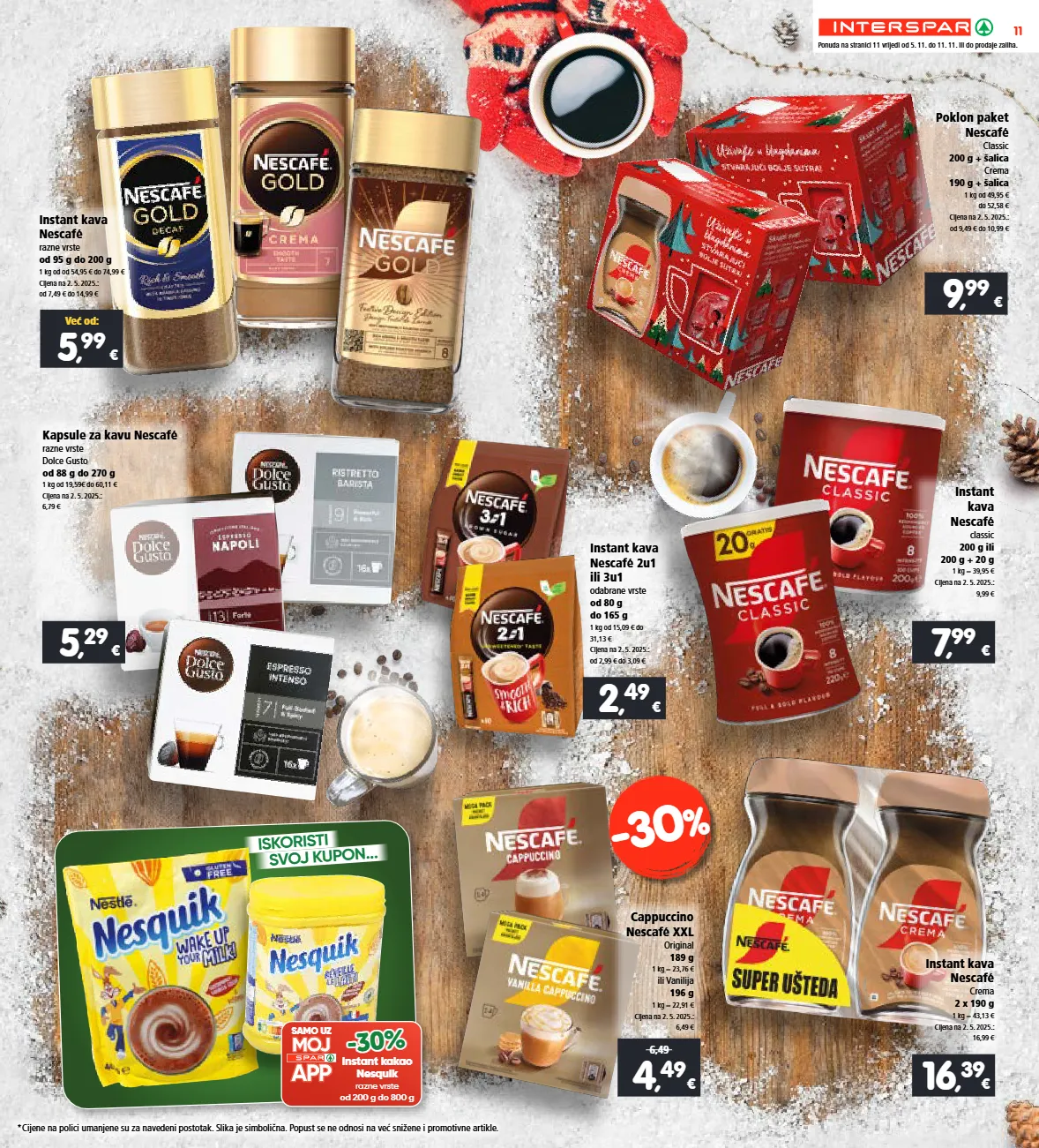 iskoristi svoj kupon...  samo uz  -30% -30%  instant kakao nesquik  razne vrste  od 200 g do 800 g  -30 %  poklon paket nescafé  classic  200 g + šalica  crema  190 g + šalica  1 kg od 49,95 € do 52,58 € cijena na 2. 5. 2025.: od 9,49 € do 10,99 €  instant kava nescafé 2u1 ili 3u1  odabrane vrste  od 80 g do 165 g  1 kg od 15,09 € do 31,13 € cijena na 2. 5. 2025.: od 2,99 € do 3,09 €  instant kava nescafé  classic  200 g ili 200 g + 20 g  1 kg = 39,95 € cijena na 2. 5. 2025.: 9,99 €  instant kava nescafé  crema  2 x 190 g  1 kg = 43,13 € cijena na 2. 5. 2025.: 16,99 €  cappuccino nescafé xxl  original  189 g  1 kg = 23,76 € ili vanilija  196 g  1 kg = 22,91 € cijena na 2. 5. 2025.: 6,49 €  kapsule za kavu nescafé  razne vrste dolce gusto  od 88 g do 270 g  1 kg od 19,59€ do 60,11 € cijena na 2. 5. 2025.: 6,79 €  9 , 99   € 7 , 99   € 2   , 49   € 16 , 39 € 5 , 29   € 4 , 49   €  6,49  instant kava nescafé  razne vrste  od 95 g do 200 g  1 kg od od 54,95 € do 74,99 € cijena na 2. 5. 2025.: od 7,49 € do 14,99 €  5 , 99   €  već od:  ponuda na stranici 11 vrijedi od 5. 11. do 11. 11. ili do prodaje zaliha.  11  *cijene na polici umanjene su za navedeni postotak. slika je simbolična. popust se ne odnosi na već snižene i promotivne artikle.