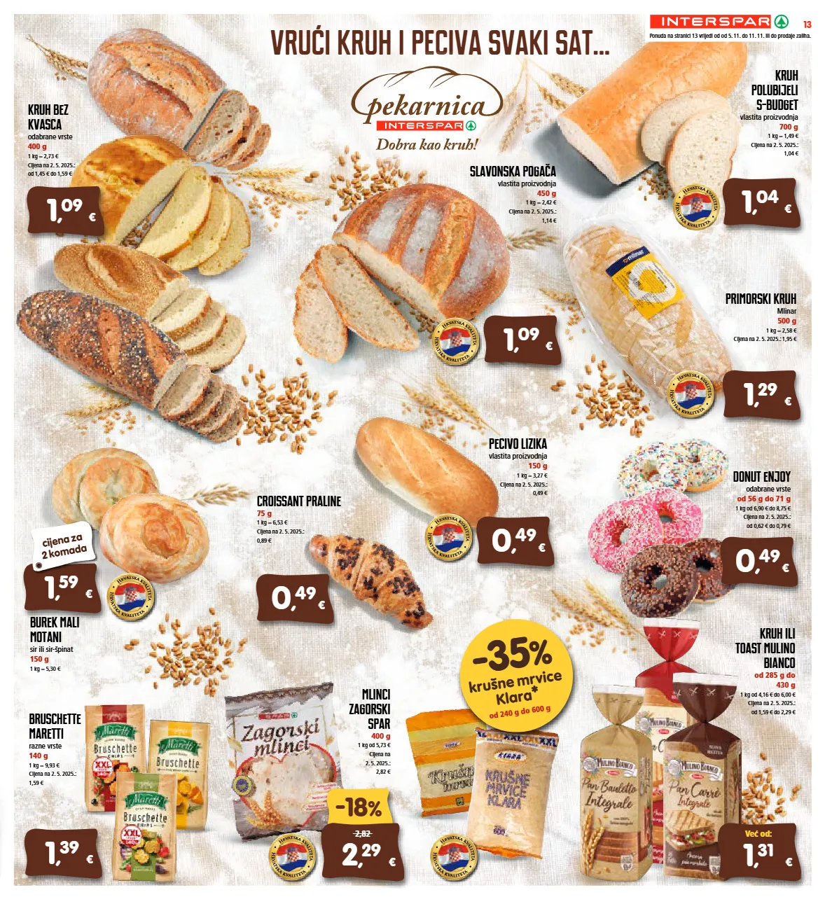 2   , 29  2,82  -18 % €  0   , 49   €  vrući kruh i peciva svaki sat...  kruh ili toast mulino bianco  od 285 g do 430 g  1 kg od 4,16 € do 6,00 € cijena na 2. 5. 2025.: od 1,59 € do 2,29 €  mlinci zagorski spar  400 g  1 kg od 5,73 € cijena na 2. 5. 2025.: 2,82 €  1   , 31  već od:  €  croissant praline  75 g  1 kg = 6,53 € cijena na 2. 5. 2025.: 0,89 €  bruschette maretti  razne vrste  140 g  1 kg = 9,93 € cijena na 2. 5. 2025.: 1,59 €  slavonska pogača  vlastita proizvodnja  450 g  1 kg = 2,42 € cijena na 2. 5. 2025.: 1,14 €  1   , 09   €  1   , 04   €  1   , 29   €  h r v a t s k a k v a l i t e t a h r v a t s k a k v a l i t e t a  h r v a t s k a k v a l i t e t a h r v a t s k a k v a l i t e t a  h r v a t s k a k v a l i t e t a h r v a t s k a k   v a l i t e t a  burek mali motani  sir ili sir-špinat  150 g  1 kg = 5,30 €  1   , 59   €  cijena za 2 komada  donut enjoy  odabrane vrste  od 56 g do 71 g  1 kg od 6,90 € do 8,75 € cijena na 2. 5. 2025.: od 0,62 € do 0,79 €  1   , 09   €  kruh bez kvasca  odabrane vrste  400 g  1 kg = 2,73 € cijena na 2. 5. 2025.: od 1,45 € do 1,59 €  -35 % krušne mrvice klara   *  od 240 g do 600 g  kruh polubijeli s-budget  vlastita proizvodnja  700 g  1 kg = 1,49 € cijena na 2. 5. 2025.: 1,04 €  primorski kruh  mlinar  500 g  1 kg = 2,58 € cijena na 2. 5. 2025.: 1,95 €  h r v a t s k a k v a l i t e t a h r v a t s k a k v a l i t e t a  pecivo lizika  vlastita proizvodnja  150 g  1 kg = 3,27 € cijena na 2. 5. 2025.: 0,49 €  0   , 49   €  0   , 49   €  1   , 39   €   h r v a t s k a k v a l i t e t a h r v a t s   k a k v a l i t e t a  h r v a t s k a k v a l i t e t a h r   v a t s k a k v a l i t e t a  h r v a t s k a k v a l i t e t a h r   v a t s k a k v a l i t e t a  ponuda na stranici 13 vrijedi od od 5. 11. do 11. 11. ili do prodaje zaliha.  13