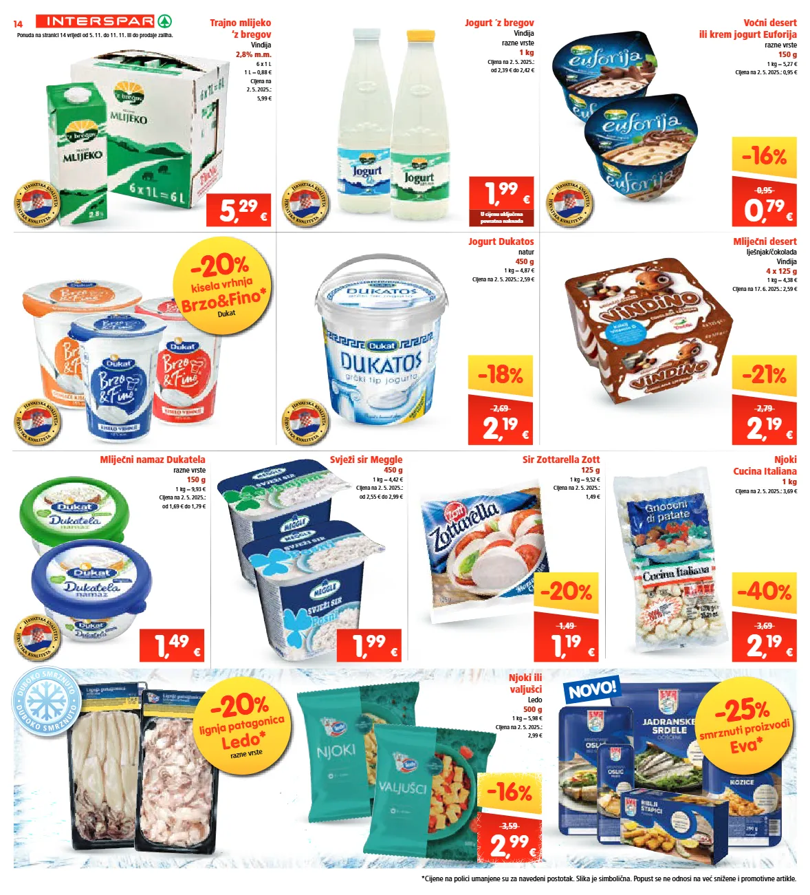1 , 99   € 5 , 29   € 1 , 19   €  1,49  -20 % 2   , 19   €  3,69  -40 % 2   , 19   €  2,69  -18 % 0 , 79   €  0,95  -16 % 2   , 19   €  2,79  -21 %  h r v a t s k a k v a l i t e t a h r v a t s k a k v a   l i t e t a  h r v a t s k a k v a l i t e t a h r v a t s k a k v a l i t e t a  h r v a t s k a k v a l i t e t a h r v a t s k a k v a l i t e t a  h r v a t s k a k v a l i t e t a h r v a t s k a k v   a   l i t e t a  h r v a t s k a k v a l i t e t a h r v a t s k a k v a   l i t e t a  h r v a t s k a k v a l i t e t a h r v a t s k a k v a l i t e t a  novo!  trajno mlijeko ‘z bregov  vindija  2,8% m.m.  6 x 1 l 1 l = 0,88 € cijena na 2. 5. 2025.: 5,99 €  mliječni namaz dukatela  razne vrste  150 g  1 kg = 9,93 € cijena na 2. 5. 2025.: od 1,69 € do 1,79 €  svježi sir meggle 450 g  1 kg = 4,42 € cijena na 2. 5. 2025.: od 2,55 € do 2,99 €  jogurt ´z bregov  vindija razne vrste  1 kg  cijena na 2. 5. 2025.: od 2,39 € do 2,42 €  jogurt dukatos  natur  450 g  1 kg = 4,87 € cijena na 2. 5. 2025.: 2,59 €  sir zottarella zott 125 g  1 kg = 9,52 € cijena na 2. 5. 2025.: 1,49 €  voćni desert ili krem jogurt euforija  razne vrste  150 g  1 kg = 5,27 € cijena na 2. 5. 2025.: 0,95 €  mliječni desert  lješnjak/čokolada vindija  4 x 125 g  1 kg = 4,38 € cijena na 17. 6. 2025.: 2,59 €  njoki cucina italiana 1 kg  cijena na 2. 5. 2025.: 3,69 €  2   , 99   €  3,59  -16 %  njoki ili valjušci  ledo  500 g  1 kg = 5,98 € cijena na 2. 5. 2025.: 2,99 €  -20 % kisela vrhnja brzo&fino*  dukat  -20 % lignja patagonica ledo*  razne vrste  -25 % smrznuti proizvodi eva*  u cijenu uključena povratna naknada  1 , 99   € 1 , 49   €  ponuda na stranici 14 vrijedi od 5. 11. do 11. 11. ili do prodaje zaliha.  14  *cijene na polici umanjene su za navedeni postotak. slika je simbolična. popust se ne odnosi na već snižene i promotivne artikle.