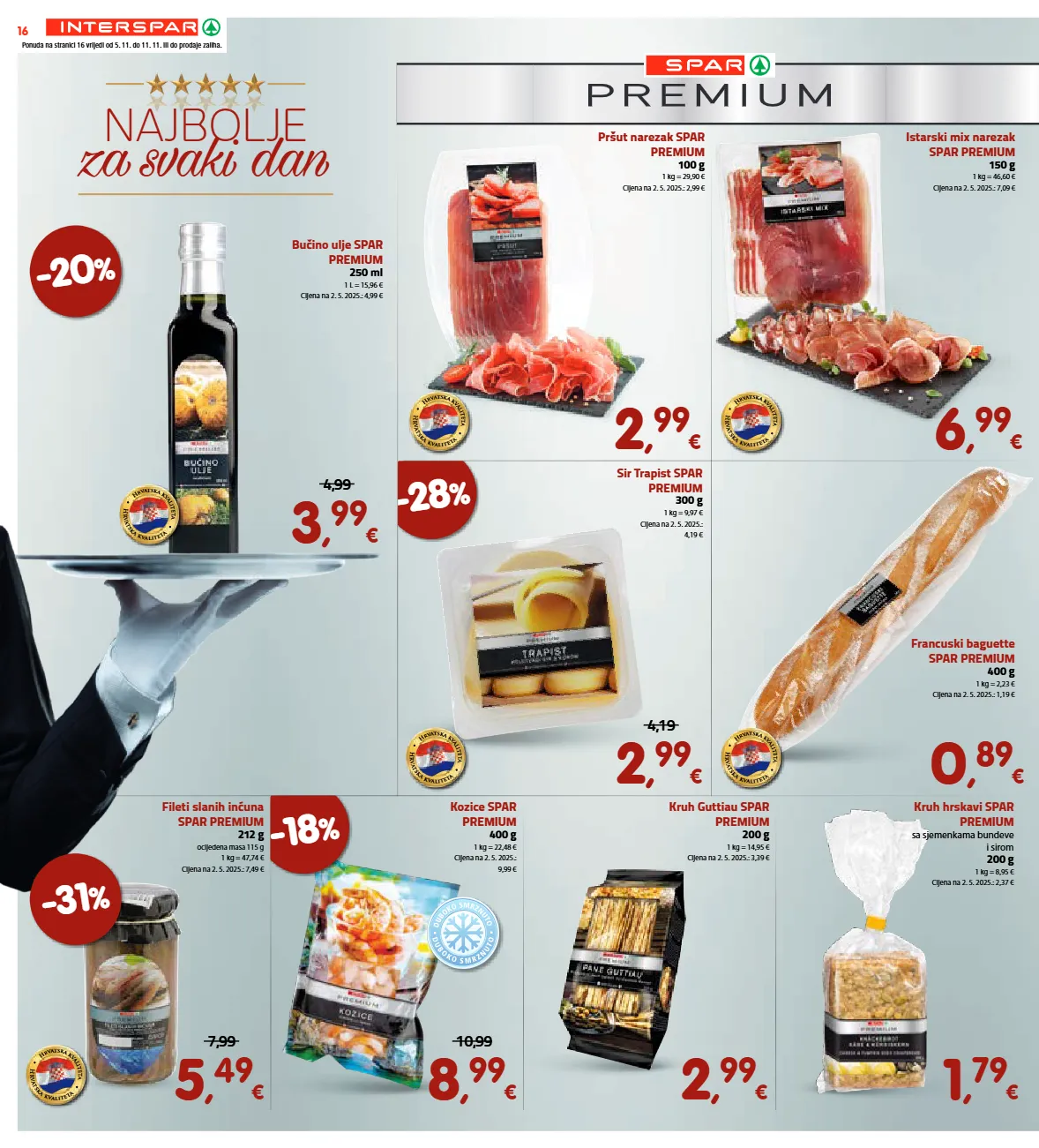 najbolje  za svaki dan  3   , 99 €  4,99  2   , 99 €  4,19  0   , 89 € 8   , 99 €  10,99  5   , 49 €  7,99  2   , 99 €   1   , 79 € 6   , 99 € 2   , 99 €  bučino ulje spar premium 250 ml  1 l = 15,96 € cijena na 2. 5. 2025.: 4,99 €  h r v a t s k a k v a l i t e t a h r v a t s k a   k v a l i t e t a  h r v a t s k a k v a l i t e t a h r v a t s k a k v   a l i t e t a  h r v a t s k a k v a l i t e t a h r v a t   s   k   a   k   v a l i t e t a  h r v a t s k a k v a l i t e t a h r v a t s k a k v a l i t e t a  h r v a t s k a k v a l i t e t a h r v a t s k a k v a l i t e t a  h r v a t s k a k v a l i t e t a h r v a t s   k a k v a l i t e t a  -28 %  -18 %  -20 %  -31 %  sir trapist spar premium 300 g  1 kg = 9,97 € cijena na 2. 5. 2025.: 4,19 €  istarski mix narezak spar premium 150 g  1 kg = 46,60 € cijena na 2. 5. 2025.: 7,09 €  pršut narezak spar premium 100 g  1 kg = 29,90 € cijena na 2. 5. 2025.: 2,99 €  francuski baguette spar premium 400 g  1 kg = 2,23 € cijena na 2. 5. 2025.: 1,19 €  fileti slanih inćuna spar premium 212 g  ocijeđena masa 115 g 1 kg = 47,74 € cijena na 2. 5. 2025.: 7,49 €  kozice spar premium 400 g  1 kg = 22,48 € cijena na 2. 5. 2025.: 9,99 €  kruh guttiau spar premium 200 g  1 kg = 14,95 € cijena na 2. 5. 2025.: 3,39 €  kruh hrskavi spar premium  sa sjemenkama bundeve i sirom  200 g  1 kg = 8,95 € cijena na 2. 5. 2025.: 2,37 €  ponuda na stranici 16 vrijedi od x. x. do x. x. ili do prodaje zaliha.  16  ponuda na stranici 16 vrijedi od 5. 11. do 11. 11. ili do prodaje zaliha.