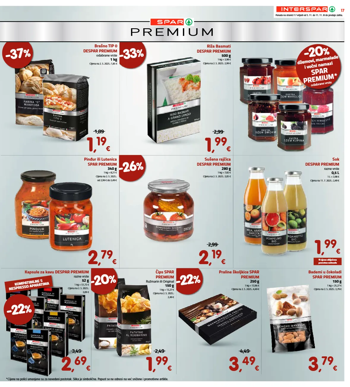 2   , 19 €  2,99  1   , 19 €  1,89  2   , 79 € 1   , 99 € 1   , 99 €  2,49  2   , 69 €  3,49  3   , 49 €  4,49  3   , 79 € 1   , 99 €  2,99  -37 %  -20 %  -33 %  -22 %  -26 %  -22 %  sušena rajčica despar premium 280 g  1 kg = 7,82 € cijena na 2. 5. 2025.: 3,05 €  sok despar premium  razne vrste  0,5 l  1 l = 3,98 € cijena na 11. 7. 2025.: 2,49 €  pinđur ili lutenica spar premium 340 g  1 kg = 8,21 € cijena na 2. 5. 2025.: od 2,99 € do 3,49 €  brašno tip 0 despar premium  odabrane vrste  1 kg  cijena na 2. 5. 2025.: 1,85 €  kapsule za kavu despar premium  razne vrste  52 g  1 kg = 51,73 € cijena na 2. 5. 2025.: 3,09 €  čips spar premium  ružmarin ili original  150 g  1 kg = 13,27 € cijena na 2. 5. 2025.: 2,49 €  praline školjkice spar premium 250 g  1 kg = 13,96 € cijena na 2. 5. 2025.: 4,49 €  riža basmati despar premium 500 g  1 kg = 3,98 € cijena na 2. 5. 2025.: 2,99 €  bademi u čokoladi spar premium 150 g  1 kg = 25,27 € cijena na 2. 5. 2025.: 3,79 €  u cijenu uključena povratna naknada  kompatibilne s nespresso aparatima  -20 %  džemovi, marmelade i voćni namazi spar premium*  odabrane vrste  ponuda na stranici 17 vrijedi od x. x. do x. x. ili do prodaje zalih  17  ponuda na stranici 17 vrijedi od 5. 11. do 11. 11. ili do prodaje zaliha. *cijene na polici umanjene su za navedeni postotak. slika je simbolična. popust se ne odnosi na već snižene i promotivne artikle.