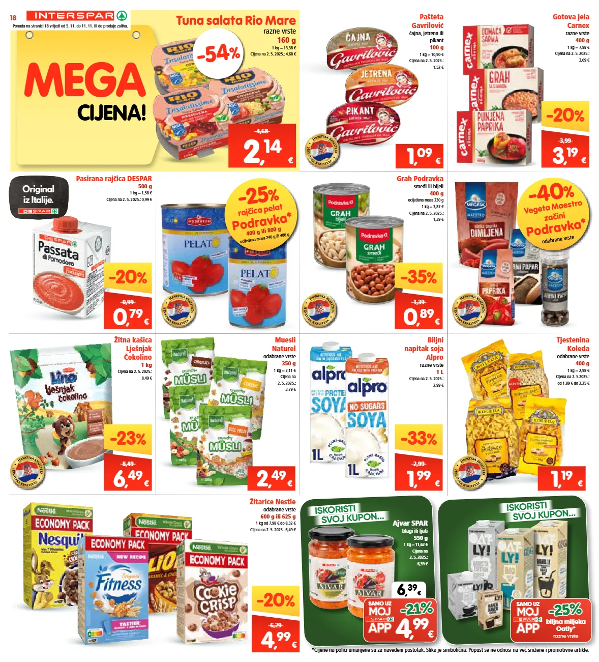 mega cijena!  pašteta gavrilović  čajna, jetrena ili pikant  100 g  1 kg = 10,90 € cijena na 2. 5. 2025.: 1,52 €  grah podravka  smeđi ili bijeli  400 g  ocijeđena masa 230 g 1 kg = 3,87 € cijena na 2. 5. 2025.: 1,39 €  biljni napitak soja alpro  razne vrste  1 l  cijena na 2. 5. 2025.: 2,99 €  pasirana rajčica despar 500 g  1 kg = 1,58 € cijena na 2. 5. 2025.: 0,99 €  žitna kašica lješnjak čokolino 1 kg  cijena na 2. 5. 2025.: 8,49 €  muesli naturel  odabrane vrste  350 g  1 kg = 7,11 € cijena na 2. 5. 2025.: 3,79 €  žitarice nestle  odabrane vrste  600 g ili 625 g  1 kg od 7,98 € do 8,32 € cijena na 2. 5. 2025.: 6,49 €  gotova jela carnex  razne vrste  400 g  1 kg = 7,98 € cijena na 2. 5. 2025.: 3,69 €  tjestenina koleda  odabrane vrste  400 g  1 kg = 2,98 € cijena na 2. 5.2025.: od 1,89 € do 2,25 €  1 , 19   € 2   , 49   € 1 , 09   € 0 , 89   €  1,39  -35 % 1 , 99   €  2,99  -33 % 0 , 79   €  0,99  -20 % 6 , 49   €  8,49  -23 % 4 , 99   €  6,29  -20 % 3 , 19   €  3,99  -20 %  -25 % rajčica pelat podravka*  400 g ili 800 g  ocijeđena masa 240 g ili 480 g   -40 % vegeta maestro začini podravka*  odabrane vrste  h r v a t s k a k v a l i t e t a h r v a t s k a k v a l i t e t a  h r v a t s k a k v a l i t e t a h r v a t s k a k v   a   l i t e t a  h r v a t s k a k v a l i t e t a h r v a t s k   a k v a l i t e t a  h r v a t s k a k v a l i t e t a h r v a t s k a k v a l i t e t a  h r v a t s k a k v a l i t e t a h r v a t s k a k v a l i t e t a  h r v a t s k a k v a l i t e t a h r v a   t s k a k v a l i t e t a  tuna salata rio mare  razne vrste  160 g  1 kg = 13,38 € cijena na 2. 5. 2025.: 4,68 €  -54 %  iskoristi svoj kupon...  2   , 14   €  4,68  iskoristi svoj kupon...  6 , 39 €  samo uz  4 , 99 €  -21% -21%   samo uz  -25% -25%  biljna mlijeka oatly*  razne vrste  ajvar spar  blagi ili ljuti  550 g  1 kg = 11,62 € cijena na 2. 5. 2025.: 6,39 €  ponuda na stranici 18 vrijedi od 5. 11. do 11. 11. ili do prodaje zaliha.  18  *cijene na polici umanjene su za navedeni postotak. slika je simbolična. popust se ne odnosi na već snižene i promotivne artikle.  original iz italije.