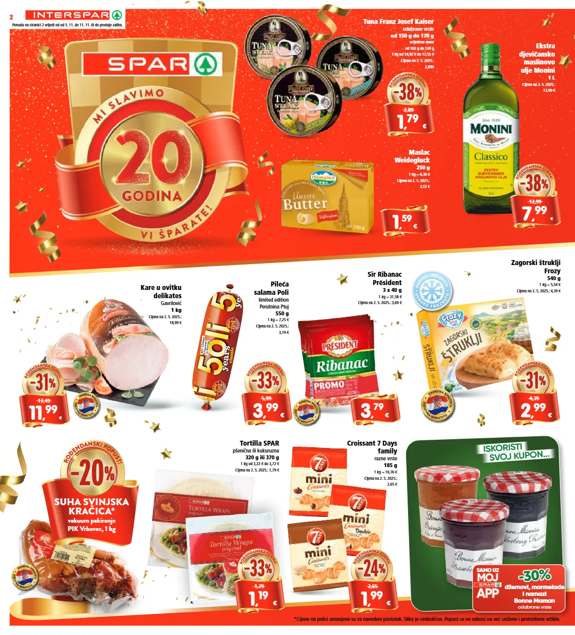 *cijene na polici umanjene su za navedeni postotak. slika je simbolična. popust se ne odnosi na već snižene i promotivne artikle.  iskoristi svoj kupon...  samo uz  -30% -30%  džemovi, marmelade  i namazi bonne   maman  odabrane vrste  r o đ e n d a n s k i p o p u s t !  -20 %  suha svinjska kračica*  vakuum pakiranje pik vrbovec,   1 kg  h r v a t s k a k v a l i t e t a h r v a t s k a k v a l i t e t a  r o đ e n d a n s k a c i j e n a !  -31 %  11   , 99   €  17,49  r o đ e n d a n s k a c i j e n a !  -38 %  7   , 99   €  12,99  r o đ e n d a n s k a c i j e n a !  -24 %  1   , 99   €  2,65  r o đ e n d a n s k a c i j e n a !  -33 %  1   , 19   €  1,79  r o đ e n d a n s k a c i j e n a !  -33 %  3   , 99   €  5,99  r o đ e n d a n s k a c i j e n a !  -38 %  1   , 79   €  2,89  h r v a t s k a k v a l i t e t a h r v a t s k a k   v a l i t e t a  h r v a t s k a k v a l i t e t a h r v a t s k a   k   v   a l i t e t a  h r v a t s k a k v a l i t e t a h r v a t s k a k v a l i t e t a  pileća salama poli  limited edition perutnina ptuj  550 g  1 kg = 7,25 € cijena na 2. 5. 2025.: 3,19 €  3   ,   79   €  1   ,   59   €  sir ribanac président 3 x 40 g  1 kg = 31,58 € cijena na 2. 5. 2025.: 3,69 €  ekstra djevičansko maslinovo ulje monini 1 l  cijena na 2. 5. 2025.: 13,99 €  ponuda na stranici 2 vrijedi od od 5. 11. do 11. 11. ili do prodaje zaliha.  2  kare u ovitku delikates  gavrilović  1 kg  cijena na 2. 5. 2025.: 18,99 €  tuna franz josef kaiser  odabrane vrste  od 150 g do 170 g  ocijeđena masa od 102 g do 120 g 1 kg od 14,92 € do 17,55 € cijena na 2. 5. 2025.: 2,89€  zagorski štruklji frozy 540 g  1 kg = 5,54 € cijena na 2. 5. 2025.: 4,39 €  r o đ e n d a n s k a c i j e n a !  -31 %  2   , 99   €  4,39  tortilla spar  pšenična ili kukuruzna  320 g ili 370 g  1 kg od 3,22 € do 3,72 € cijena na 2. 5. 2025.: 1,79 €  croissant 7 days family  razne vrste  185 g  1 kg = 10,76 € cijena na 2. 5. 2025.: 2,65 €  maslac weidegluck 250 g  1 kg = 6,36 € cijena na 2. 5. 2025.: 2,12 €