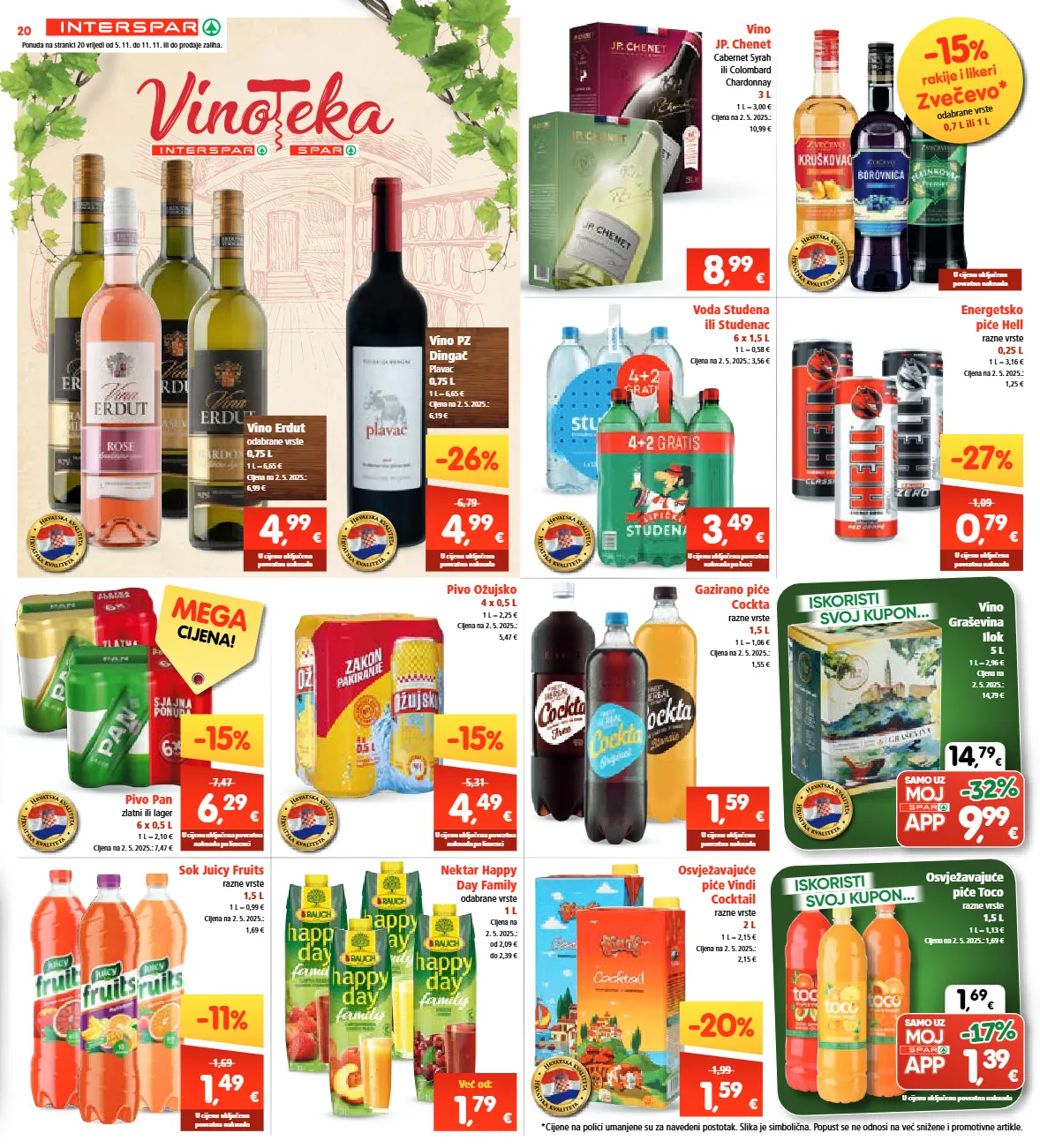 3 , 49   € 4 , 99   € 8 , 99   €  vino erdut  odabrane vrste  0,75 l  1 l = 6,65 € cijena na 2. 5. 2025.: 6,99 €  vino pz dingač  plavac  0,75 l  1 l = 6,65 € cijena na 2. 5. 2025.: 6,19 €  vino jp. chenet  cabernet syrah ili colombard chardonnay  3 l  1 l = 3,00 € cijena na 2. 5. 2025.: 10,99 €  u cijenu uključena povratna naknada u cijenu uključena povratna naknada u cijenu uključena povratna naknada po boci u cijenu uključena povratna naknada po limenci u cijenu uključena povratna naknada po limenci u cijenu uključena povratna naknada u cijenu uključena povratna naknada u cijenu uključena povratna naknada u cijenu uključena povratna naknada  4 , 99   €  6,79  -26 % 6 , 29   €  7,47  -15 % 4 , 49   €  5,31  -15 % 0 , 79   €  1,09  -27 % 1 , 49   €  1,69  -11 % 1 , 59   €  1,99  -20 %  1 , 59   €  h r v a t s k a k v a l i t e t a h r v a t s k a   k v a l i t e t a  h r v a t s k a k v a l i t e t a h r v a t s k a k v a   l i t e t a  h r v a t s k a k v a l i t e t a h r v a t s k   a k v a l i t e t a  h r v a t s k a k v a l i t e t a h r v a t s k   a k v a l i t e t a  h r v a t s k a k v a l i t e t a h r v a t s k a k v   a   l i t e t a  h r v a t s k a k v a l i t e t a h r v a t s k   a k v a l i t e t a  h r v a t s k a k v a l i t e t a h r   v a t s k a k v a l i t e t a  1 , 79   €  već od: pivo pan  zlatni ili lager  6 x 0,5 l  1 l = 2,10 € cijena na 2. 5. 2025.: 7,47 €  pivo ožujsko 4 x 0,5 l  1 l = 2,25 € cijena na 2. 5. 2025.: 5,47 €  energetsko piće hell  razne vrste  0,25 l  1 l = 3,16 € cijena na 2. 5. 2025.: 1,25 €  gazirano piće cockta  razne vrste  1,5 l  1 l = 1,06 € cijena na 2. 5. 2025.: 1,55 €  voda studena ili studenac 6 x 1,5 l  1 l = 0,58 € cijena na 2. 5. 2025.: 3,56 €  sok juicy fruits  razne vrste  1,5 l  1 l = 0,99 € cijena na 2. 5. 2025.: 1,69 €  osvježavajuće piće vindi cocktail  razne vrste  2 l  1 l = 2,15 € cijena na 2. 5. 2025.: 2,15 €  nektar happy day family  odabrane vrste  1 l  cijena na 2. 5. 2025.: od 2,09 € do 2,39 €  -15 % rakije i likeri zvečevo*  odabrane vrste  0,7 l ili 1 l  u cijenu uključena povratna naknada  mega cijena!  ponuda na stranici 20 vrijedi od 5. 11. do 11. 11. ili do prodaje zaliha.  20  *cijene na polici umanjene su za navedeni postotak. slika je simbolična. popust se ne odnosi na već snižene i promotivne artikle.  1 , 69 €  samo uz  1 , 39 €  -17% -17%  iskoristi svoj kupon...  osvježavajuće piće toco  razne vrste  1,5 l  1 l = 1,13 € cijena na 2. 5. 2025.: 1,69 €  vino graševina ilok 5 l  1 l = 2,96 € cijena na 2. 5. 2025.: 14,79 €  14 , 79 €  samo uz  9 , 99 €  -32% -32%  h r v a t s k a k v a l i t e t a h r v a   t s k a k v a l i t e t a  iskoristi svoj kupon...  u cijenu uključena povratna naknada