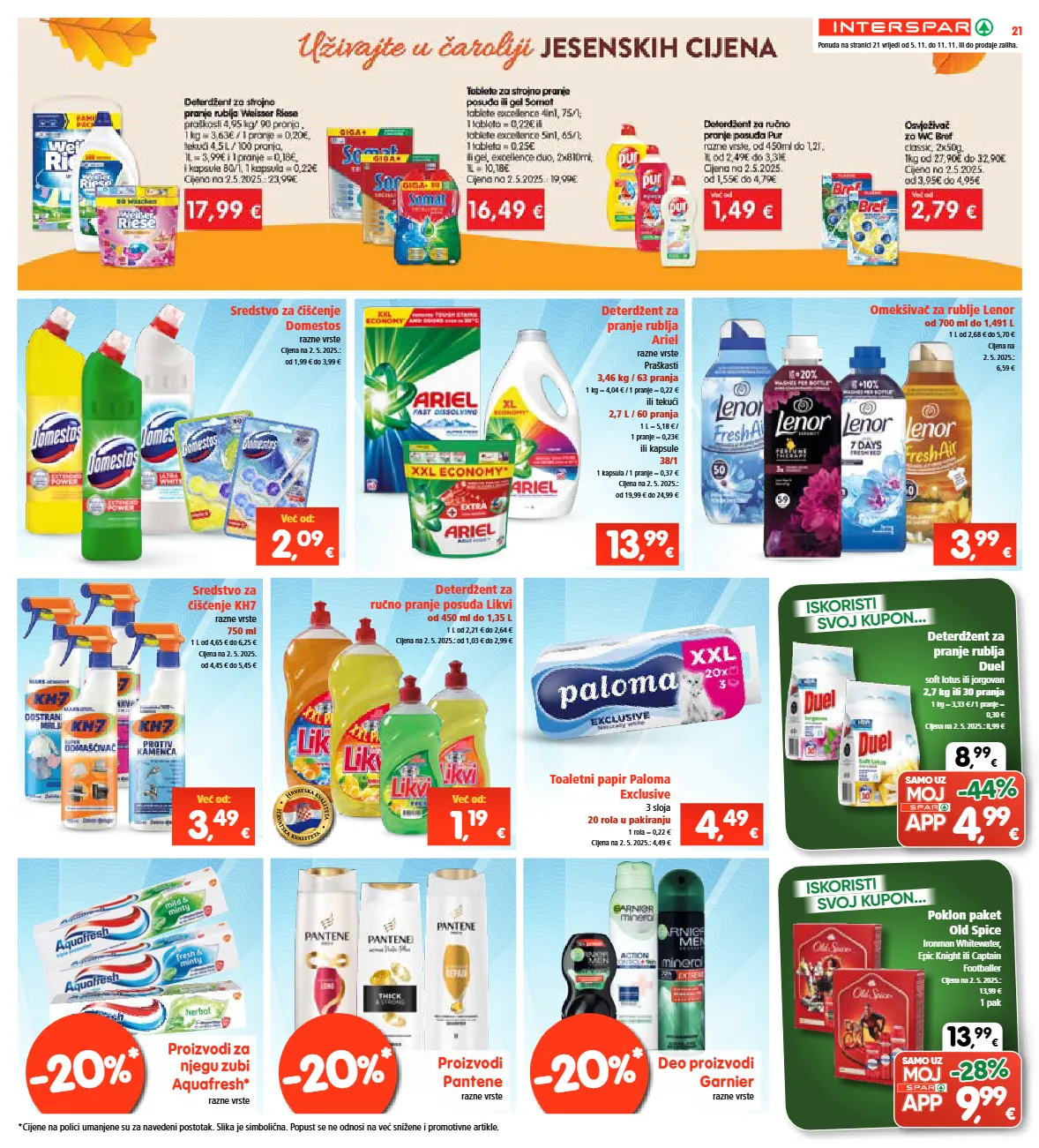 deterdžent za ručno pranje posuđa likvi od 450 ml do 1,35 l  1 l od 2,21 € do 2,64 € cijena na 2. 5. 2025.: od 1,03 € do 2,99 €  sredstvo za čišćenje kh7  razne vrste  750 ml  1 l od 4,65 € do 6,25 € cijena na 2. 5. 2025. od 4,45 € do 5,45 €  toaletni papir paloma exclusive  3 sloja  20 rola u pakiranju  1 rola = 0,22 € cijena na 2. 5. 2025.: 4,49 €  omekšivač za rublje lenor od 700 ml do 1,491 l  1 l od 2,68 € do 5,70 € cijena na 2. 5. 2025.: 6,59 €  13 , 99 €   3 , 99   € 4 , 49   €  proizvodi za njegu zubi aquafresh*  razne vrste  proizvodi pantene  razne vrste  deo proizvodi garnier  razne vrste -20 % *  -20 % *  -20 % *  h r v a t s k a k v a l i t e t a h r v a t s k   a k v a l i t e t a  u cijenu uključena povratna naknada u cijenu uključena povratna naknada 1 , 19   €  već od:  2   , 09   €  već od:  3 , 49   €  već od: deterdžent za pranje rublja ariel  razne vrste praškasti  3,46 kg / 63 pranja  1 kg = 4,04 € / 1 pranje = 0,22 € ili tekući  2,7 l / 60 pranja  1 l = 5,18 € / 1 pranje = 0,23€ ili kapsule  38/1  1 kapsula / 1 pranje = 0,37 € cijena na 2. 5. 2025.: od 19,99 € do 24,99 €  sredstvo za čišćenje domestos  razne vrste cijena na 2. 5. 2025.: od 1,99 € do 3,99 €  ponuda na stranici 21 vrijedi od 5. 11. do 11. 11. ili do prodaje zaliha.  21  *cijene na polici umanjene su za navedeni postotak. slika je simbolična. popust se ne odnosi na već snižene i promotivne artikle.  iskoristi svoj kupon...  iskoristi svoj kupon...  poklon paket old spice  ironman whitewater, epic knight ili captain footballer cijena na 2. 5. 2025.: 13,99 € 1 pak  deterdžent za pranje rublja duel  soft lotus ili jorgovan  2,7 kg ili 30 pranja  1 kg = 3,33 € / 1 pranje = 0,30 € cijena na 2. 5. 2025.: 8,99 €  13 , 99 €  samo uz  9 , 99 €  -28% -28%  8 , 99 €  samo uz  4 , 99 €  -44% -44%