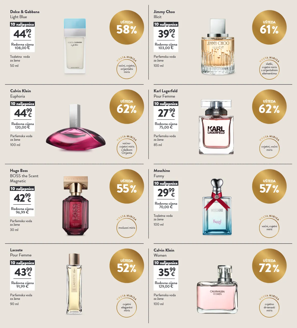 UŠTEDA  58   %  UŠTEDA  62   %  UŠTEDA  55   %  UŠTEDA  52   %  UŠTEDA  61   %  UŠTEDA  62   %  UŠTEDA  57   %  UŠTEDA  72   %  Toaletna voda za žene 50 ml  Dolce & Gabbana  Light Blue  44 99 10 naljepnica  Redovna cijena 108,00 €  €  Parfemska voda za žene 100 ml  Jimmy Choo  Illicit  39 99 10 naljepnica  Redovna cijena 103,00 €  €  Parfemska voda za žene 85 ml  Karl Lagerfeld  Pour Femme  27   99 10 naljepnica  Redovna cijena 75,00 €  €  Parfemska voda za žene 100 ml  Calvin Klein  Euphoria  44 99 10 naljepnica  Redovna cijena 120,00 €  €  V R S T A M I R I S A  mošusni miris Parfemska voda za žene 30 ml  Hugo Boss  BOSS the Scent Magnetic  42 99 10 naljepnica  Redovna cijena 96,99 €  €  V R S T A M I R I S A  voćni, cvjetni miris Toaletna voda za žene 100 ml  Moschino  Funny  29 99 10 naljepnica  Redovna cijena 70,00 €  €  V R S T A M I R I S A  cvjetni elegantni miris Parfemska voda za žene 90 ml  Lacoste  Pour Femme  43 99 10 naljepnica  Redovna cijena 91,99 €  €  V R S T A M I R I S A  cvjetno drvenasti miris Parfemska voda za žene 100 ml  Calvin Klein  Women  35 99 10 naljepnica  Redovna cijena 129,00 €  €  V R S T A M I R I S A  voćni, cvjetni, orijentalni miris  V R S T A M I R I S A  slatki, cvjetni miris s orijentalnim elementima  V R S T A M I R I S A  cvjetni, voćni miris  V R S T A M I R I S A  voćno- cvjetni miris s daškom Orijenta