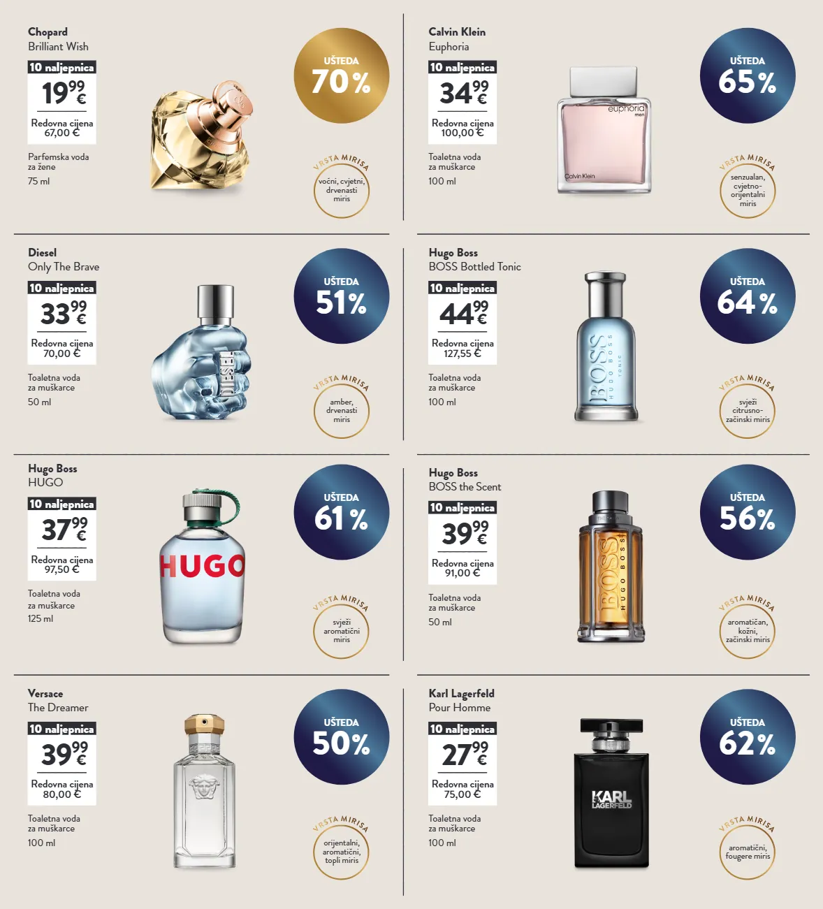 UŠTEDA  51   %  UŠTEDA  50   %  UŠTEDA  64   %  UŠTEDA  62   %  UŠTEDA  70   %  UŠTEDA  61   %  UŠTEDA  65   %  UŠTEDA  56   %  V R S T A M I R I S A  voćni, cvjetni, drvenasti miris Parfemska voda za žene 75 ml  Chopard  Brilliant Wish  19 99 10 naljepnica  Redovna cijena 67,00 €  €  V R S T A M I R I S A  senzualan, cvjetno- orijentalni miris Toaletna voda za muškarce 100 ml  Calvin Klein  Euphoria  34 99 10 naljepnica  Redovna cijena 100,00 €  €  V R S T A M I R I S A  amber, drvenasti miris Toaletna voda za muškarce 50 ml  Diesel  Only The Brave  33 99 10 naljepnica  Redovna cijena 70,00 €  €  V R S T A M I R I S A  svježi citrusno- začinski miris Toaletna voda za muškarce 100 ml  Hugo Boss  BOSS Bottled Tonic  44 99 10 naljepnica  Redovna cijena 127,55 €  €  V R S T A M I R I S A  aromatičan, kožni, začinski miris Toaletna voda za muškarce 50 ml  Hugo Boss  BOSS the Scent  39 99 10 naljepnica  Redovna cijena 91,00 €  €  V R S T A M I R I S A  orijentalni, aromatični, topli miris Toaletna voda za muškarce 100 ml  Versace  The Dreamer  39 99 10 naljepnica  Redovna cijena 80,00 €  €  V R S T A M I R I S A  aromatični, fougere miris Toaletna voda za muškarce 100 ml  Karl Lagerfeld  Pour Homme  27   99 10 naljepnica  Redovna cijena 75,00 €  €  V R S T A M I R I S A  svježi aromatični miris  Hugo Boss  HUGO  37   99 10 naljepnica  Redovna cijena 97,50 €  €  Toaletna voda za muškarce 125 ml