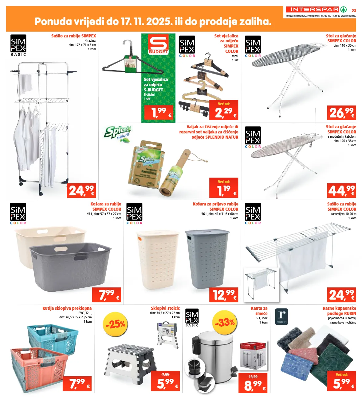 stol za glačanje simpex color  dim: 110 x 30 cm 1 kom  sušilo za rublje simpex  4 razine, dim: 172 x 71 x 5 cm 1 kom  set vješalica za odjeću simpex color  razni 1 set  košara za prljavo rublje simpex color  56 l, dim: 42 x 31,6 x 60 cm 1 kom  stol za glačanje simpex color  s produžnim kabelom dim: 120 x 38 cm 1 kom  sušilo za rublje simpex color  rastezljivo 10-20 m 1 kom  košara za rublje simpex color  45 l, dim: 57 x 37 x 27 cm 1 kom  sklopivi stolčić  dim: 34,5 x 27 x 22 cm 1 kom  kutija sklopiva preklopna  pvc, 32 l, dim: 48,5 x 35 x 23,5 cm 1 kom  valjak za čišćenje odjeće ili rezervni set valjaka za čišćenje odjeće splendid natur razne kupaonske podloge rubin  pojedinačne ili setovi, razne boje i veličine  44 , 99 € 26 , 99 € 24 , 99 €  set vješalica za odjeću s-budget  8-dijelni 1 set  1 , 99   € 7 , 99   € 12   , 99 € 7 , 99   €  kanta za smeće  5 l, inox 1 kom  24 , 99 €  ponuda na stranici 23 vrijedi od x. x. do x. x. ili do prodaje zalih ponuda na stranici 23 vrijedi od 5. 11. do 17. 11. ili do prodaje zaliha.  23 ponuda vrijedi do 17. 11. 2025. ili do prodaje zaliha.  -33 %  -25 % 5 , 99   €  7,99  8 , 99   €  13,59  2   , 29   €  već od:  1 , 19   €  već od:  5 , 99   €  već od: