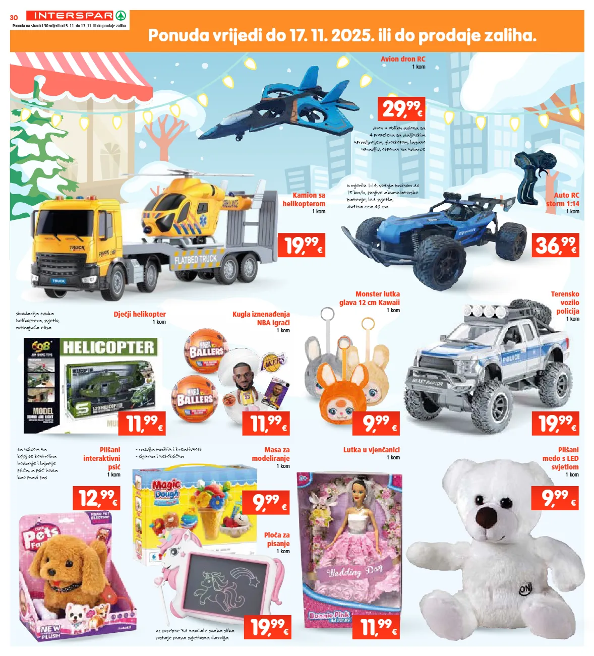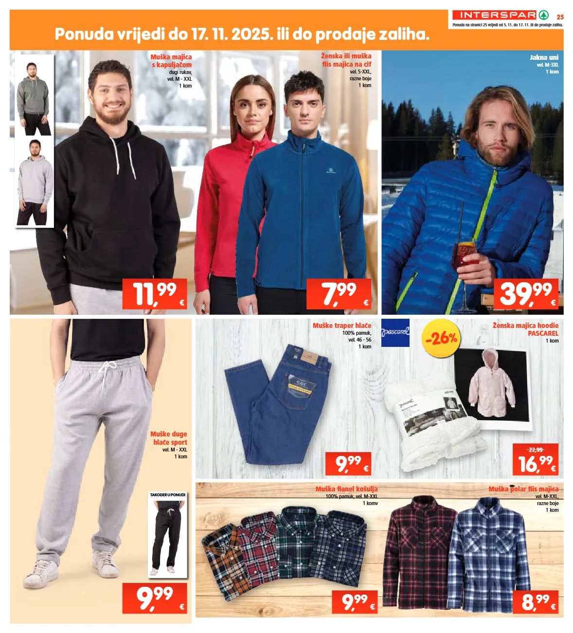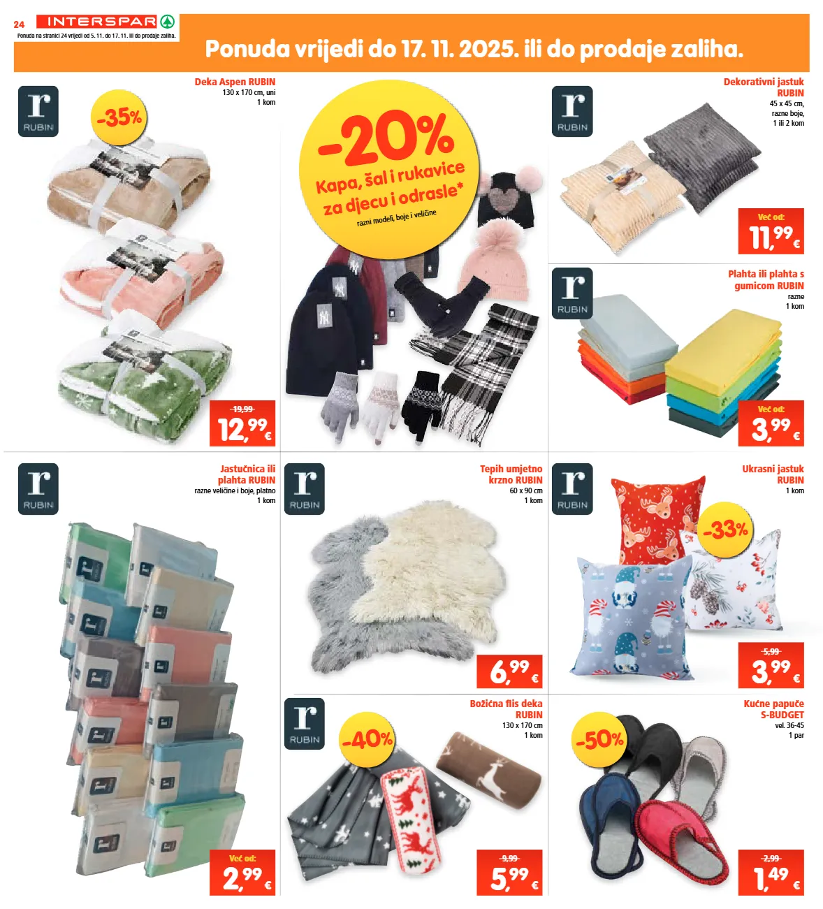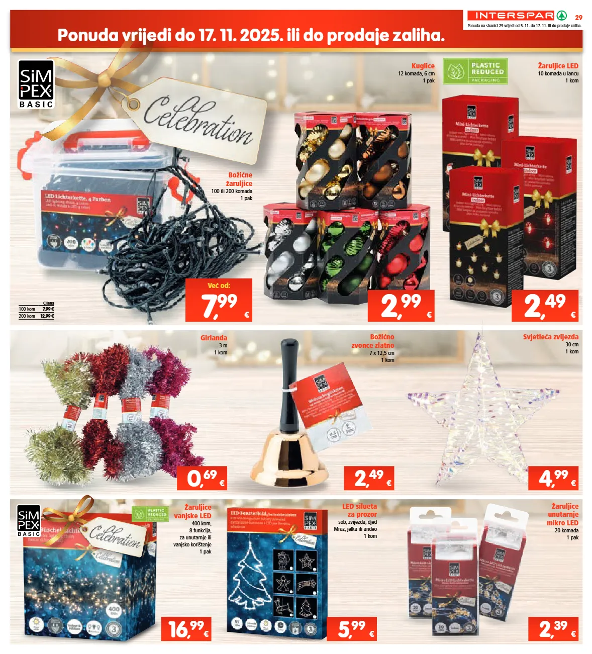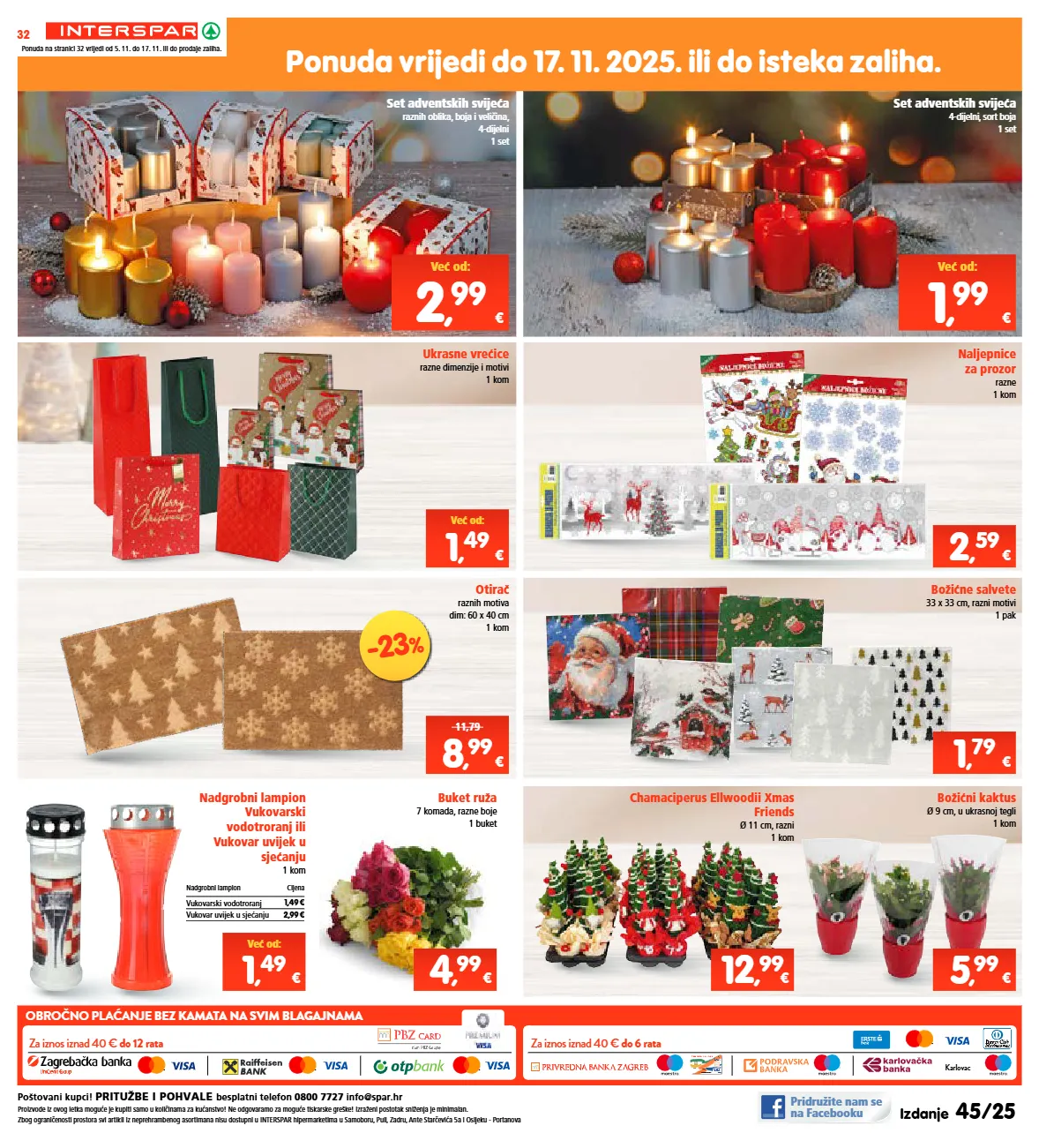 poπtovani kupci!   prituæbe i pohvale   besplatni telefon   0800 7727   info@spar.hr  proizvode iz ovog letka moguće je kupiti samo u količinama za kućanstvo! ne odgovaramo za moguće tiskarske greške! izraženi postotak sniženja je minimalan. zbog ograničenosti prostora svi artikli iz neprehrambenog asortimana nisu dostupni u interspar hipermarketima u samoboru, puli, zadru, ante starčevića 5a i osijeku - portanova  obročno plaćanje   bez kamata na svim blagajnama  karlovac debit electronic use only  4574 vrijedi do valid thru  kontakt centar tel. + 385 1 4891 333 molimo nalaznika ove kartice da ju uruči najbližoj poslovnici banke.  ova kartica je vlasništvo privredne banke zagreb d.d. this card is the property of privredna banka zagreb d.d., radnička cesta 50, 10000 zagreb, croatia, and must be returned upon request. potpis   authorized signature - not valid unless signed  za iznos iznad 40 €   do 12 rata   za iznos iznad 40 €   do 6 rata  pridružite nam se na facebooku ponuda na stranici 32 vrijedi od x. x. do x. x. ili do prodaje zaliha. ponuda na stranici 32 vrijedi od 8. 1. do 21. 1. ili do prodaje zaliha.  32 izdanje   45/25  ponuda na stranici 32 vrijedi od x. x. do x. x. ili do prodaje zaliha. ponuda na stranici 32 vrijedi od 5. 11. do 17. 11. ili do prodaje zaliha.  32 ponuda vrijedi do 17. 11. 2025. ili do isteka zaliha.  set adventskih svijeća  raznih oblika, boja i veličina, 4-dijelni 1 set  otirač  raznih motiva dim: 60 x 40 cm 1 kom  chamaciperus ellwoodii xmas friends  ø 11 cm, razni 1 kom  nadgrobni lampion vukovarski vodotroranj ili vukovar uvijek u sjećanju  1 kom  božićni kaktus  ø 9 cm, u ukrasnoj tegli 1 kom  božićne salvete  33 x 33 cm, razni motivi 1 pak  naljepnice za prozor  razne 1 kom  ukrasne vrećice  razne dimenzije i motivi 1 kom  set adventskih svijeća  4-dijelni, sort boja 1 set  12   , 99 €   5 , 99   € 1 , 79   € 4 , 99   € 2   , 59   €  buket ruža  7 komada, razne boje 1 buket nadgrobni lampion   cijena vukovarski vodotroranj   1,49 €  vukovar uvijek u sjećanju   2,99 €  2   , 99   €  već od:  1 , 99   €  već od:  -23 %  1 , 49   €  već od:  1 , 49   €  već od:  8 , 99   €  11,79