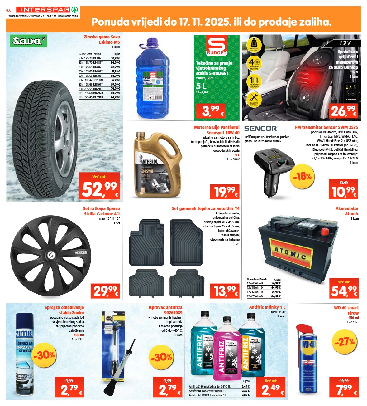 sprej za odleđivanje stakla zimko  pouzdano i brzo skida led sa vjetrobranskog stakla te sprječava ponovno zaleđivanje  400 ml  1 l = 6,98 €  wd 40 smart straw 450 ml  1 l = 17,76 €  antifriz infinity 1 l  razne vrste 1 kom  zimska guma sava eskimo ms  1 kom  set gumenih tepiha za auto uni t4 4 tepiha u setu , univerzalna veličina, prednji tepisi 70 x 45,5 cm, stražnji tepisi 45 x 43,5 cm, lako održavanje, visoki stupanj otpornosti na habanje 1 set  akumulatori atomic   cijena 12v-45ah +d   54,99 €  12v-55ah +d   64,99 €  12v-60ah +d   74,99 €  12v-75ah +d   84,99 €  akumulator atomic  1 kom  motorno ulje pantherol semisynt 10w-40  idealno za motore sa ili bez turbopunjača, benzinskih ili dizelskih putničkih automobila te lakih gospodarskih vozila  4 l  1 l = 5,00 €  ispitivač antifriza 90261089  • može se mjeriti hladan i topli antifriz • mjerno područje od 0 do - 40° c, 1 kom  fm transmiter sencor swm 3535  podrška: bluetooth, usb flash disk, tf kartica, mp3, wma, flac, wav i handsfree, 2 x usb utor, utor za tf / micro sd karticu (do 32gb), bluetooth v4.2, bežični handsfree, prijenosni raspon fm frekvencije: 87,5 - 108 mhz, snaga: dc 12/24 v 1 kom gume sava eskimo   cijena s3+ 175/70 r13 82t   53,99 €  s3+ 165/70 r14 81t   54,99 €  s3+ 175/65 r14 82t   52,99 €  s3+ 185/60 r14 82t   57,99 €  s3+ 185/65 r15 88t   58,99 €  s3+ 185/60 r15 84t   57,99 €  s3+ 195/65 r15 91t   59,99 €  s3+ 205/55 r16 91t   74,99 €  hp2 205/60 r16 92h   84,99 €  hp2 225/45 r17 91h   94,99 €  tekućina za pranje vjetrobranskog stakla s-budget  zimska, -25°c  5 l 1 l = 0,80 €  sjedalica s grijačem i masažerom za auto dunlop  12 v 1 kom  bežično prenosi telefonske pozive i glazbu na auto radio sustav  19 , 99 € 13 , 99 € 26 , 99 € 3 , 99   € 29 , 99 €  set ratkapa sparco sicilia carbone 4/1  crne, 15” ili 16” 1 set  ponuda na stranici 26 vrijedi od x. x. do x. x. ili do prodaje zaliha. ponuda na stranici 26 vrijedi od 5. 11. do 17. 11. ili do prodaje zaliha.  26 ponuda vrijedi do 17. 11. 2025. ili do prodaje zaliha.  52   , 99 €  već od:  10 , 99 €  13,49  2   , 79   €  3,99  2   , 79   €  3,99  7 , 99   €  10,99  -18 %  -30 %  -30 %  -27 %  54 , 99 €  već od:  2   , 49   €  već od: cijena antifriz z-50 mješavina do -36°c 1l   2,49 €  antifriz nf koncentrat hybrid 1l   3,69 €  antifriz al extra koncentrat 1l   3,89 €