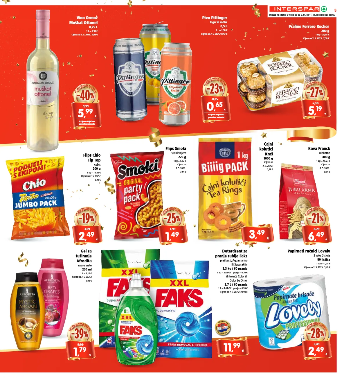 flips chio tip top  cubis  200 g  1 kg = 12,45 € cijena na 2. 5. 2025.: 3,29 €  r o đ e n d a n s k a c i j e n a !  -40 %  5   , 99   €  9,99  u cijenu uključena povratna naknada  r o đ e n d a n s k a c i j e n a !  -23 %  0   , 65   €  0,85  u cijenu uključena povratna naknada  r o đ e n d a n s k a c i j e n a !  -39 %  1   , 79   €  2,95  r o đ e n d a n s k a c i j e n a !  -21 %  6   , 49   €  8,29  r o đ e n d a n s k a c i j e n a !  -28 %  2   , 49   €  3,49  r o đ e n d a n s k a c i j e n a !  -25 %  1   , 49   €  1,99  r o đ e n d a n s k a c i j e n a !  -19 %  2   , 49   €  3,09  r o đ e n d a n s k a c i j e n a !  -27 %  5   , 19   €  7,19  h r v a t s k a k v a l i t e t a h r v a t s k a k v a l i t e t a  vino ormož muškat ottonel 0,75 l  1 l = 7,99 € cijena na 2. 5. 2025.: 9,99 €  pivo pittinger  lager ili radler  0,5 l  1 l = 1,30 € cijena na 2. 5. 2025.: 0,92 €  papirnati ručnici lovely  2 role, 3 sloja  80 listića  1 rola = 1,25 € cijena na 2. 5. 2025.: 3,49 €  deterdžent za pranje rublja faks  praškasti, aquamarine ili superaktiv  3,3 kg / 60 pranja  1 kg = 3,63 € / 1 pranje = 0,20 € ili tekući, color ili color by ornel  2,7 l / 60 pranja  1 l = 4,44 € / 1 pranje = 0,20 € cijena na 2. 5. 2025.: 20,99 €  gel za tuširanje afrodita  razne vrste  250 ml  1 l = 7,16 € cijena na 2. 5. 2025.: 2,95 €  kava franck  jubilarna  400 g  1 kg = 16,23 € cijena na 2. 5. 2025.: 8,49 €  čajni kolutići kraš 1000 g  cijena na 2. 5. 2025.: 3,49 €  flips smoki  s kikirikijem  225 g  1 kg = 6,62 € cijena na 2. 5. 2025.: 2,19 €  praline ferrero rocher 200 g  1 kg = 25,95 € cijena na 2. 5. 2025.: 7,59 €  3   , 49   €  11   , 99   €  ponuda na stranici 3 vrijedi od od 5. 11. do 11. 11. ili do prodaje zaliha.  3