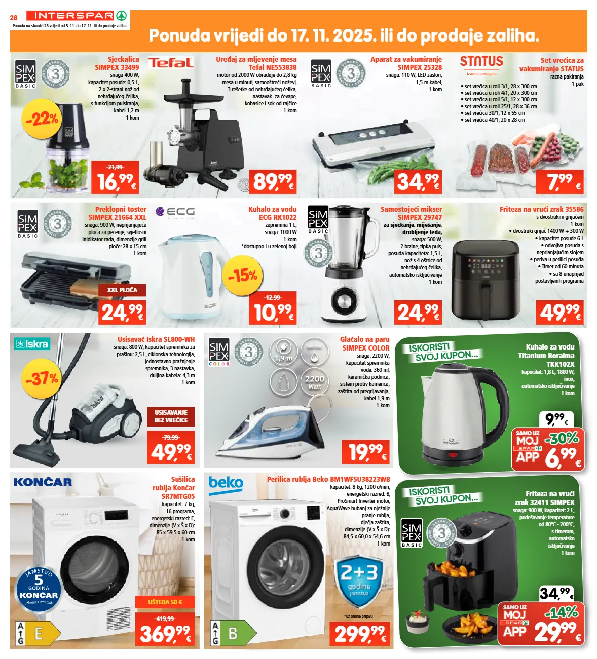perilica rublja beko bm1wfsu38223wb  kapacitet: 8 kg, 1200 o/min, energetski razred: b, prosmart inverter motor, aquawave bubanj za nježnije pranje rublja, dječja zaštita, dimenzije (v x š x d): 84,5 x 60,0 x 54,6 cm 1 kom *uz online prijavu  glačalo na paru simpex color  snaga: 2200 w, kapacitet spremnika vode: 360 ml, keramička podnica, sistem protiv kamenca, zaštita od pregrijavanja, kabel 1,9 m 1 kom  friteza na vrući zrak 35586  s dvostrukim grijačem 1 kom • dvostruki grijač 1400 w + 300 w • kapacitet posude 6 l • odvojiva posuda s neprianjajućim slojem • periva u perilici posuđa • timer od 60 minuta • sa 8 unaprijed postavljenih programa  aparat za vakumiranje simpex 25328  snaga: 110 w, led zaslon, 1,5 m kabel, 1 kom  usisavač iskra sl800-wh  snaga: 800 w, kapacitet spremnika za prašinu: 2,5 l, ciklonska tehnologija, jednostavno pražnjenje spremnika, 3 nastavka, duljina kabela: 4,3 m 1 kom  preklopni toster simpex 21664 xxl  snaga: 900 w, neprijanjajuća ploča za pečenje, svjetlosni inidikator rada, dimenzije grill ploče: 28 x 15 cm 1 kom  uređaj za mljevenje mesa tefal ne553838  motor od 2000 w obrađuje do 2,8 kg mesa u minuti, samooštreći noževi, 3 rešetke od nehrđajućeg ćelika, nastavak za ćevape, kobasice i sok od rajčice 1 kom  kuhalo za vodu ecg rk1022  zapremina 1 l, snaga: 1000 w 1 kom *dostupno i u zelenoj boji  samostojeći mikser simpex 29747 za sjeckanje, miješanje, drobljenje leda,  snaga: 500 w, 2 brzine, tipka puls, posuda kapaciteta: 1,5 l, nož s 4 oštrice od nehrđajućeg čelika, automatsko isključivanje 1 kom  xxl ploča  usisavanje bez vrećice  sjeckalica simpex 33499  snaga 400 w, kapacitet posude: 0,5 l, 2 x 2-strani nož od nehrđajućeg čelika, s funkcijom pulsiranja, kabel 1,2 m 1 kom  24 , 99 € 89 , 99 €   34 , 99 € 49 , 99 € 19 , 99 € 24 , 99 € 299 , 99 €  sušilica rublja končar sr7mtg05  kapacitet: 7 kg, 16 programa, energetski razred: e, dimenzije (v x š x d): 85 x 59,5 x 60 cm 1 kom  ušteda 50 €  369 , 99 €  419,99  iskoristi svoj kupon...  iskoristi svoj kupon...  9 , 99 €  samo uz  6 , 99 €  -30% -30%  34 , 99 €  samo uz  29 , 99 €  -14% -14%  kuhalo za vodu titanium roraima tkk102x  kapacitet: 1,8 l, 1800 w, inox, automatsko isključivanje 1 kom  friteza na vrući zrak 32411 simpex  snaga: 900 w, kapacitet: 2 l, podešavanje temperature od 80ºc - 200ºc, s timerom, automatsko isključivanje 1 kom naljepnica sa napustom od 2mm m1:1  set vrećica za vakumiranje status  razna pakiranja 1 pak • set vrećica u roli 3/1, 28 x 300 cm • set vrećica u roli 4/1, 20 x 300 cm • set vrećica u roli 5/1, 12 x 300 cm • set vrećica u roli 25/1, 28 x 36 cm • set vrećica 30/1, 12 x 55 cm • set vrećica 40/1, 20 x 28 cm  7 , 99   €  ponuda na stranici 28 vrijedi od x. x. do x. x. ili do prodaje zaliha. ponuda na stranici 28 vrijedi od 5. 11. do 17. 11. ili do prodaje zaliha.  28 ponuda vrijedi do 17. 11. 2025. ili do prodaje zaliha.  10 , 99 €  12,99  16 , 99 €  21,99  49 , 99 €  79,99  -15 %  -22 %  -37 %