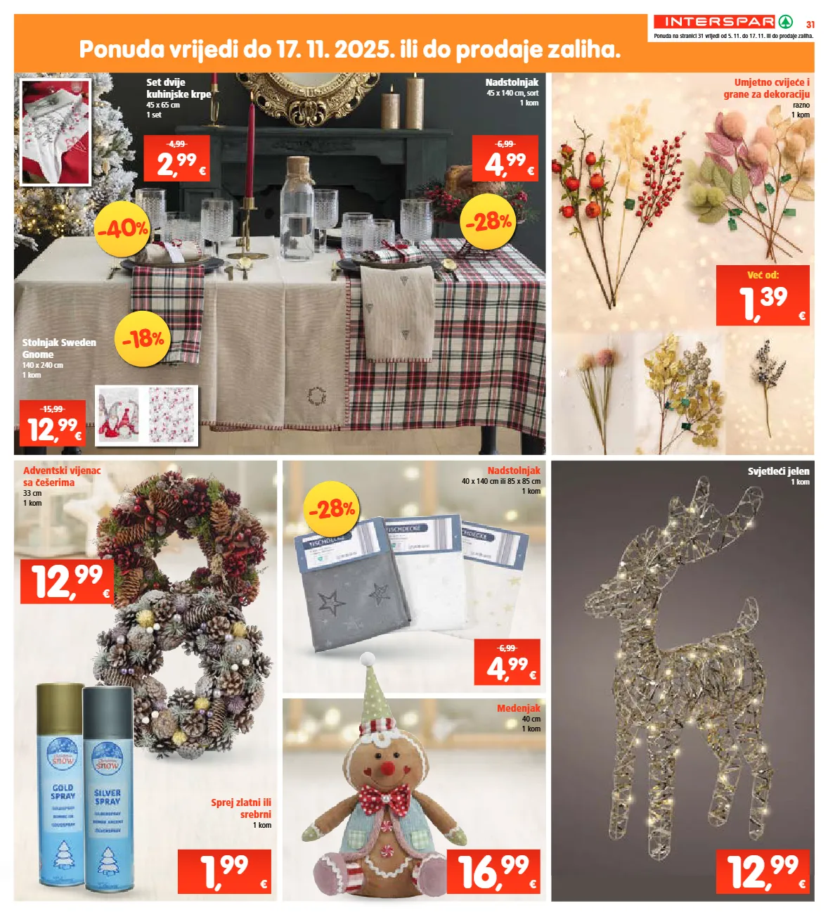 sprej zlatni ili srebrni  1 kom  svjetleći jelen  1 kom  stolnjak sweden gnome  140 x 240 cm 1 kom  nadstolnjak  40 x 140 cm ili 85 x 85 cm 1 kom  umjetno cvijeće i grane za dekoraciju  razno 1 kom  set dvije kuhinjske krpe  45 x 65 cm 1 set  nadstolnjak  45 x 140 cm, sort 1 kom  medenjak  40 cm 1 kom  adventski vijenac sa češerima  33 cm 1 kom  ponuda na stranici 31 vrijedi od x. x. do x. x. ili do prodaje zalih ponuda na stranici 31 vrijedi od 5. 11. do 17. 11. ili do prodaje zaliha.  31  ponuda vrijedi do 17. 11. 2025. ili do prodaje zaliha. 12   , 99 €  15,99  4 , 99   €  6,99  4 , 99   €  6,99  2   , 99   €  4,99  -18 %  -28 %  -40 %  -28 %  1 , 39   €  već od:  12   , 99   € 12   , 99   € 1 , 99   €   16 , 99   €