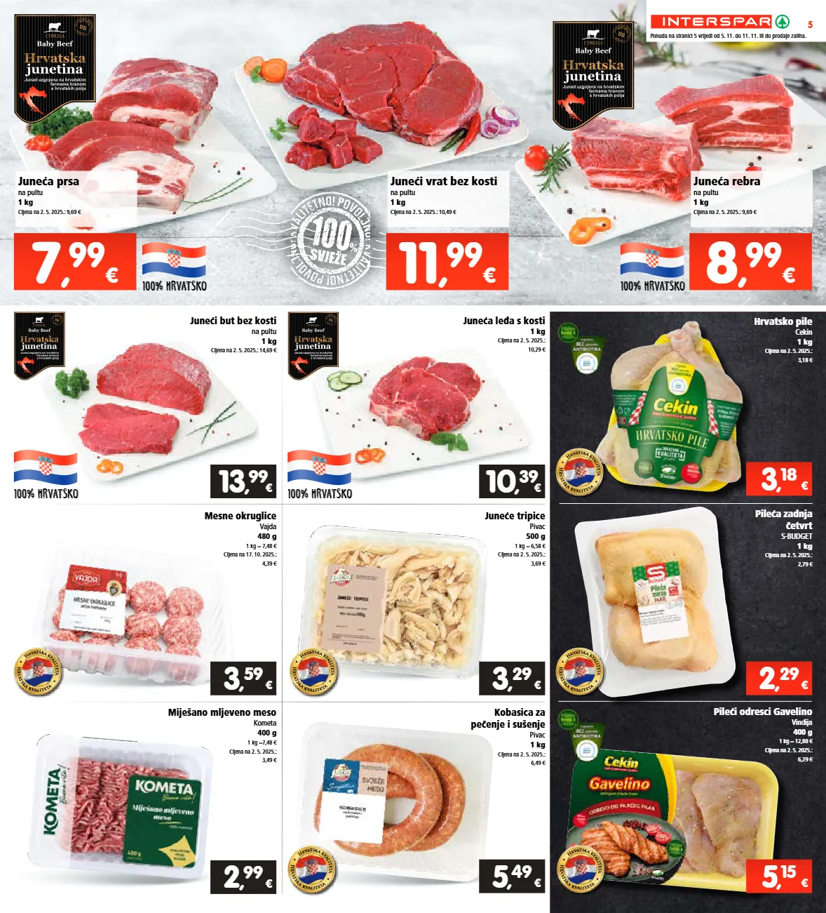 hrvatsko pile  cekin  1 kg  cijena na 2. 5. 2025.: 3,18 €  pileća zadnja četvrt  s-budget  1 kg  cijena na 2. 5. 2025.: 2,79 €  pileći odresci gavelino  vindija  400 g  1 kg = 12,88 € cijena na 2. 5. 2025.: 6,29 €  3 , 18   € 2   , 29   € 5 , 15   €  miješano mljeveno meso  kometa  400 g  1 kg =7,48 € cijena na 2. 5. 2025.: 3,49 €  kobasica za pečenje i sušenje  pivac  1 kg  cijena na 2. 5. 2025.: 6,49 €  juneće tripice  pivac  500 g  1 kg = 6,58 € cijena na 2. 5. 2025.: 3,69 €  juneći but bez kosti  na pultu  1 kg  cijena na 2. 5. 2025.: 14,69 €  juneća leđa s kosti 1 kg  cijena na 2. 5. 2025.: 10,29 €  mesne okruglice  vajda  480 g  1 kg = 7,48 € cijena na 17. 10. 2025.: 4,39 €  juneći vrat bez kosti  na pultu  1 kg  cijena na 2. 5. 2025.: 10,49 €  11   , 99   €  juneća rebra  na pultu  1 kg  cijena na 2. 5. 2025.: 9,69 €  8   , 99   €  juneća prsa  na pultu  1 kg  cijena na 2. 5. 2025.: 9,69 €  7   , 99   € 13 , 99 €   10 , 39 € 3 , 59   €   3 , 29   € 2   , 99   €  100% hrvatsko   100% hrvatsko  100% hrvatsko   100% hrvatsko  h r v a t s k a k v a l i t e t a h r v a t s k a k v   a   l i t e t a  h r v a t s k a k v a l i t e t a h r v a t s k a k v a l i t e t a  h r v a t s k a k v a l i t e t a h r v a   t s k a k v a l i t e t a  h r v a t s k a k v a l i t e t a h r v a t s   k a k v a l i t e t a  h r v a t s k a k v a l i t e t a h r   v a t s k a k v a l i t e t a  h r v a t s k a k v a l i t e t a h r v a t s k a k v a l i t e t a  5 , 49   €  ponuda na stranici 5 vrijedi od 5. 11. do 11. 11. ili do prodaje zaliha.  5