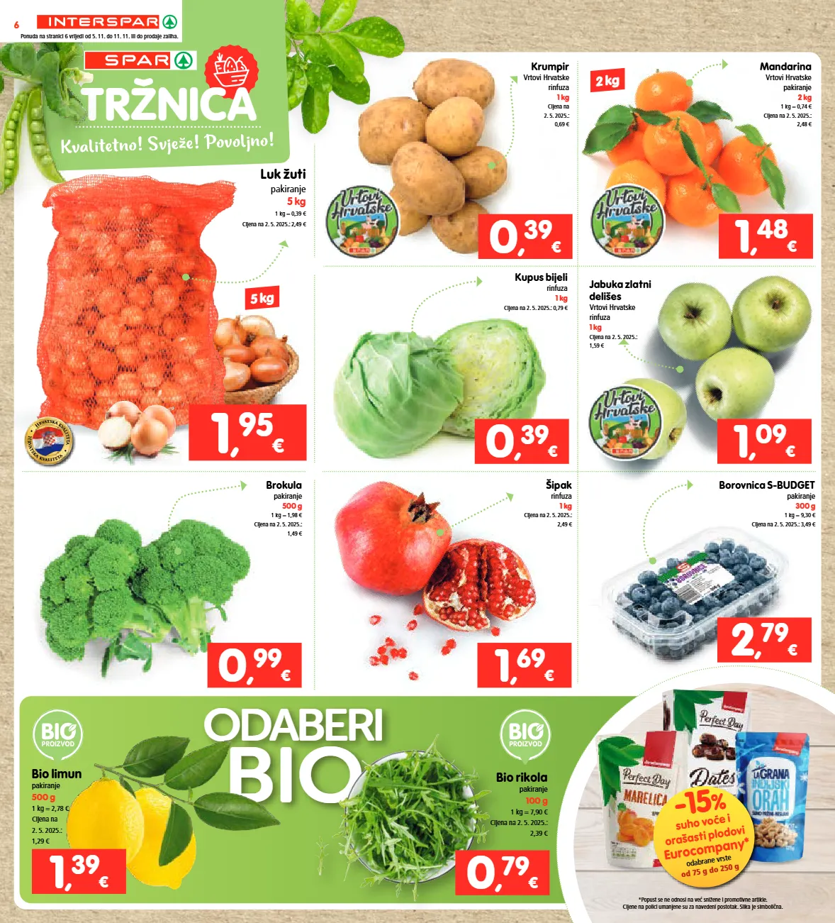tržnica  odaberi bio  *popust se ne odnosi na već snižene i promotivne artikle. cijene na polici umanjene su za navedeni postotak. slika je simbolična.  1   , 95 € 1   , 48 € 1   , 69 € 0   , 99 € 0   , 39 € 0   , 39 € 2   , 79 € 1   , 09 € luk žuti  pakiranje  5 kg  1 kg = 0,39 € cijena na 2. 5. 2025.: 2,49 €  mandarina  vrtovi hrvatske pakiranje  2 kg  1 kg = 0,74 € cijena na 2. 5. 2025.: 2,48 €  šipak  rinfuza  1 kg  cijena na 2. 5. 2025.: 2,49 €  brokula  pakiranje  500 g  1 kg = 1,98 € cijena na 2. 5. 2025.: 1,49 €  kupus bijeli  rinfuza  1 kg  cijena na 2. 5. 2025.: 0,79 €  krumpir  vrtovi hrvatske rinfuza  1 kg  cijena na 2. 5. 2025.: 0,69 €  borovnica s-budget  pakiranje  300 g  1 kg = 9,30 € cijena na 2. 5. 2025.: 3,49 €  jabuka zlatni delišes  vrtovi hrvatske rinfuza  1 kg  cijena na 2. 5. 2025.: 1,59 €  h r v a t s k a k v a l i t e t a h r v a t s k a k v a   l i t e t a  0   , 79 € 1   , 39 € bio limun  pakiranje  500 g  1 kg = 2,78 € cijena na 2. 5. 2025.: 1,29 €  bio rikola  pakiranje  100 g  1 kg = 7,90 € cijena na 2. 5. 2025.: 2,39 €  -15 % suho voće i orašasti plodovi eurocompany*  odabrane vrste  od 75 g do 250 g  2 kg  5 kg  ponuda na stranici 6 vrijedi od 5. 11. do 11. 11. ili do prodaje zaliha.  6