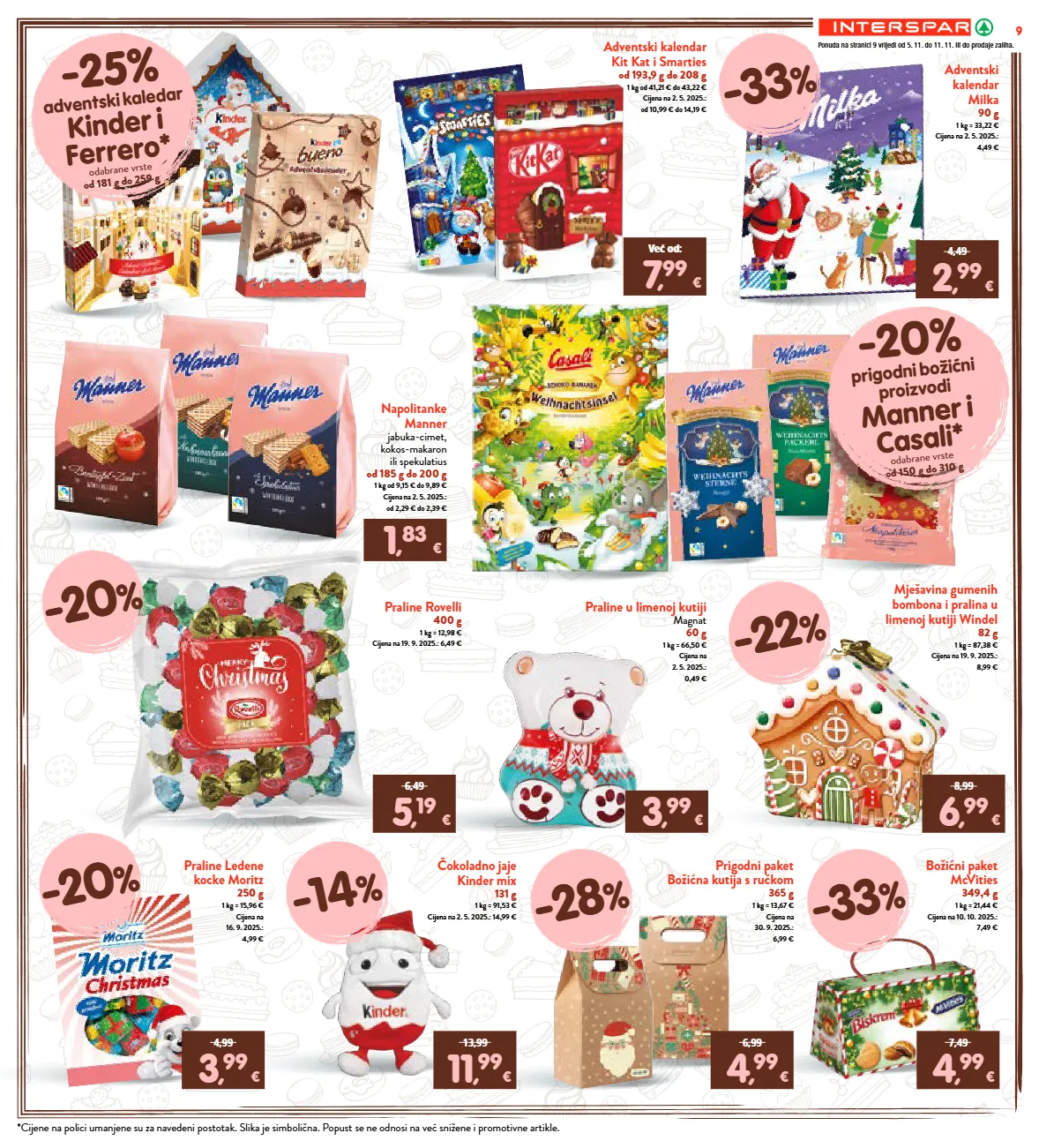 7 , 99   €  već od:  -20% prigodni božićni proizvodi manner i casali* odabrane vrste  od 150 g do 310 g  -25% adventski kaledar kinder i ferrero* odabrane vrste  od 181 g do 259 g  -14 % -28 % -33 % -33 % -20 % -20 % -22 % 11 , 99   €  13,99  4 , 99   €  6,99  4 , 99   €  7,49  2   , 99   €  4,49  5 , 19   €  6,49  3 , 99   €  4,99  6 , 99   €  8,99  napolitanke manner  jabuka-cimet, kokos-makaron ili spekulatius  od 185 g do 200 g  1 kg od 9,15 € do 9,89 € cijena na 2. 5. 2025.: od 2,29 € do 2,39 € čokoladno jaje kinder mix  131 g  1 kg = 91,53 € cijena na 2. 5. 2025.: 14,99 € mješavina gumenih bombona i pralina u limenoj kutiji windel  82 g  1 kg = 87,38 € cijena na 19. 9. 2025.: 8,99 € praline ledene kocke moritz  250 g  1 kg = 15,96 € cijena na 16. 9. 2025.: 4,99 € praline rovelli  400 g  1 kg = 12,98 € cijena na 19. 9. 2025.: 6,49 € praline u limenoj kutiji  magnat  60 g  1 kg = 66,50 € cijena na 2. 5. 2025.: 0,49 € adventski kalendar milka  90 g  1 kg = 33,22 € cijena na 2. 5. 2025.: 4,49 € adventski kalendar kit kat i smarties  od 193,9 g do 208 g  1 kg od 41,21 € do 43,22 € cijena na 2. 5. 2025.: od 10,99 € do 14,19 €  3 , 99   € 1 , 83   €  prigodni paket božićna kutija s ručkom  365 g  1 kg = 13,67 € cijena na 30. 9. 2025.: 6,99 € božićni paket mcvities  349,4 g  1 kg = 21,44 € cijena na 10. 10. 2025.: 7,49 €  ponuda na stranici 9 vrijedi od 5. 11. do 11. 11. ili do prodaje zaliha.  9  *cijene na polici umanjene su za navedeni postotak. slika je simbolična. popust se ne odnosi na već snižene i promotivne artikle.