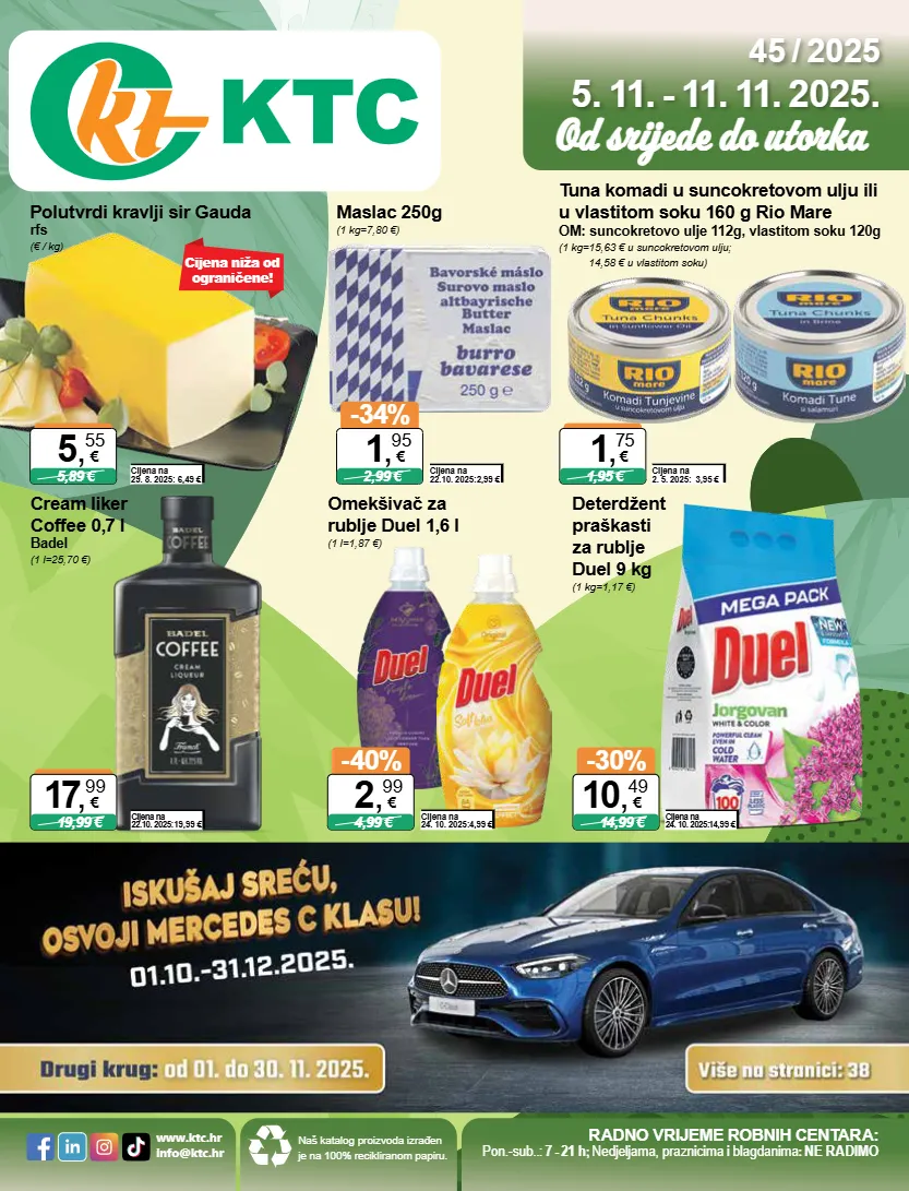 naš katalog proizvoda izrađen  je na 100% recikliranom papiru.  radno vrijeme robnih centara:  pon.-sub..:   7 - 21 h ;   nedjeljama, praznicima i blagdanima :   ne radimo  www.ktc.hr info@ktc.hr  45 / 2025 5. 11. - 11. 11. 2025.  od srijede do utorka  cijena na 2. 5. 2025: 3,95 € cijena na 22.10. 2025:19,99 € cijena na 29. 8. 2025: 6,49 € cijena na 22.10. 2025:2,99 € cijena na 24. 10. 2025:4,99 € cijena na 24. 10. 2025:14,99 €  cijena niža od ograničene!  tuna komadi u suncokretovom ulju ili u vlastitom soku 160 g rio mare om: suncokretovo ulje 112g, vlastitom soku 120g  (1 kg=15,63 € u suncokretovom ulju; 14,58 € u vlastitom soku)  1,95 €  1 , 75  € cream liker  coffee 0,7 l  badel  (1 l=25,70 €)  19,99 €  17 , 99  € polutvrdi kravlji sir gauda rfs  (€ / kg)  5,89 €  5 , 55  € maslac 250g  (1 kg=7,80 €)  -34%  2,99 €  1 , 95  €  omekšivač za  rublje duel 1,6 l  (1 l=1,87 €)  -40%  4,99 €  2 , 99  €  deterdžent  praškasti  za rublje  duel 9 kg  (1 kg=1,17 €)  -30%  14,99 €  10 , 49  €