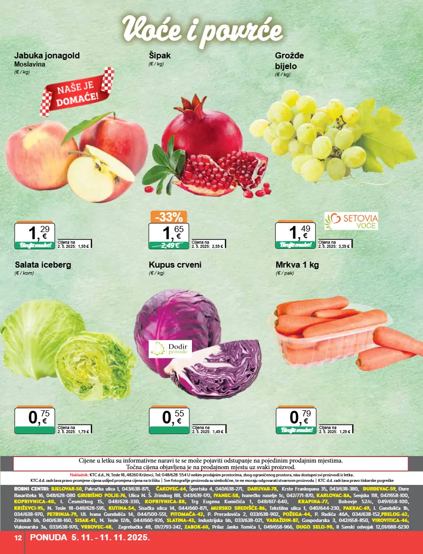 nakladnik: ktc d.d., n, tesle 18, 48260 križevci, tel: 048/628-554 u nekim prodajnim prostorima, zbog ograničenog prostora, nisu dostupni svi proizvodi iz letka . ktc d.d. zadržava pravo promjene cijena uslijed promjena cijena na tržištu   |   sve fotografije proizvoda su simbolične, te ne moraju odgovarati stvarnom proizvodu   |   ktc d.d. zadržava pravo tiskarske pogreške  robni centri: bjelovar-50 , pakračka ulica 1, 043/638-871,   čakovec-64 , športska 4, 040/638-271,   daruvar-78 ,   krste frankopana 35, 043/638-380,   đurđevac-59 , đure basaričeka 16, 048/628-080   grubišno polje-76 , ulica n. š. zrinskog bb, 043/639-170,   ivanec-58,   ivanečko naselje 1c, 042/771-870,   karlovac-8a,   senjska 118, 047/658-100,  koprivnica-40,   i.   česmičkog   15,   048/628-330,   koprivnica-88,   trg   eugena   kumičića   1,   048/617-640,   krapina-77,   bobovje   52/c,   049/658-100,  križevci-95,   n.   tesle   18–048/628-595,   kutina-54,   sisačka   ulica   14,   044/660-871,   mursko   središće-86,   tekstilna   ulica   1,   040/644-230,   pakrac-69,   i.   gundulića   1b, 034/638-970,   petrinja-79,   ul.   ivana   gundulića   14,   044/500-551,   pitomača-42,   p.   preradovića   2,   033/638-902,   požega-44,   p.   radića   46a,   034/638-152, prelog-62,  zrinskih   bb,   040/638-160,   sisak-41,   n.   tesle   12/b,   044/660-926,   slatina-43,   industrijska   bb,   033/638-021,   varaždin-87,   gospodarska   3,   042/658-850,   virovitica-46,  vukovarska 3a, 033/638-970,   vrbovec-48,   zagrebačka 48, 01/2793-242,   zabok-60,   prilaz janka tomića 1, 049/658-966,   dugo selo-90,   ii savski odvojak 12,01/688-6230  cijene u letku su informativne naravi te se može pojaviti odstupanje na pojedinim prodajnim mjestima. točna cijena objavljena je na prodajnom mjestu uz svaki proizvod.  cijena na 2. 5. 2025: 1,59 € cijena na 2. 5. 2025: 2,59 € cijena na 2. 5. 2025: 1,79 € cijena na 2. 5. 2025: 1,49 € cijena na 2. 5. 2025: 3,39 € cijena na 2. 5. 2025: 1,29 €  jabuka jonagold moslavina  (€ / kg)  birajte mudro!  1 , 29  € šipak  (€ / kg)  -33%  2,49 €  1 , 65  €  salata iceberg  (€ / kom)  0 , 75  €  kupus crveni  (€ / kg)  0 , 55  €  grožđe  bijelo  (€ / kg)  birajte mudro!  1 , 49  € mrkva 1 kg  (€ / pak)  birajte mudro!  0 , 79  € ponuda 5. 11. - 11. 11. 2025.  12  voće i povrće