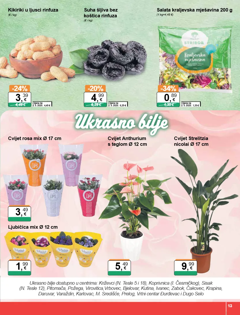 ukrasno bilje dostupno u centrima: križevci (n. tesle 5 i 18), koprivnica (i. česmičkog), sisak  (n. tesle 12), pitomača, požega, virovitica,vrbovec, bjelovar, kutina, ivanec, zabok, čakovec, krapina, daruvar, varaždin, karlovac, m. središće, prelog, vrtni centar đurđevac i dugo selo  cijena na 2. 5. 2025: 4,49 € cijena na 2. 5. 2025: 6,29 € cijena na 2. 5. 2025: 1,35 €  kikiriki u ljusci rinfuza  (€ / kg)  -24%  4,49 €  3 , 39  €  suha šljiva bez koštica rinfuza  (€ / kg)  -20%  6,29 €  4 , 99  €  salata kraljevska mješavina 200 g  (1 kg=4,45 €)  -34%  1,35 €  0 , 89  € cvijet rosa mix ø 17 cm 3 , 49  € cvijet anthurium s teglom ø 12 cm 5 , 49  €  cvijet strelitzia  nicolai ø 17 cm 9 , 99  €  ljubičica mix ø 12 cm  1 , 99  € 13  ukrasno bilje