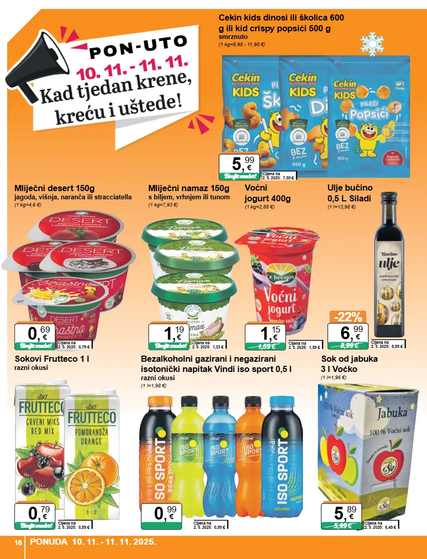 cijena na 2. 5. 2025: 7,59 € cijena na 2. 5. 2025: 1,33 € cijena na 2. 5. 2025: 0,79 €   cijena na 2. 5. 2025: 1,59 € cijena na 2. 5. 2025: 8,99 € cijena na 2. 5. 2025: 0,99 € cijena na 2. 5. 2025: 0,99 € cijena na 2. 5. 2025: 6,49 €  10. 11. - 11. 11.  p on - uto  cekin kids dinosi ili školica 600  g ili kid crispy popsići 500 g smrznuto  (1 kg=9,98 - 11,98 €)  birajte mudro!  5 , 99  €  mliječni namaz 150g  s biljem, vrhnjem ili tunom  (1 kg=7,93 €)  birajte mudro!  1 , 19  €  mliječni desert 150g jagoda, višnja, naranča ili stracciatella  (1 kg=4,6 €)  birajte mudro!  0 , 69  €  voćni  jogurt 400g  (1 kg=2,88 €)  1,59 €  1 , 15  €  ulje bučino 0,5 l siladi  (1 l=13,98 €)  -22%  8,99 €  6 , 99  €  sokovi frutteco 1 l razni okusi  birajte mudro!  0 , 79  €  bezalkoholni gazirani i negazirani isotonički napitak vindi iso sport 0,5 l razni okusi  (1 l=1,98 €)  0 , 99  €  sok od jabuka 3 l voćko  (1 l=1,96 €)  5,99 €  5 , 89  € 16   ponuda 10. 11. - 11. 11. 2025.
