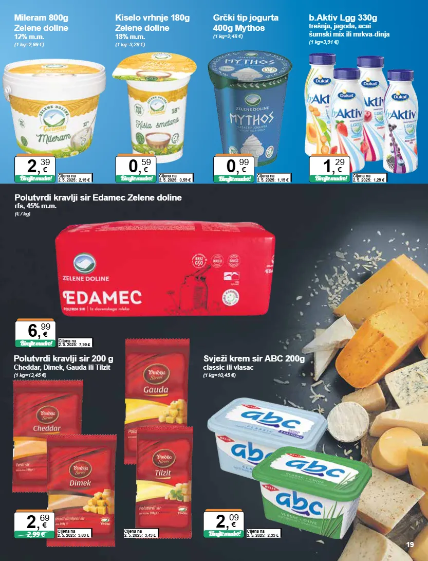 cijena na 2. 5. 2025: 1,29 € cijena na 2. 5. 2025: 3,89 € cijena na 2. 5. 2025: 3,49 € cijena na 2. 5. 2025: 7,99 € cijena na 2. 5. 2025: 2,19 € cijena na 2. 5. 2025: 0,59 € cijena na 2. 5. 2025: 1,19 € cijena na 2. 5. 2025: 2,39 € b.aktiv lgg 330g trešnja, jagoda, acai- šumski mix ili mrkva-dinja  (1 kg=3,91 €)  birajte mudro!  1 , 29  € polutvrdi kravlji sir 200 g  cheddar, dimek, gauda ili tilzit  (1 kg=13,45 €)  2,99 €  2 , 69  € polutvrdi kravlji sir edamec zelene doline rfs, 45% m.m.  (€ / kg)  birajte mudro!  6 , 99  € mileram 800g zelene doline 12% m.m.  (1 kg=2,99 €)  birajte mudro!  2 , 39  €  kiselo vrhnje 180g  zelene doline 18% m.m.  (1 kg=3,28 €)  birajte mudro!  0 , 59  €  grčki tip jogurta  400g mythos  (1 kg=2,48 €)  birajte mudro!  0 , 99  €  svježi krem sir abc 200g  classic ili vlasac  (1 kg=10,45 €)  birajte mudro!  2 , 09  € 19