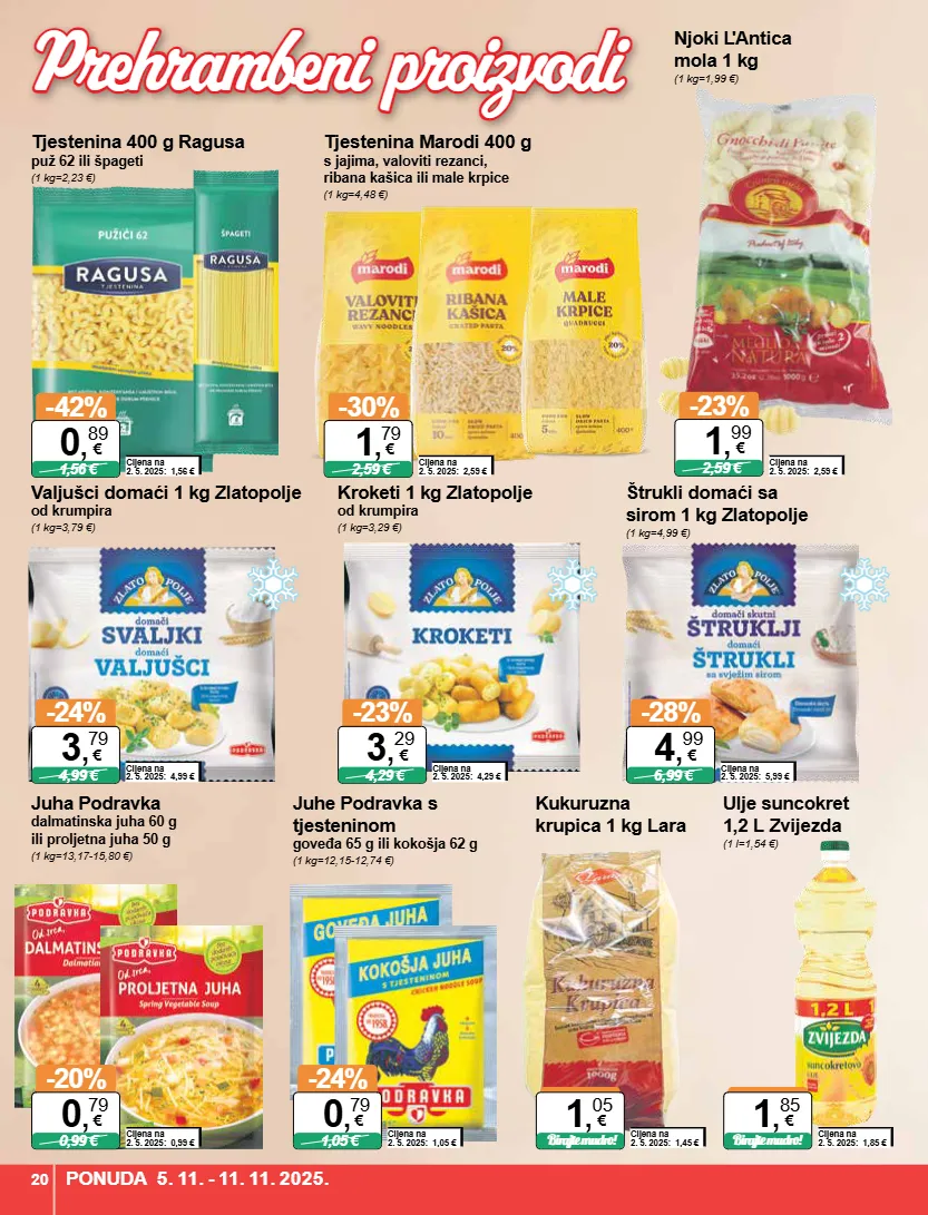 cijena na 2. 5. 2025: 1,56 € cijena na 2. 5. 2025: 2,59 € cijena na 2. 5. 2025: 1,85 € cijena na 2. 5. 2025: 2,59 € cijena na 2. 5. 2025: 4,99 € cijena na 2. 5. 2025: 4,29 € cijena na 2. 5. 2025: 5,99 € cijena na 2. 5. 2025: 0,99 € cijena na 2. 5. 2025: 1,05 € cijena na 2. 5. 2025: 1,45 €  tjestenina 400 g ragusa  puž 62 ili špageti  (1 kg=2,23 €)  -42%  1,56 €  0 , 89  € tjestenina marodi 400 g  s jajima, valoviti rezanci,  ribana kašica ili male krpice  (1 kg=4,48 €)  -30%  2,59 €  1 , 79  € ulje suncokret  1,2 l zvijezda  (1 l=1,54 €)  birajte mudro!  1 , 85  € njoki l'antica mola 1 kg  (1 kg=1,99 €)  -23%  2,59 €  1 , 99  €  valjušci domaći 1 kg zlatopolje  od krumpira  (1 kg=3,79 €)  -24%  4,99 €  3 , 79  €  kroketi 1 kg zlatopolje  od krumpira  (1 kg=3,29 €)  -23%  4,29 €  3 , 29  €  štrukli domaći sa  sirom 1 kg zlatopolje  (1 kg=4,99 €)  -28%  6,99 €  4 , 99  € juha podravka dalmatinska juha 60 g ili proljetna juha 50 g  (1 kg=13,17-15,80 €)  -20%  0,99 €  0 , 79  € juhe podravka s tjesteninom  goveđa 65 g ili kokošja 62 g  (1 kg=12,15-12,74 €)  -24%  1,05 €  0 , 79  €  kukuruzna  krupica 1 kg lara  birajte mudro!  1 , 05  € ponuda 5. 11. - 11. 11. 2025.  20  prehrambeni proizvodi prehrambeni proizvodi