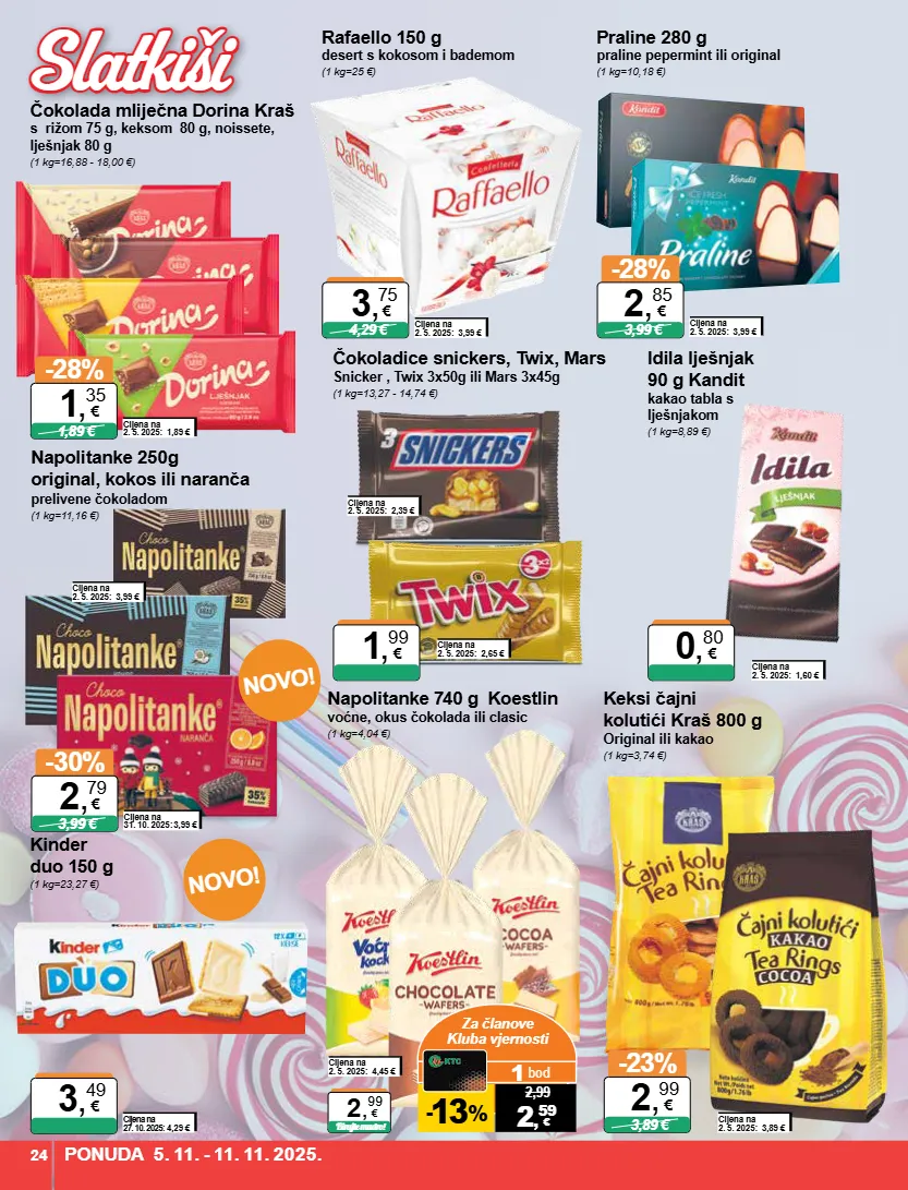 cijena na 2. 5. 2025: 1,89 € cijena na 2. 5. 2025: 3,89 € cijena na 31. 10. 2025: 3,99 € cijena na 2. 5. 2025: 3,99 € cijena na 2. 5. 2025: 3,99 € cijena na 27. 10. 2025: 4,29 € cijena na 2. 5. 2025: 3,99 € cijena na 2. 5. 2025: 1,60 € cijena na 2. 5. 2025: 4,45 € cijena na 2. 5. 2025: 2,39 € cijena na 2. 5. 2025: 2,65 €  čokolada mliječna dorina kraš s rižom 75 g, keksom 80 g, noissete,  lješnjak 80 g  (1 kg=16,88 - 18,00 €)  -28%  1,89 €  1 , 35  €  keksi čajni kolutići kraš 800 g  original ili kakao  (1 kg=3,74 €)  -23%  3,89 €  2 , 99  € novo! novo! napolitanke 250g  original, kokos ili naranča prelivene čokoladom  (1 kg=11,16 €)  -30%  3,99 €  2 , 79  € rafaello 150 g desert s kokosom i bademom  (1 kg=25 €)  4,29 €  3 , 75  €  kinder  duo 150 g  (1 kg=23,27 €)  3 , 49  € praline 280 g praline pepermint ili original  (1 kg=10,18 €)  -28%  3,99 €  2 , 85  € idila lješnjak  90 g kandit  kakao tabla s lješnjakom  (1 kg=8,89 €)  0 , 80  €  napolitanke 740 g koestlin voćne, okus čokolada ili clasic  (1 kg=4,04 €)  birajte mudro!  2 , 99  €  čokoladice snickers, twix, mars snicker , twix 3x50g ili mars 3x45g  (1 kg=13,27 - 14,74 €)  1 , 99  € 2,99  2 , 59 - 13 %  1   bod  €  za članove kluba vjernosti ponuda 5. 11. - 11. 11. 2025.  24  slatkiši slatkiši