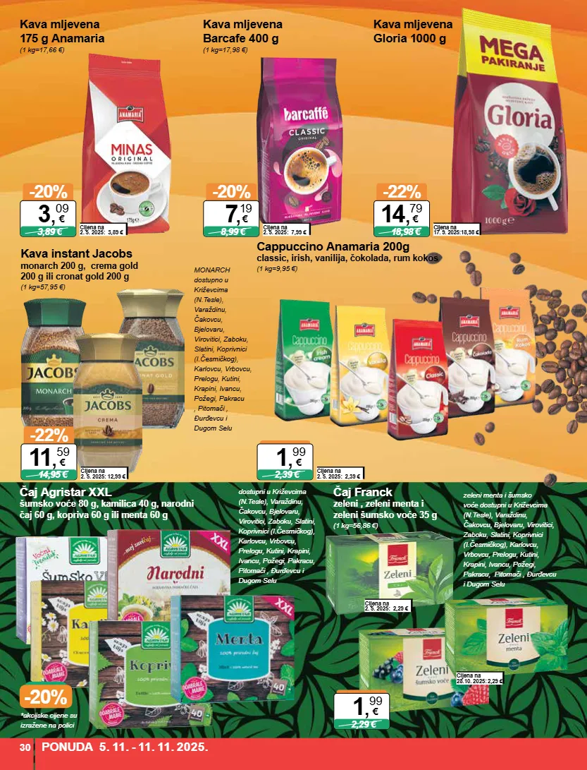 monarch  dostupno u  križevcima (n.tesle), varaždinu, čakovcu, bjelovaru, virovitici, zaboku,  slatini, koprivnici  (i.česmičkog), karlovcu, vrbovcu,  prelogu, kutini, krapini, ivancu,  požegi, pakracu , pitomači , đurđevcu i  dugom selu  cijena na 2. 5. 2025: 3,89 € cijena na 2. 5. 2025: 7,99 € cijena na 17. 9. 2025:18,98 € cijena na 2. 5. 2025: 12,99 € cijena na 2. 5. 2025: 2,39 € cijena na 2. 5. 2025: 2,29 € cijena na 28.10. 2025: 2,29 €  *akcijske cijene su  izražene na polici  -20%  kava mljevena  175 g anamaria  (1 kg=17,66 €)  -20%  3,89 €  3 , 09  €  kava mljevena  barcafe 400 g  (1 kg=17,98 €)  -20%  8,99 €  7 , 19  €  kava mljevena  gloria 1000 g -22%  18,98 €  14 , 79  €  kava instant jacobs  monarch 200 g, crema gold 200 g ili cronat gold 200 g  (1 kg=57,95 €)  -22%  14,95 €  11 , 59  € cappuccino anamaria 200g  classic, irish, vanilija, čokolada, rum kokos  (1 kg=9,95 €)  2,39 €  1 , 99  €  čaj franck zeleni , zeleni menta i zeleni šumsko voće 35 g  (1 kg=56,86 €)  2,29 €  1 , 99  €  zeleni menta i šumsko voće dostupni u križevcima (n.tesle), varaždinu, čakovcu, bjelovaru, virovitici, zaboku, slatini, koprivnici (i.česmičkog), karlovcu, vrbovcu, prelogu, kutini, krapini, ivancu, požegi, pakracu, pitomači , đurđevcu  i dugom selu  čaj agristar xxl šumsko voće 80 g, kamilica 40 g, narodni čaj 60 g, kopriva 60 g ili menta 60 g  dostupni u križevcima (n.tesle), varaždinu, čakovcu, bjelovaru, virovitici, zaboku, slatini, koprivnici (i.česmičkog), karlovcu, vrbovcu,  prelogu, kutini, krapini,  ivancu, požegi, pakracu, pitomači , đurđevcu i  dugom selu ponuda 5. 11. - 11. 11. 2025.  30