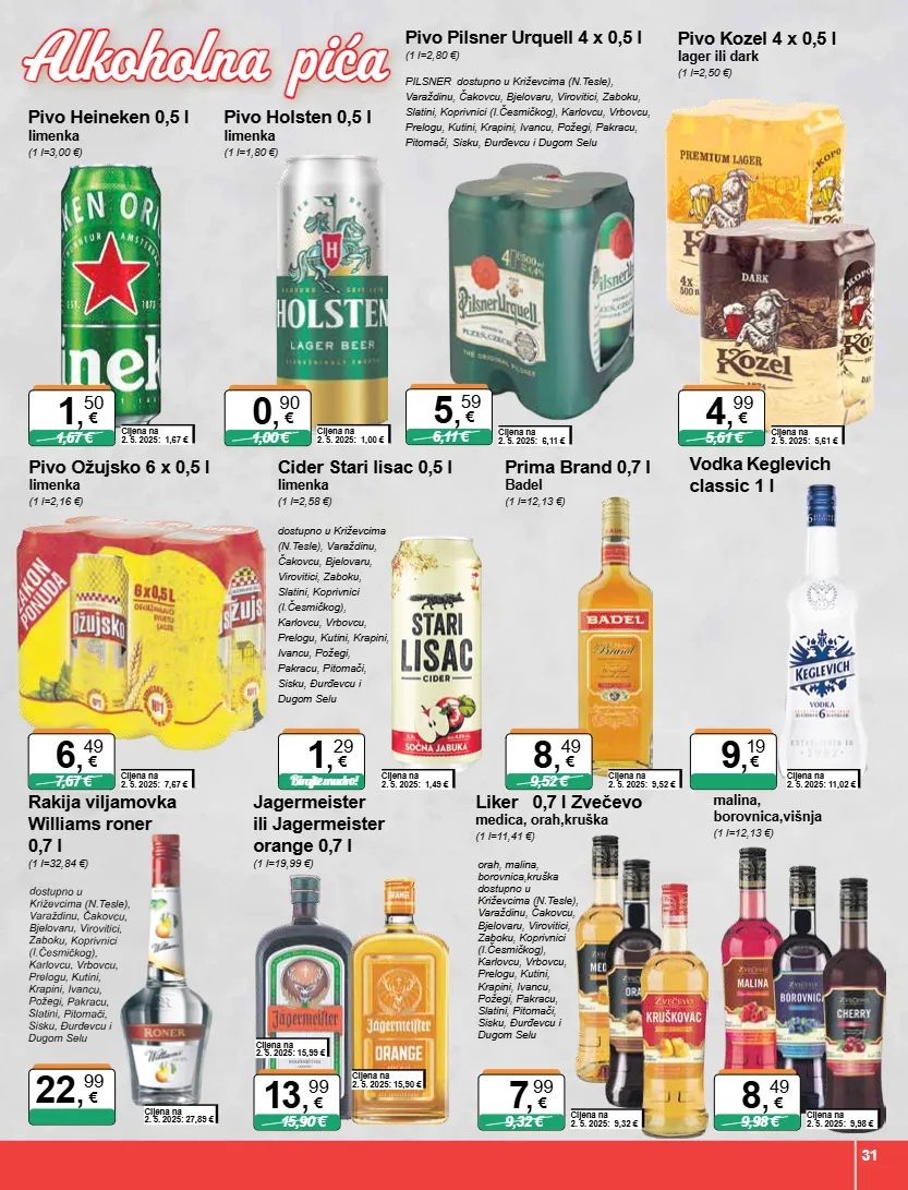 dostupno u križevcima (n.tesle), varaždinu, čakovcu, bjelovaru, virovitici, zaboku,  slatini, koprivnici  (i.česmičkog), karlovcu, vrbovcu,  prelogu, kutini, krapini,  ivancu, požegi, pakracu, pitomači, sisku, đurđevcu i  dugom selu  pilsner dostupno u križevcima (n.tesle), varaždinu, čakovcu, bjelovaru, virovitici, zaboku, slatini, koprivnici (i.česmičkog), karlovcu, vrbovcu, prelogu, kutini, krapini, ivancu, požegi, pakracu, pitomači, sisku, đurđevcu i dugom selu  cijena na 2. 5. 2025: 1,67 € cijena na 2. 5. 2025: 1,49 € cijena na 2. 5. 2025: 1,00 €   cijena na 2. 5. 2025: 5,61 € cijena na 2. 5. 2025: 6,11 € cijena na 2. 5. 2025: 7,67 € cijena na 2. 5. 2025: 15,99 € cijena na 2. 5. 2025: 15,90 € cijena na 2. 5. 2025: 27,89 € cijena na 2. 5. 2025: 9,52 € cijena na 2. 5. 2025: 11,02 € cijena na 2. 5. 2025: 9,32 € cijena na 2. 5. 2025: 9,98 €  pivo heineken 0,5 l limenka  (1 l=3,00 €)  1,67 €  1 , 50  €  cider stari lisac 0,5 l  limenka  (1 l=2,58 €)  birajte mudro!  1 , 29  € pivo holsten 0,5 l limenka  (1 l=1,80 €)  1,00 €  0 , 90  €  pivo kozel 4 x 0,5 l  lager ili dark  (1 l=2,50 €)  5,61 €  4 , 99  € pivo pilsner urquell 4 x 0,5 l  (1 l=2,80 €)  6,11 €  5 , 59  €  pivo ožujsko 6 x 0,5 l  limenka  (1 l=2,16 €)  7,67 €  6 , 49  € jagermeister ili jagermeister orange 0,7 l  (1 l=19,99 €)  15,90 €  13 , 99  € rakija viljamovka williams roner 0,7 l  (1 l=32,84 €)  22 , 99  € prima brand 0,7 l badel  (1 l=12,13 €)  8 , 49  €  vodka keglevich  classic 1 l 9 , 19  €  liker   0,7 l zvečevo  medica, orah,kruška  (1 l=11,41 €)  9,32 €  7 , 99  €  dostupno u  križevcima (n.tesle), varaždinu, čakovcu, bjelovaru, virovitici, zaboku, koprivnici (i.česmičkog), karlovcu, vrbovcu,  prelogu, kutini, krapini, ivancu,  požegi, pakracu, slatini, pitomači, sisku, đurđevcu i  dugom selu orah, malina,  borovnica,kruška  dostupno u  križevcima (n.tesle), varaždinu, čakovcu, bjelovaru, virovitici, zaboku, koprivnici (i.česmičkog), karlovcu, vrbovcu,  prelogu, kutini, krapini, ivancu,  požegi, pakracu, slatini, pitomači, sisku, đurđevcu i  dugom selu  malina, borovnica,višnja  (1 l=12,13 €)  9,98 €  8 , 49  €  9,52 €  31  alkoholna pića alkoholna pića