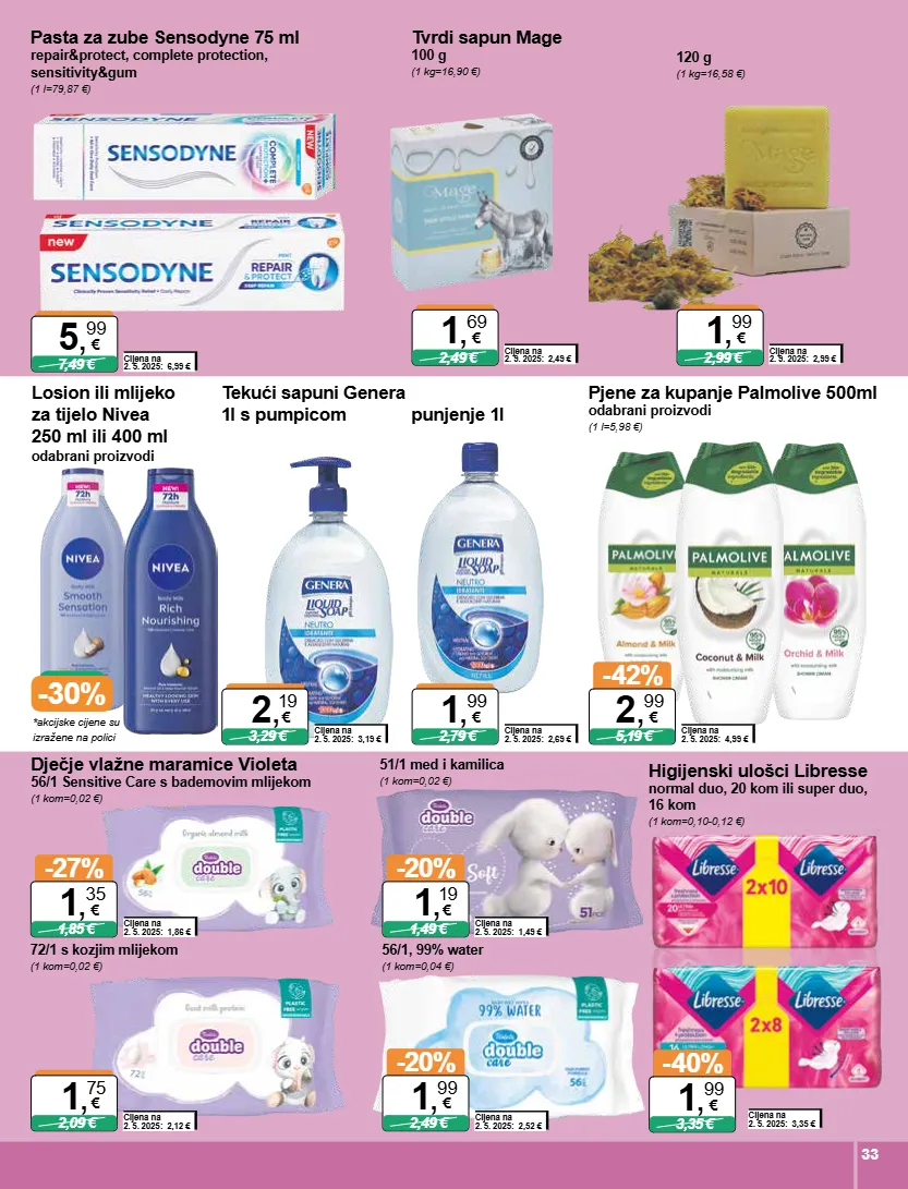cijena na 2. 5. 2025: 3,19 € cijena na 2. 5. 2025: 2,69 € cijena na 2. 5. 2025: 6,99 €  *akcijske cijene su  izražene na polici  -30% cijena na 2. 9. 2025: 2,49 € cijena na 2. 9. 2025: 2,99 € cijena na 2. 5. 2025: 4,99 € cijena na 2. 5. 2025: 1,86 € cijena na 2. 5. 2025: 2,52 € cijena na 2. 5. 2025: 2,12 € cijena na 2. 5. 2025: 1,49 € cijena na 2. 5. 2025: 3,35 €  tekući sapuni genera  1l s pumpicom  3,29 €  2 , 19  € punjenje 1l  2,79 €  1 , 99  €  pasta za zube sensodyne 75 ml  repair&protect, complete protection, sensitivity&gum  (1 l=79,87 €)  7,49 €  5 , 99  € losion ili mlijeko  za tijelo nivea  250 ml ili 400 ml  odabrani proizvodi  tvrdi sapun mage 100 g  (1 kg=16,90 €)  2,49 €  1 , 69  € 120 g  (1 kg=16,58 €)  2,99 €  1 , 99  €  pjene za kupanje palmolive 500ml odabrani proizvodi  (1 l=5,98 €)  -42%  5,19 €  2 , 99  €  dječje vlažne maramice violeta 56/1 sensitive care s bademovim mlijekom  (1 kom=0,02 €)  -27%  1,85 €  1 , 35  € 56/1, 99% water  (1 kom=0,04 €)  -20%  2,49 €  1 , 99  €  72/1 s kozjim mlijekom  (1 kom=0,02 €)  2,09 €  1 , 75  € 51/1 med i kamilica  (1 kom=0,02 €)  -20%  1,49 €  1 , 19  € higijenski ulošci libresse normal duo, 20 kom ili super duo, 16 kom  (1 kom=0,10-0,12 €)  -40%  3,35 €  1 , 99  € 33